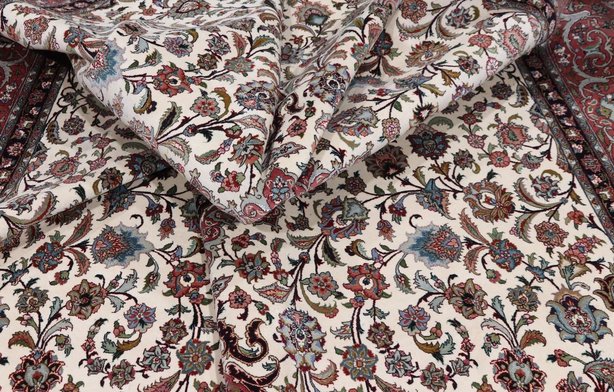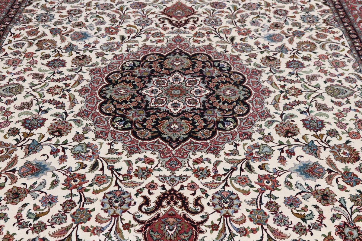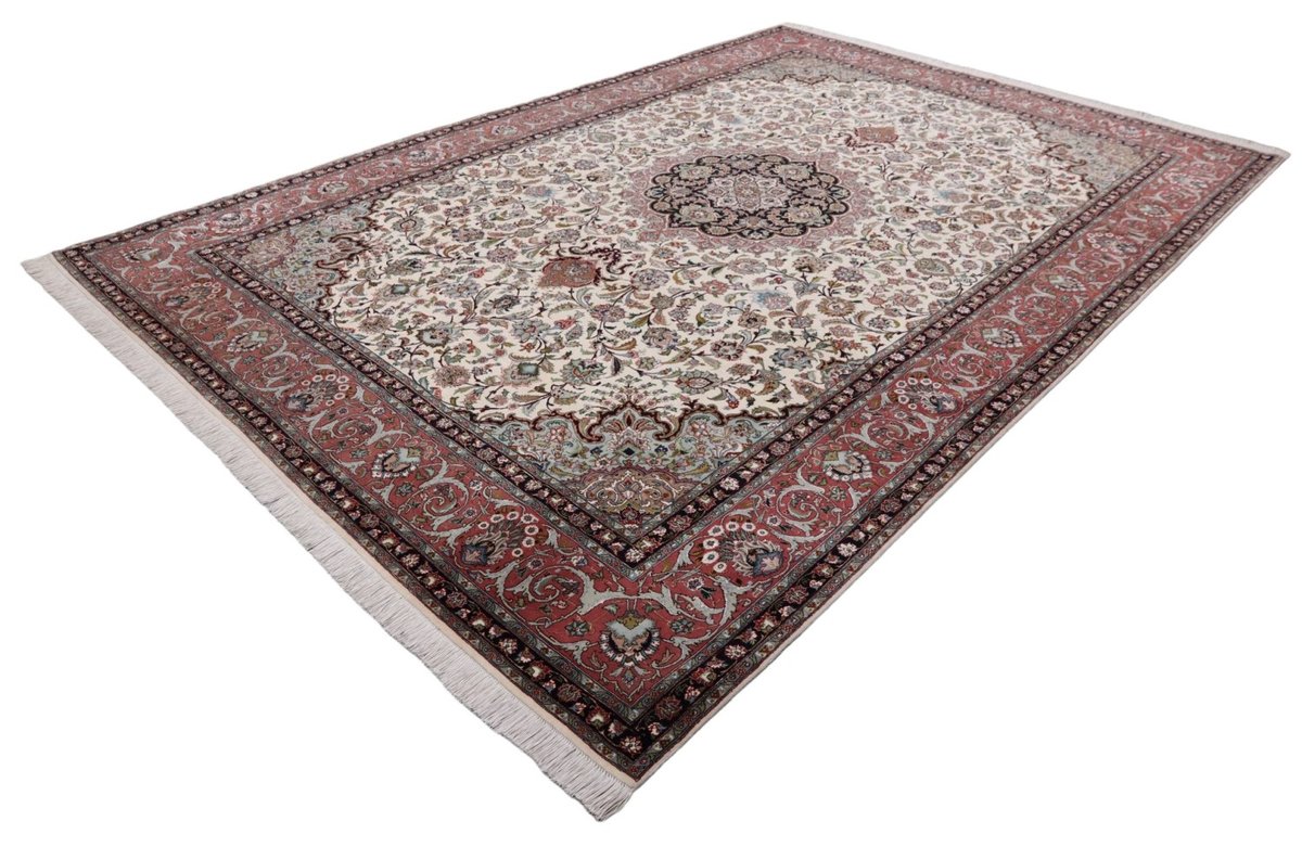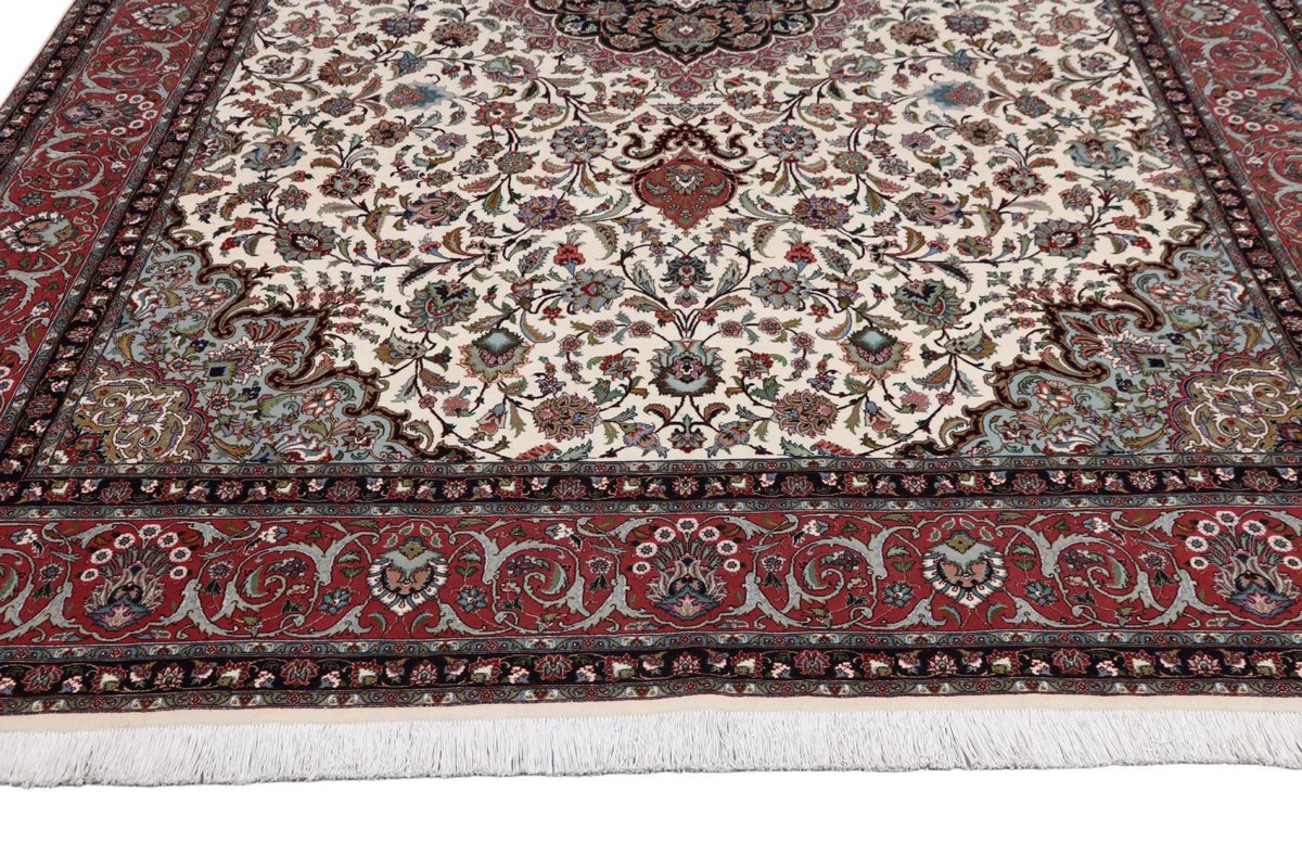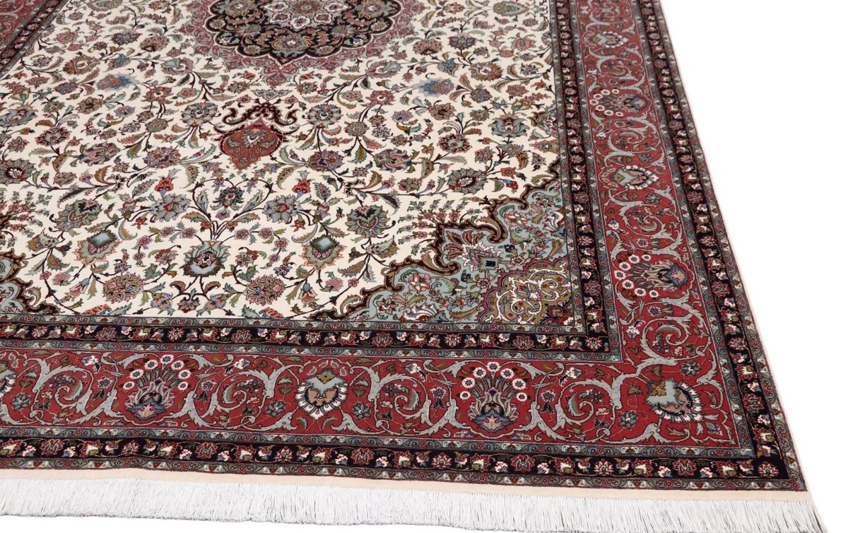 Für die besondere Eleganz des Täbriz-Flors sorgen hervorragende Materialien wie samtig anmutende Korkwolle und glänzende Seidenfäden. Die Knüpfqualität eines Täbriz-Teppichs lässt sich aus der angegebenen Raj-Zahl erschließen – je höher diese ausfällt, umso feiner ist die Knüpfdichte, die eine Million und mehr Knoten pro Quadratmeter erreichen kann. Bei besonders feingeknüpften Qualitäten kommt für die Kette statt des üblichen Baumwollgarns sogar Seide zum Einsatz.