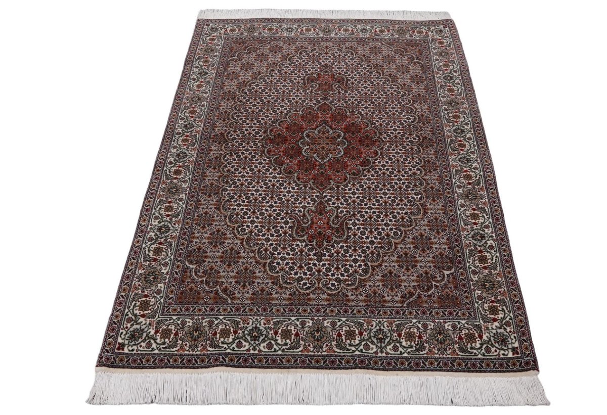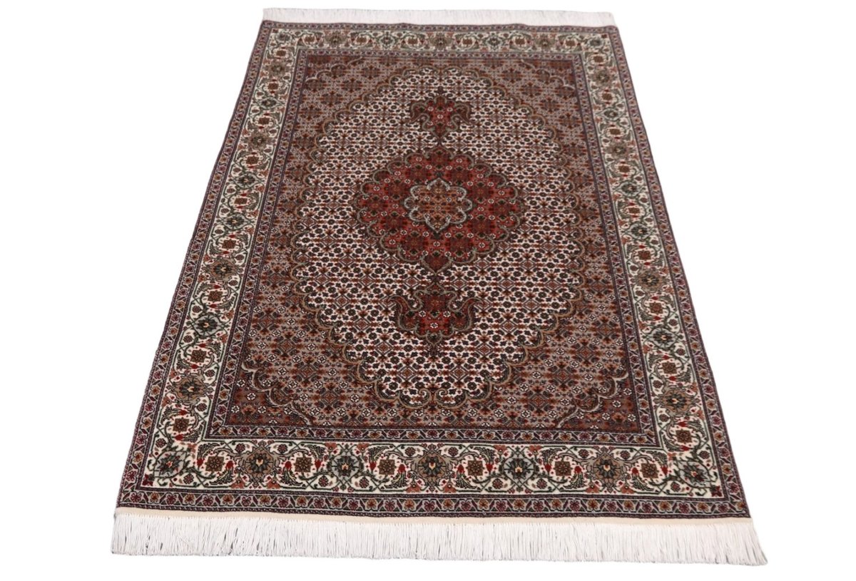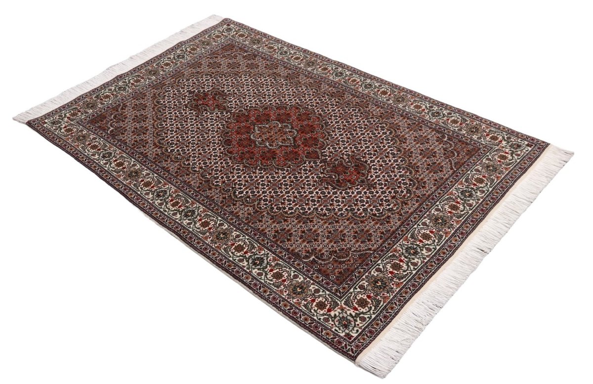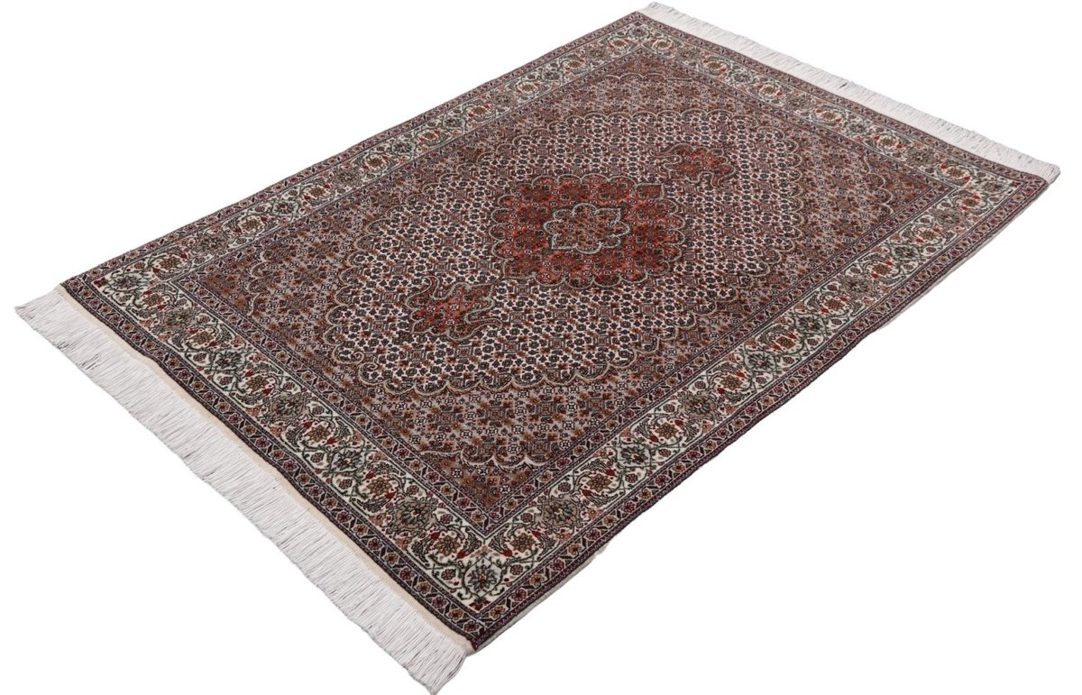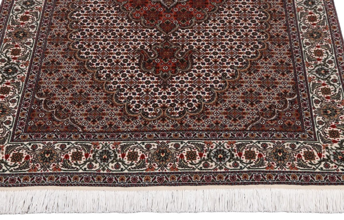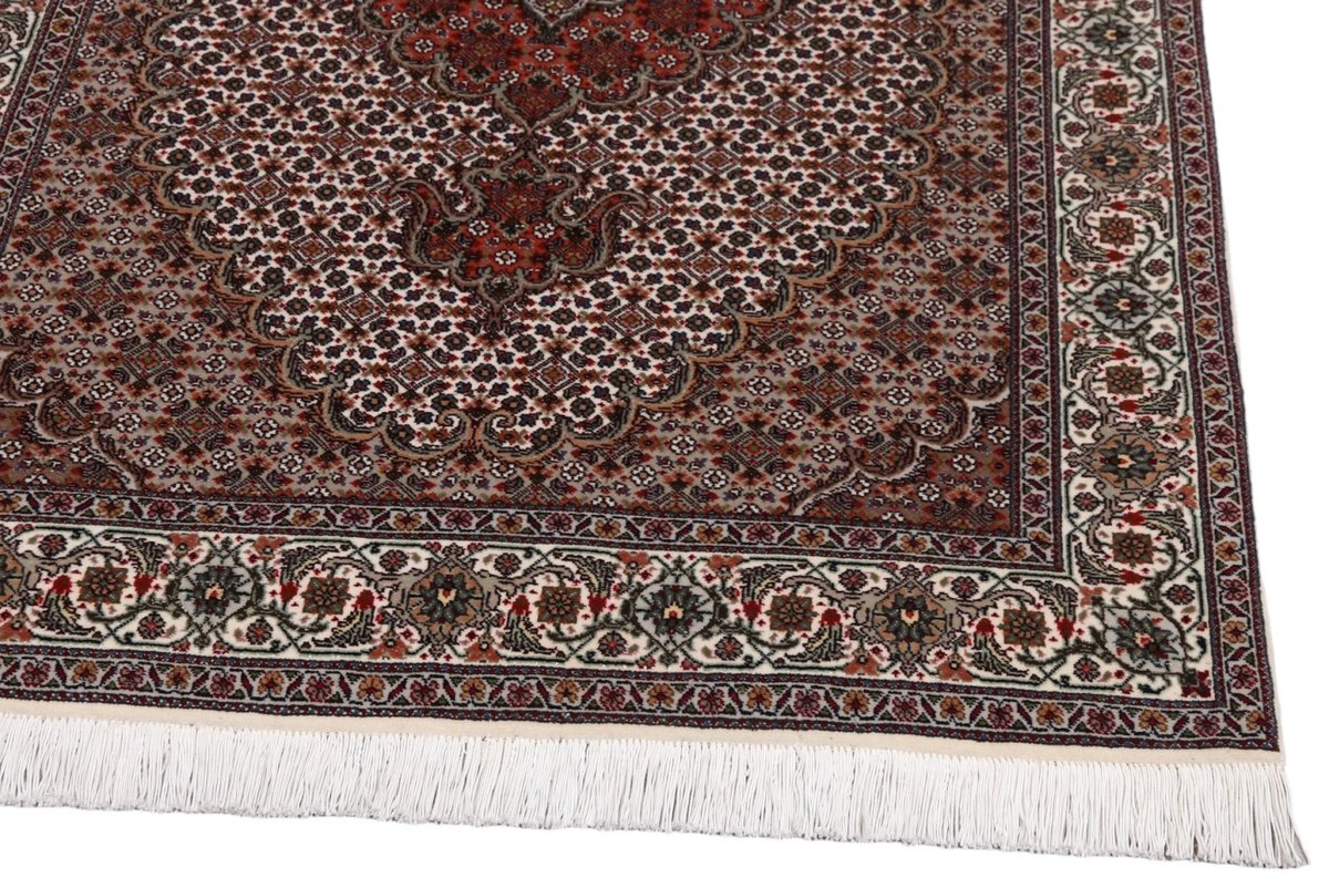 Für die besondere Eleganz des Täbriz-Flors sorgen hervorragende Materialien wie samtig anmutende Korkwolle und glänzende Seidenfäden. Die Knüpfqualität eines Täbriz-Teppichs lässt sich aus der angegebenen Raj-Zahl erschließen – je höher diese ausfällt, umso feiner ist die Knüpfdichte, die eine Million und mehr Knoten pro Quadratmeter erreichen kann. Bei besonders feingeknüpften Qualitäten kommt für die Kette statt des üblichen Baumwollgarns sogar Seide zum Einsatz.