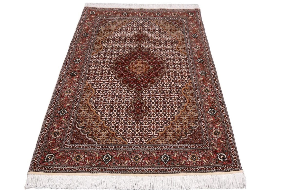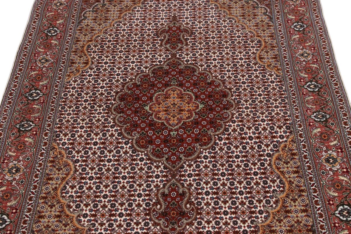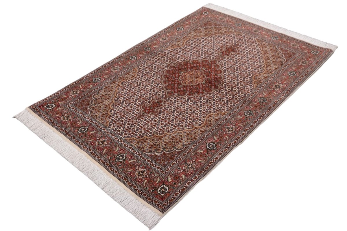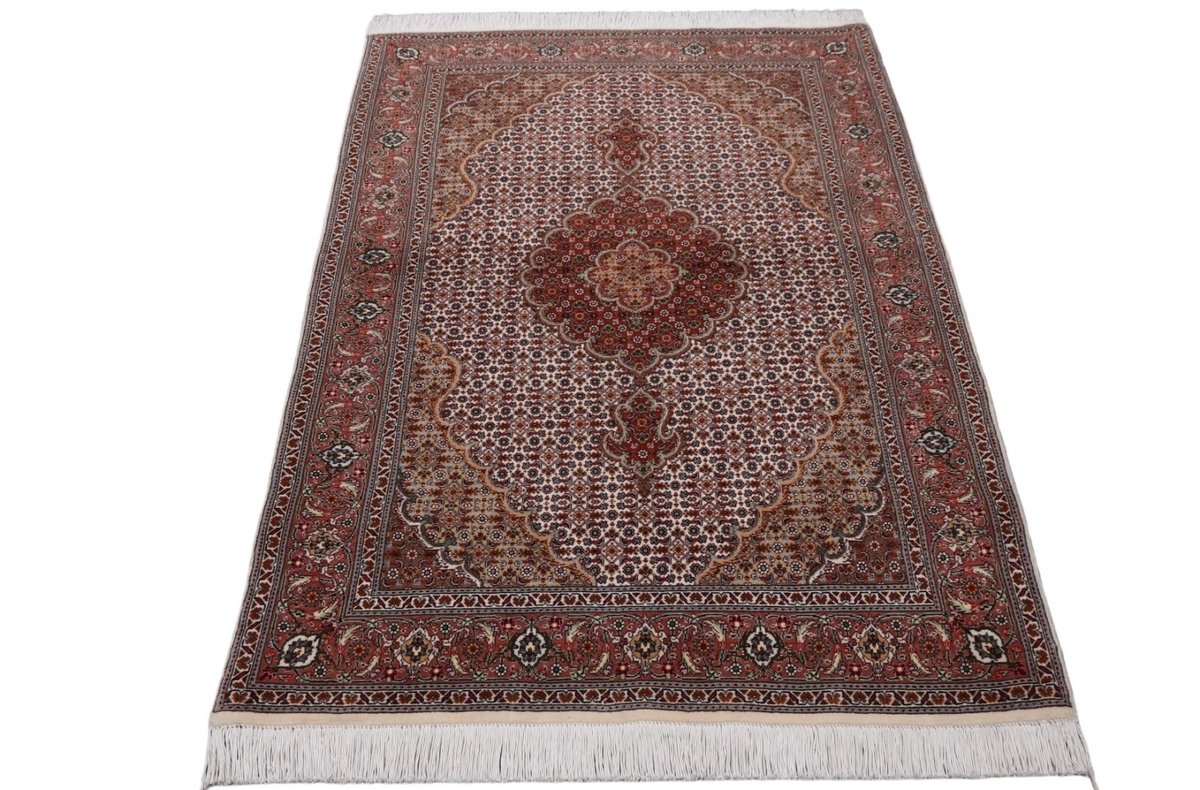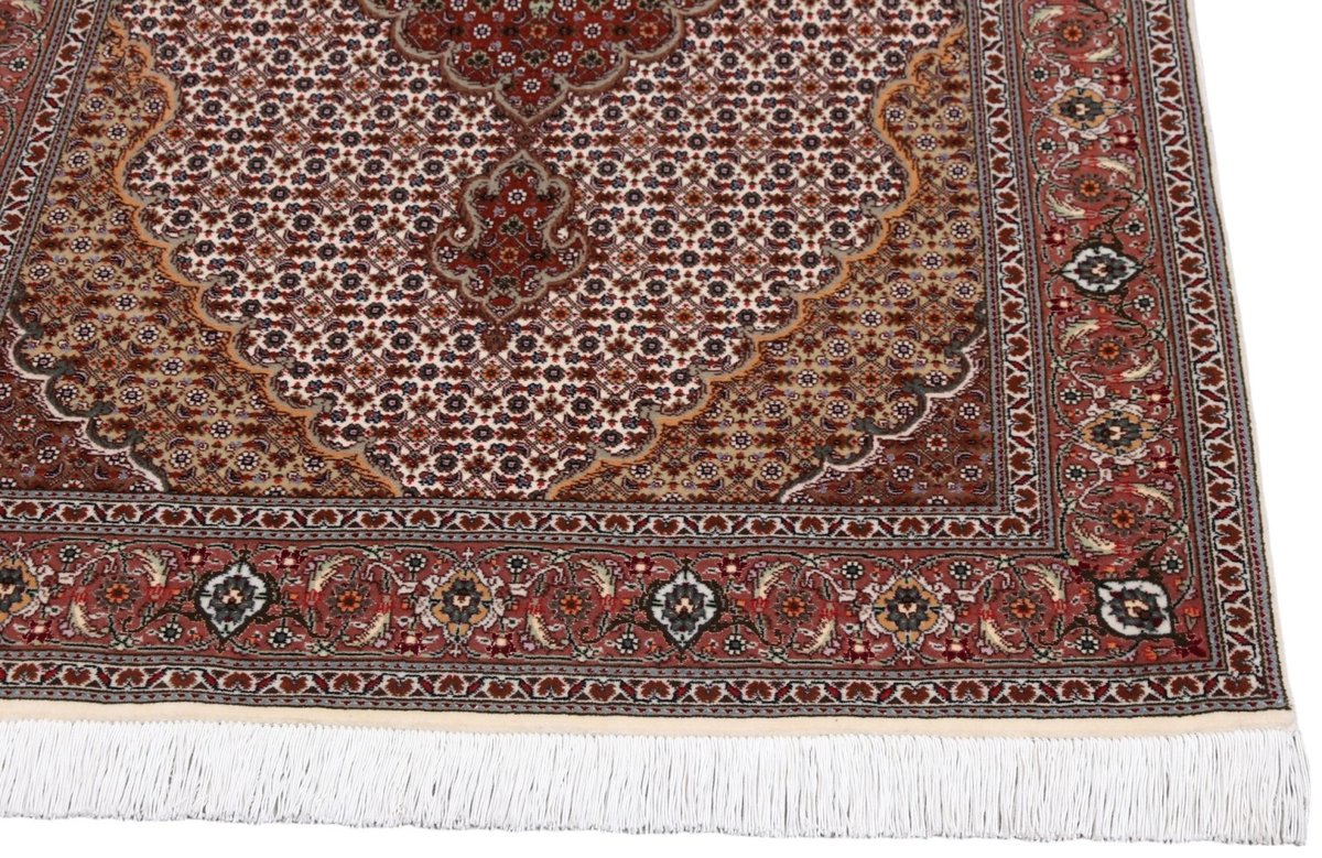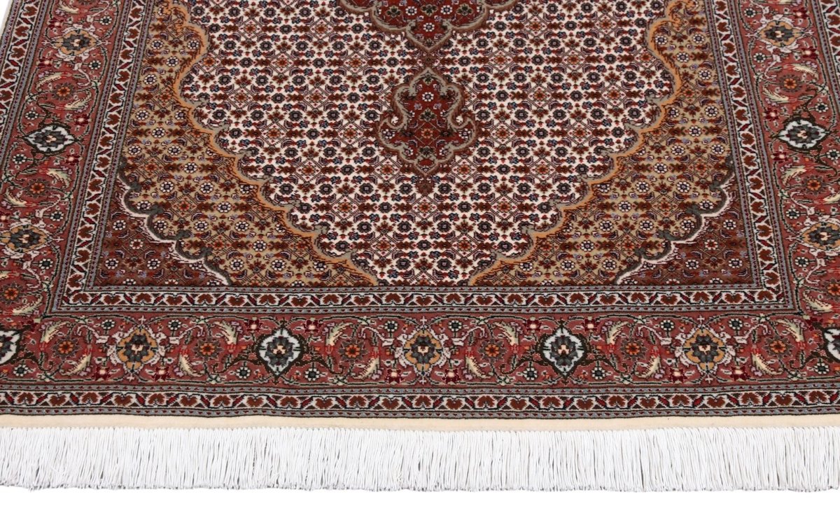 Für die besondere Eleganz des Täbriz-Flors sorgen hervorragende Materialien wie samtig anmutende Korkwolle und glänzende Seidenfäden. Die Knüpfqualität eines Täbriz-Teppichs lässt sich aus der angegebenen Raj-Zahl erschließen – je höher diese ausfällt, umso feiner ist die Knüpfdichte, die eine Million und mehr Knoten pro Quadratmeter erreichen kann. Bei besonders feingeknüpften Qualitäten kommt für die Kette statt des üblichen Baumwollgarns sogar Seide zum Einsatz.