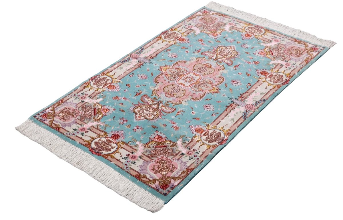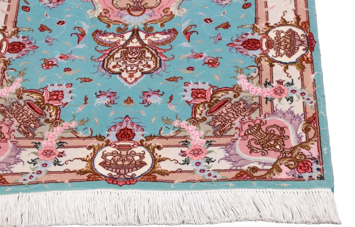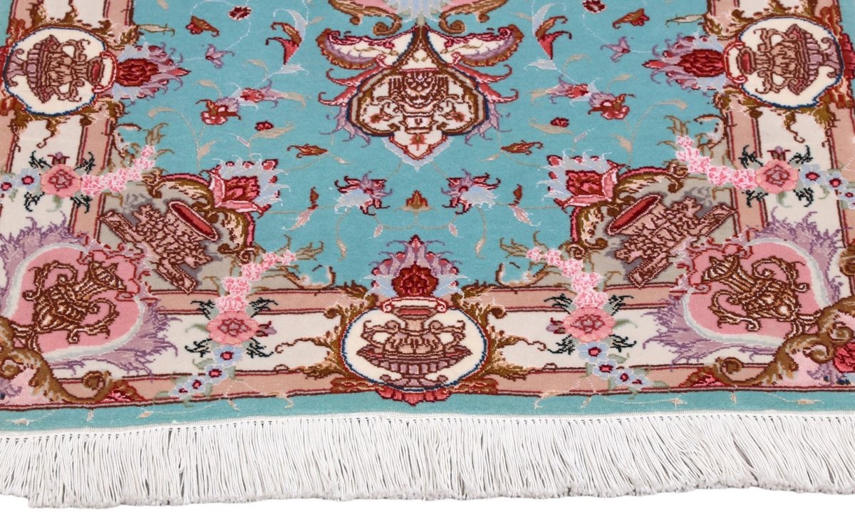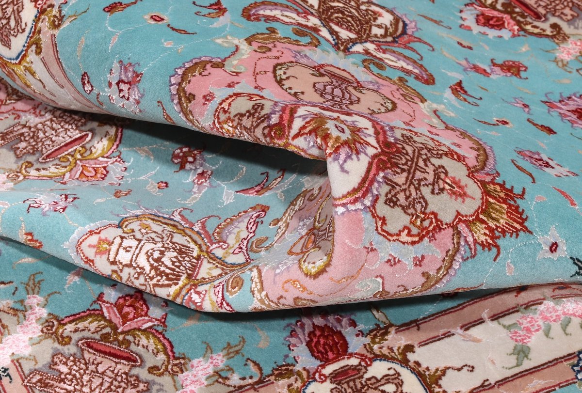 Für die besondere Eleganz des Täbriz-Flors sorgen hervorragende Materialien wie samtig anmutende Korkwolle und glänzende Seidenfäden. Die Knüpfqualität eines Täbriz-Teppichs lässt sich aus der angegebenen Raj-Zahl erschließen – je höher diese ausfällt, umso feiner ist die Knüpfdichte, die eine Million und mehr Knoten pro Quadratmeter erreichen kann. Bei besonders feingeknüpften Qualitäten kommt für die Kette statt des üblichen Baumwollgarns sogar Seide zum Einsatz.