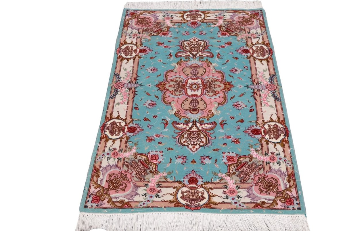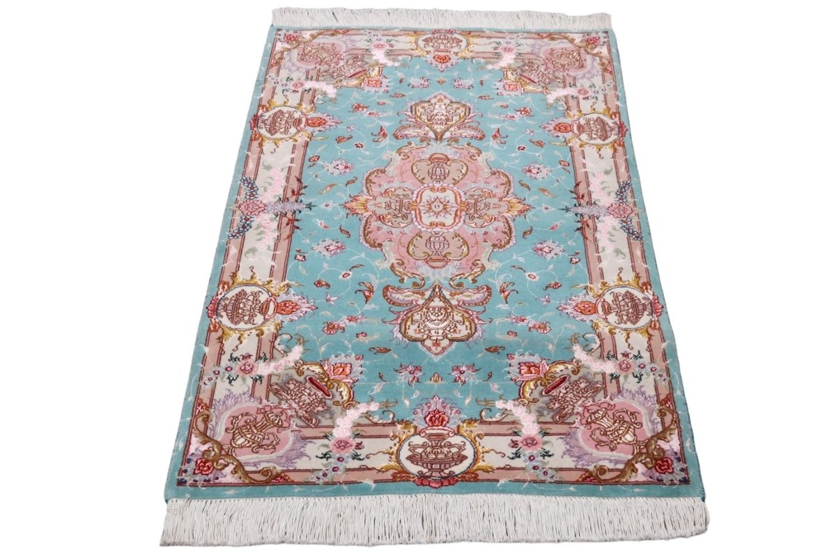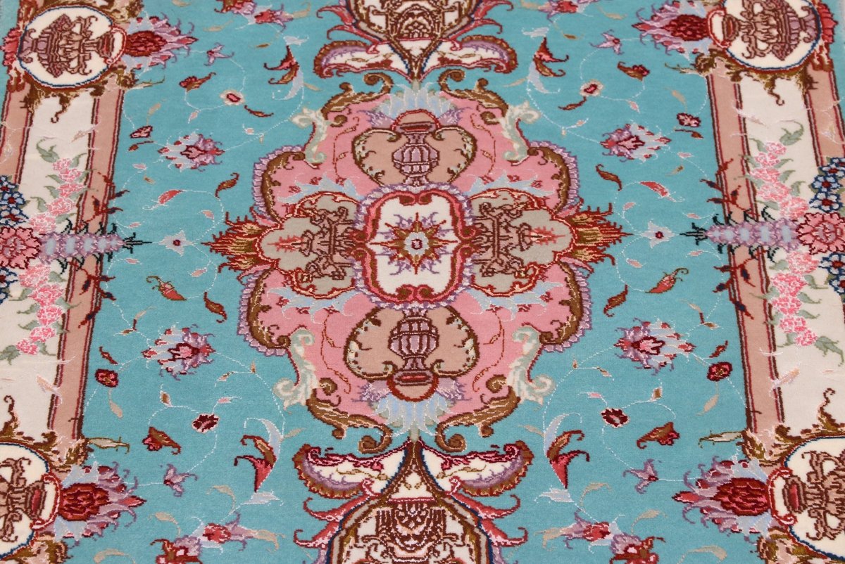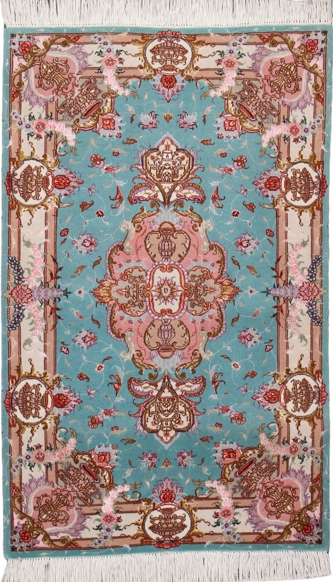 Für die besondere Eleganz des Täbriz-Flors sorgen hervorragende Materialien wie samtig anmutende Korkwolle und glänzende Seidenfäden. Die Knüpfqualität eines Täbriz-Teppichs lässt sich aus der angegebenen Raj-Zahl erschließen – je höher diese ausfällt, umso feiner ist die Knüpfdichte, die eine Million und mehr Knoten pro Quadratmeter erreichen kann. Bei besonders feingeknüpften Qualitäten kommt für die Kette statt des üblichen Baumwollgarns sogar Seide zum Einsatz.
