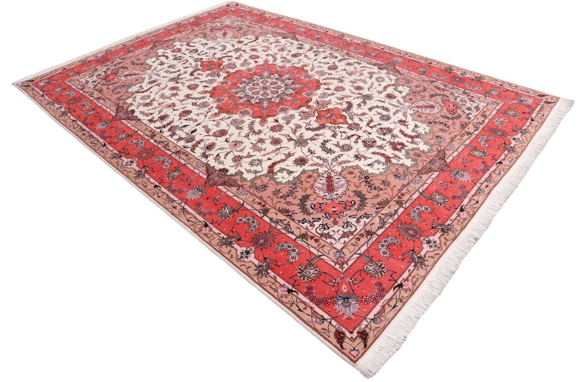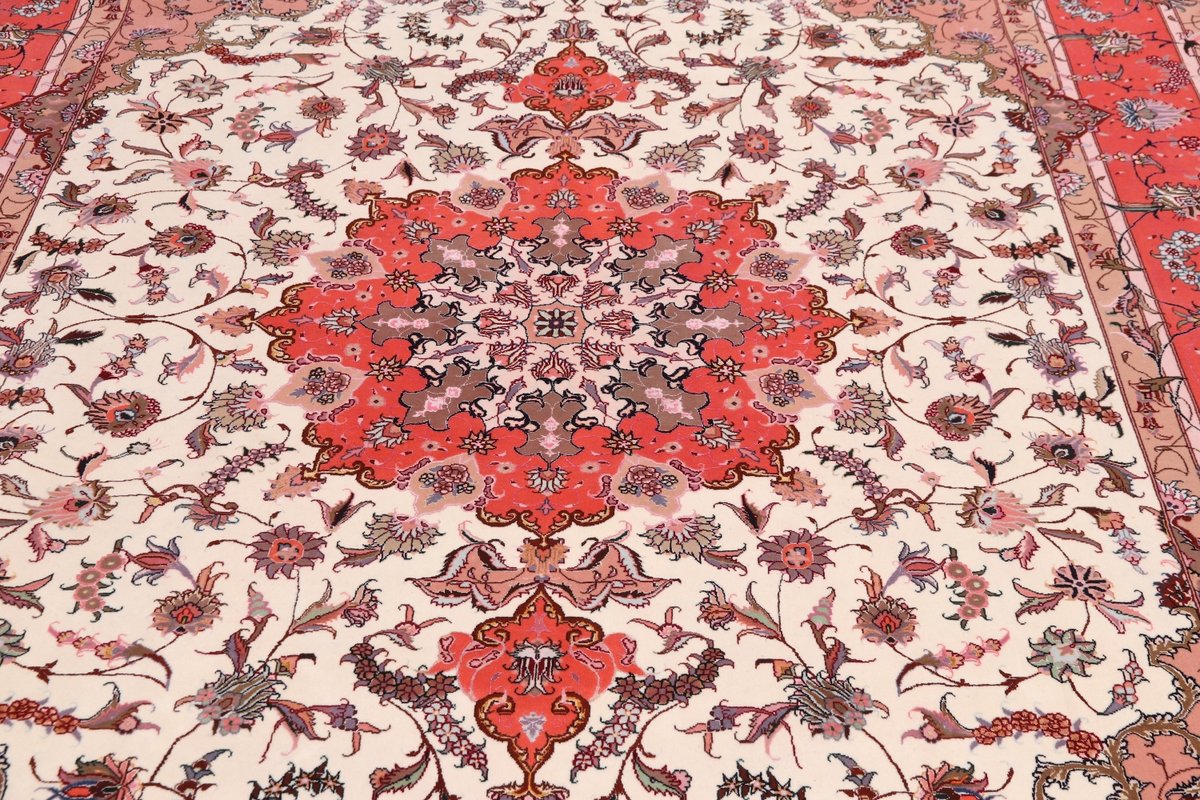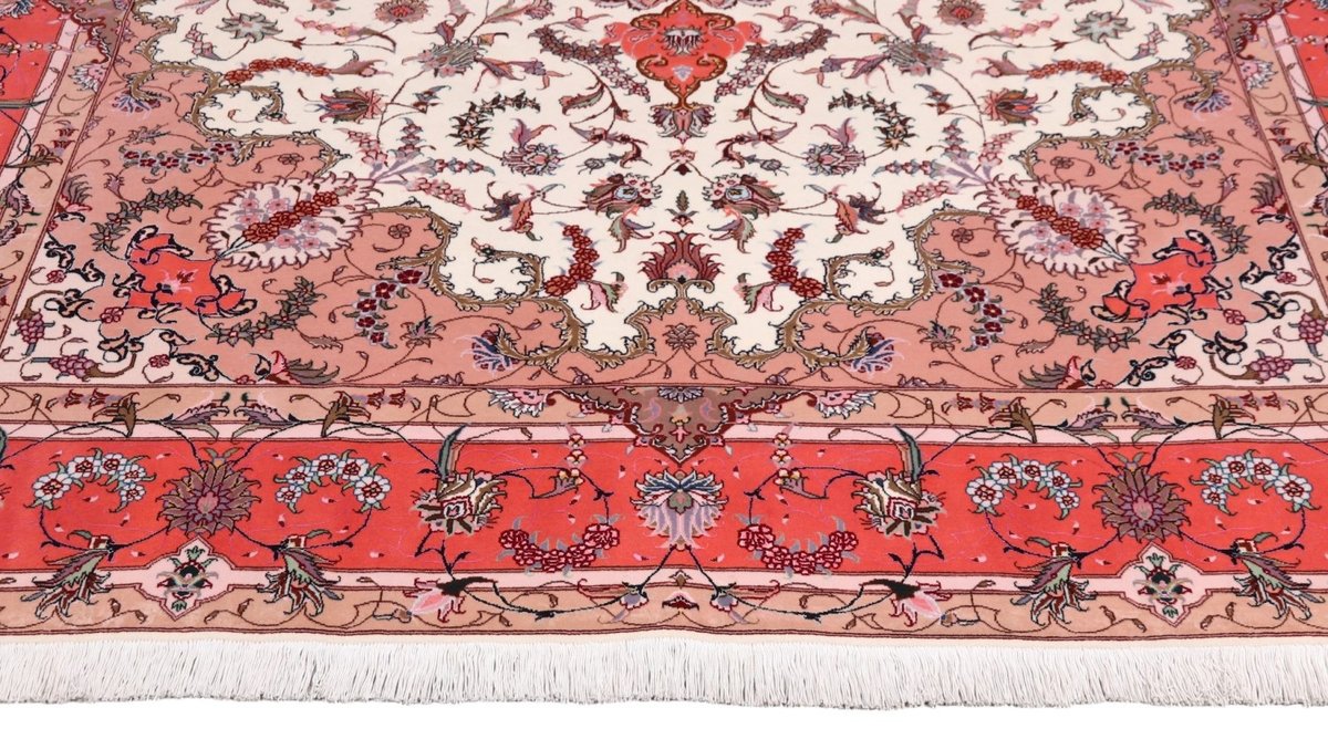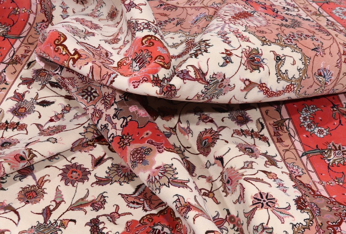 Für die besondere Eleganz des Täbriz-Flors sorgen hervorragende Materialien wie samtig anmutende Korkwolle und glänzende Seidenfäden. Die Knüpfqualität eines Täbriz-Teppichs lässt sich aus der angegebenen Raj-Zahl erschließen – je höher diese ausfällt, umso feiner ist die Knüpfdichte, die eine Million und mehr Knoten pro Quadratmeter erreichen kann. Bei besonders feingeknüpften Qualitäten kommt für die Kette statt des üblichen Baumwollgarns sogar Seide zum Einsatz.