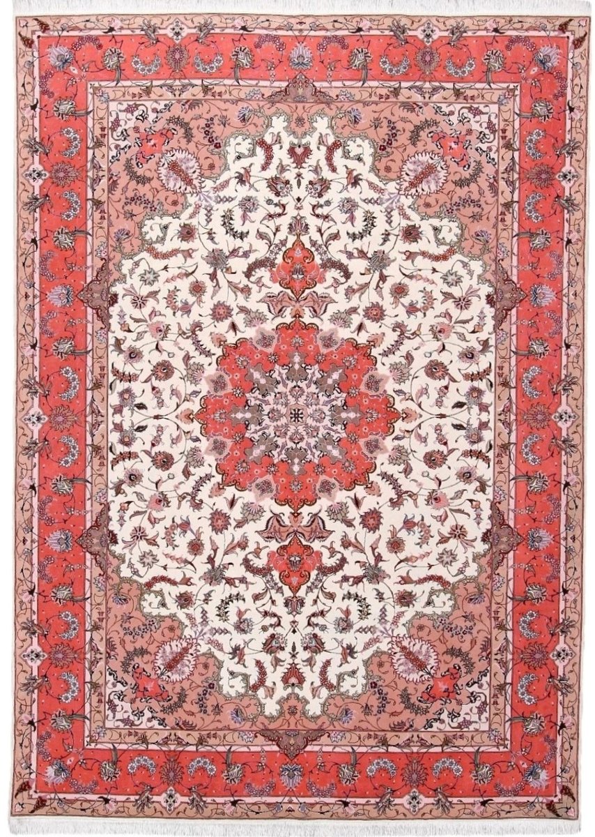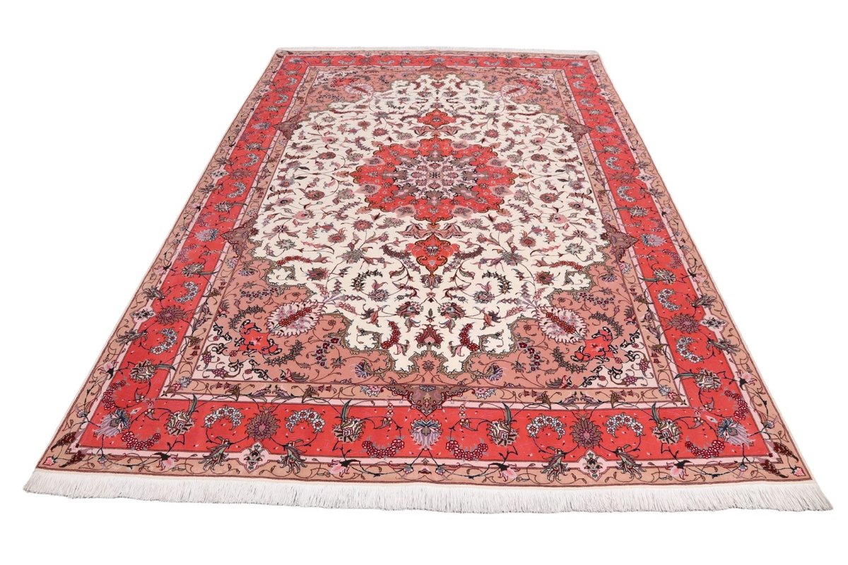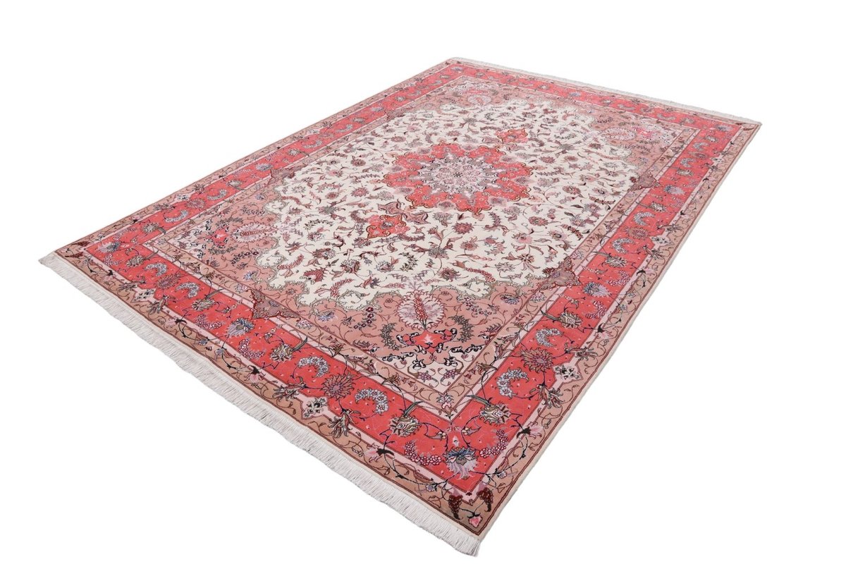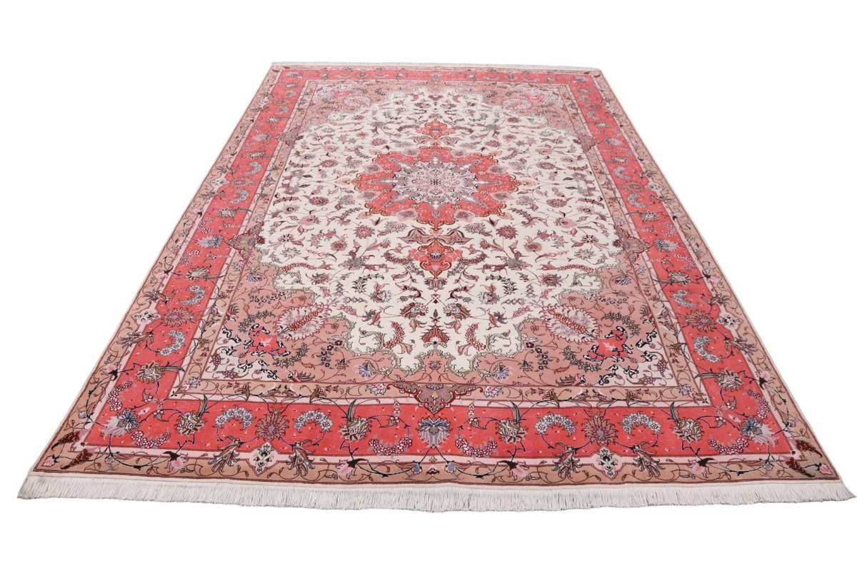 Für die besondere Eleganz des Täbriz-Flors sorgen hervorragende Materialien wie samtig anmutende Korkwolle und glänzende Seidenfäden. Die Knüpfqualität eines Täbriz-Teppichs lässt sich aus der angegebenen Raj-Zahl erschließen – je höher diese ausfällt, umso feiner ist die Knüpfdichte, die eine Million und mehr Knoten pro Quadratmeter erreichen kann. Bei besonders feingeknüpften Qualitäten kommt für die Kette statt des üblichen Baumwollgarns sogar Seide zum Einsatz.