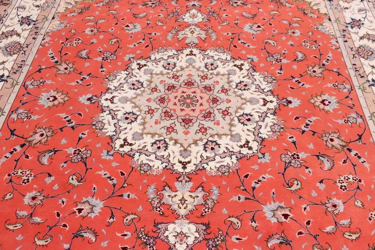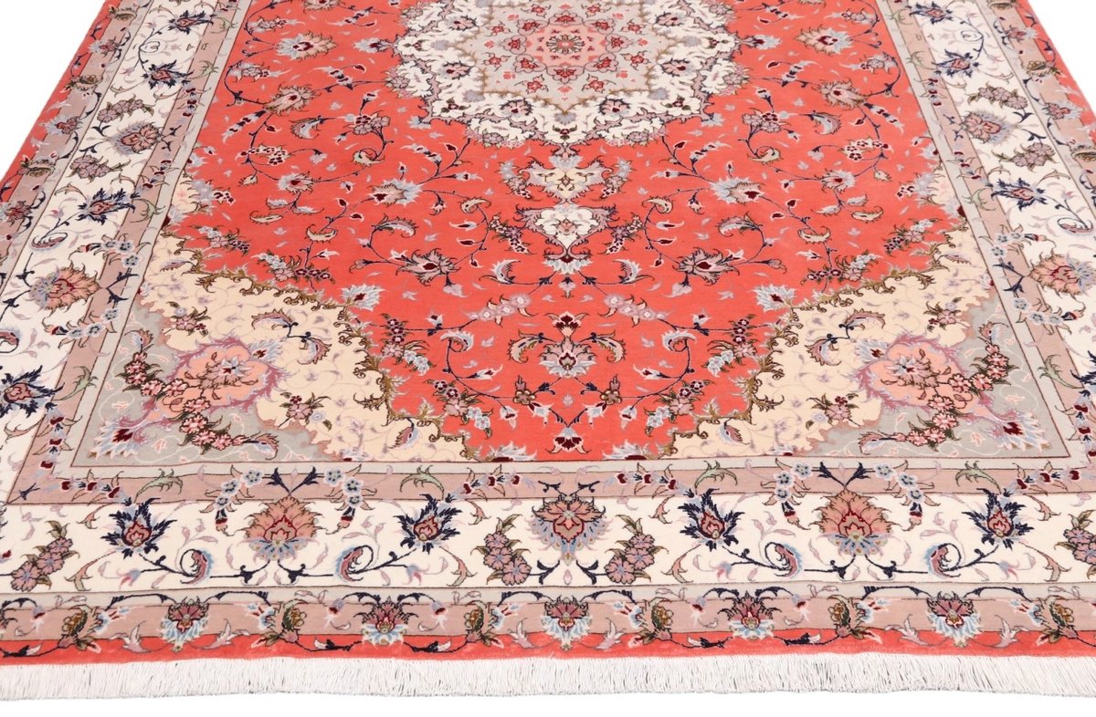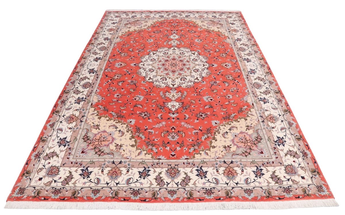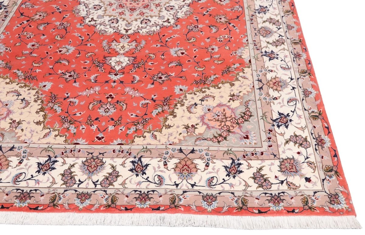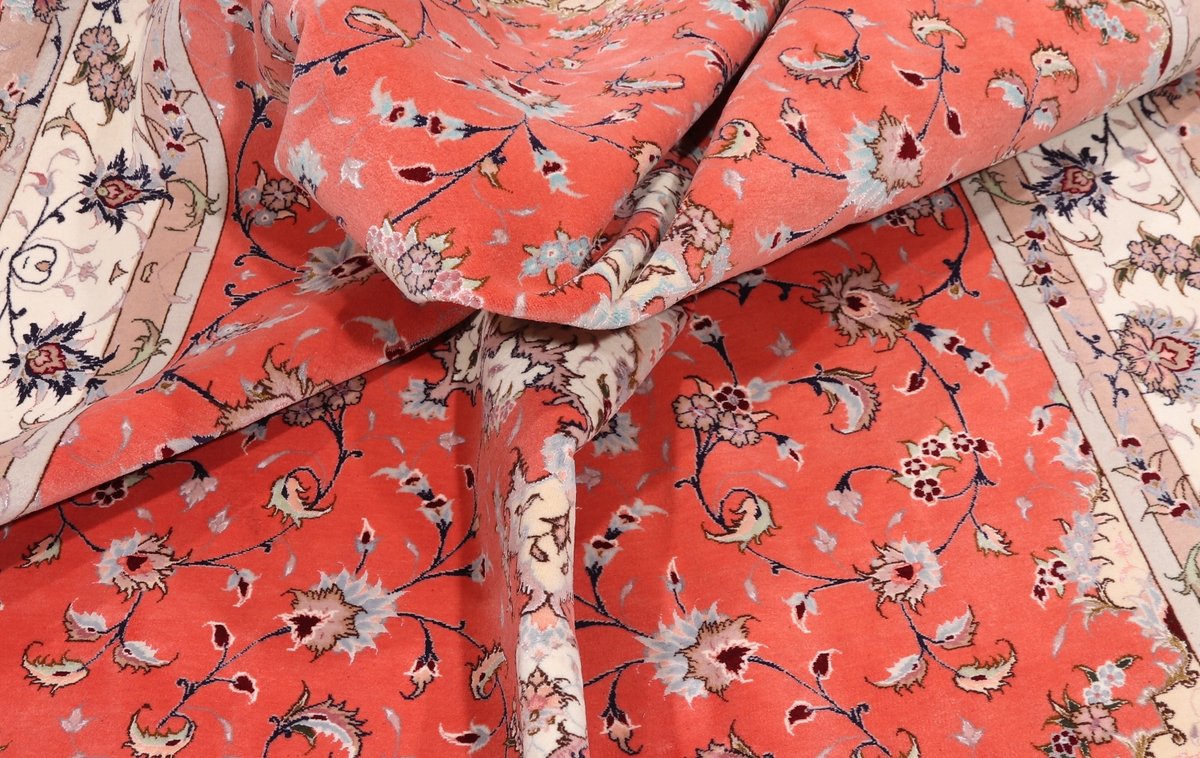 Für die besondere Eleganz des Täbriz-Flors sorgen hervorragende Materialien wie samtig anmutende Korkwolle und glänzende Seidenfäden. Die Knüpfqualität eines Täbriz-Teppichs lässt sich aus der angegebenen Raj-Zahl erschließen – je höher diese ausfällt, umso feiner ist die Knüpfdichte, die eine Million und mehr Knoten pro Quadratmeter erreichen kann. Bei besonders feingeknüpften Qualitäten kommt für die Kette statt des üblichen Baumwollgarns sogar Seide zum Einsatz.