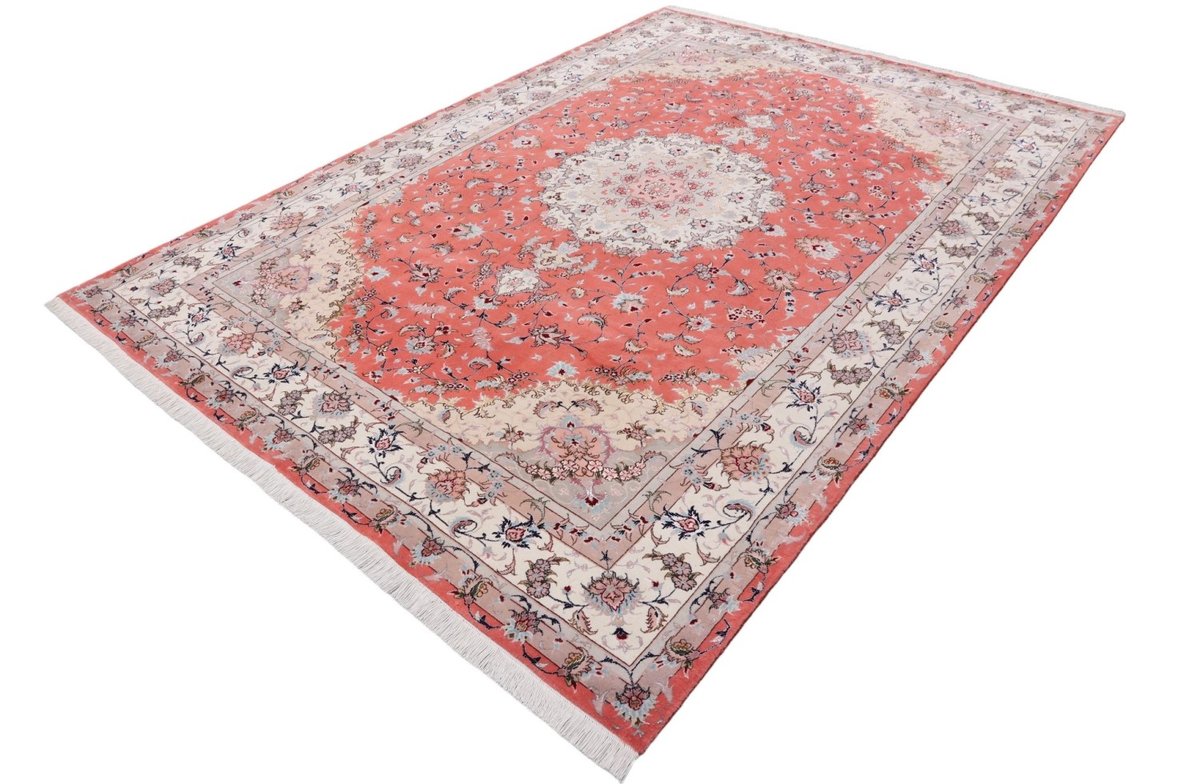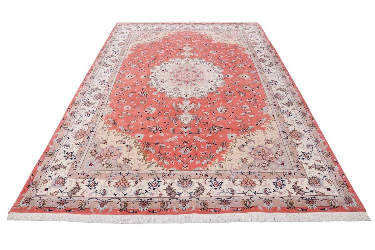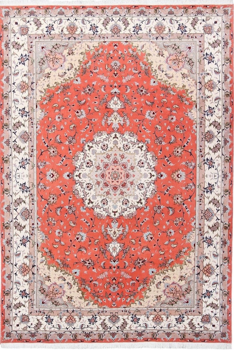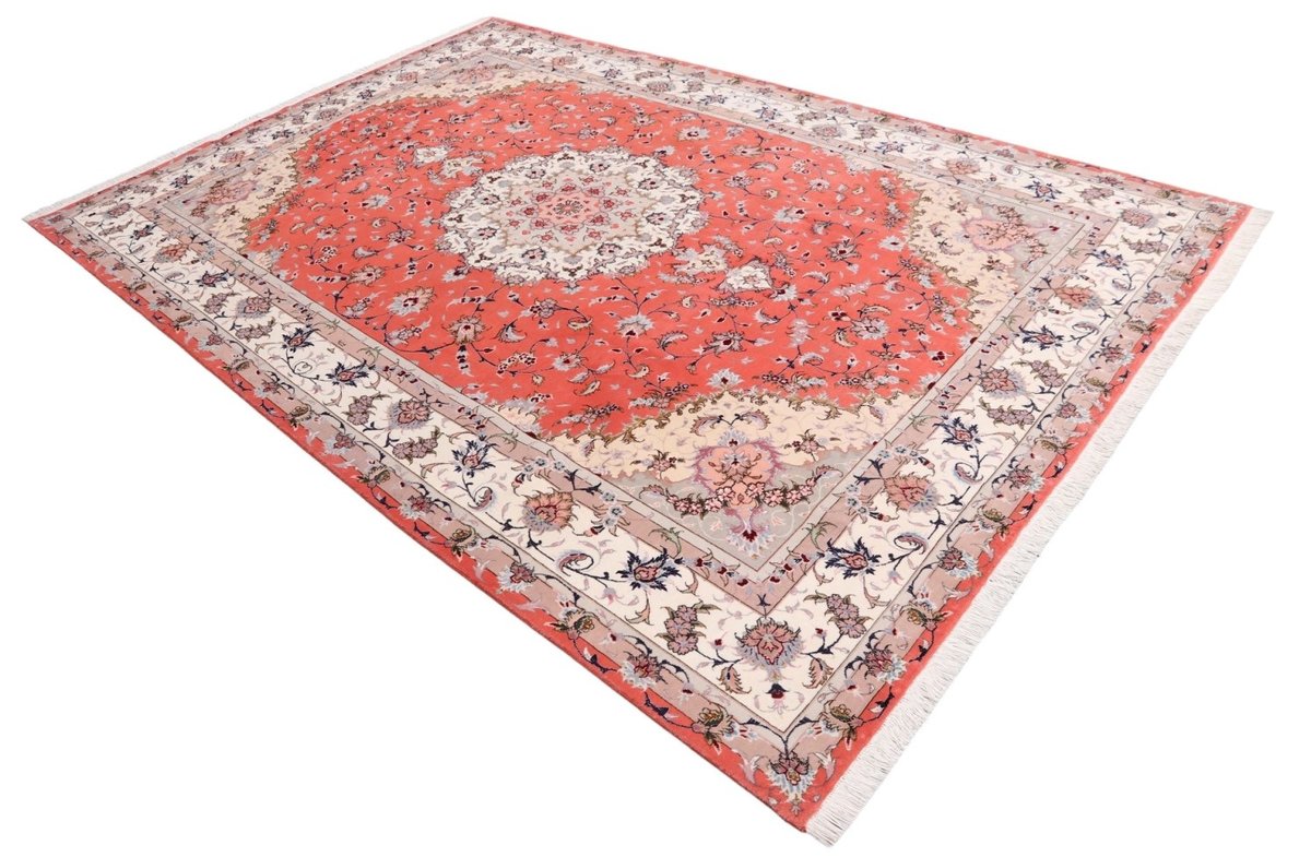 Für die besondere Eleganz des Täbriz-Flors sorgen hervorragende Materialien wie samtig anmutende Korkwolle und glänzende Seidenfäden. Die Knüpfqualität eines Täbriz-Teppichs lässt sich aus der angegebenen Raj-Zahl erschließen – je höher diese ausfällt, umso feiner ist die Knüpfdichte, die eine Million und mehr Knoten pro Quadratmeter erreichen kann. Bei besonders feingeknüpften Qualitäten kommt für die Kette statt des üblichen Baumwollgarns sogar Seide zum Einsatz.