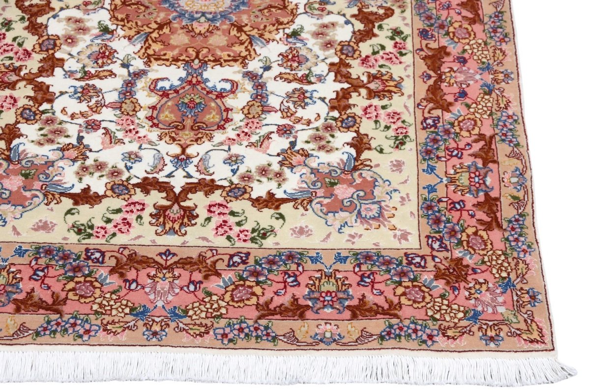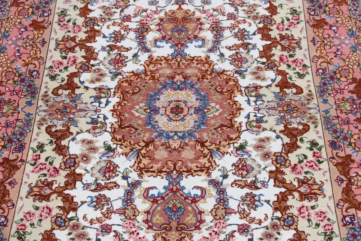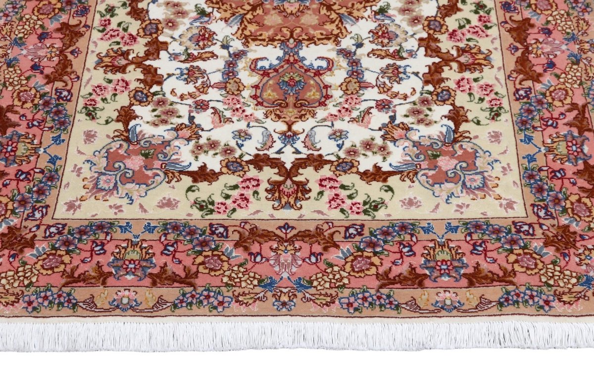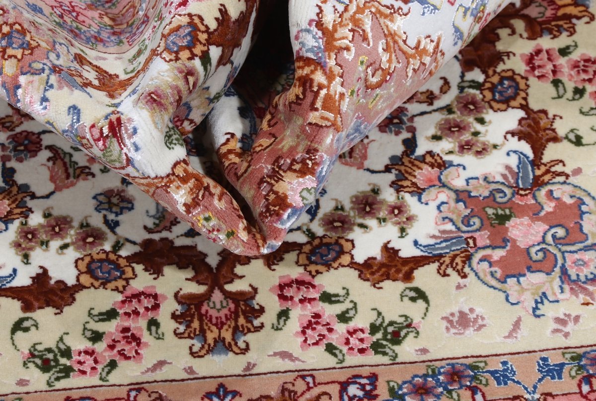 Für die besondere Eleganz des Täbriz-Flors sorgen hervorragende Materialien wie samtig anmutende Korkwolle und glänzende Seidenfäden. Die Knüpfqualität eines Täbriz-Teppichs lässt sich aus der angegebenen Raj-Zahl erschließen – je höher diese ausfällt, umso feiner ist die Knüpfdichte, die eine Million und mehr Knoten pro Quadratmeter erreichen kann. Bei besonders feingeknüpften Qualitäten kommt für die Kette statt des üblichen Baumwollgarns sogar Seide zum Einsatz.