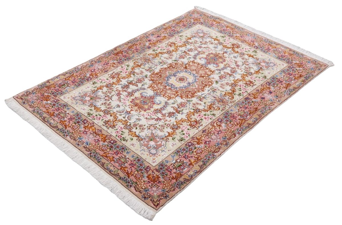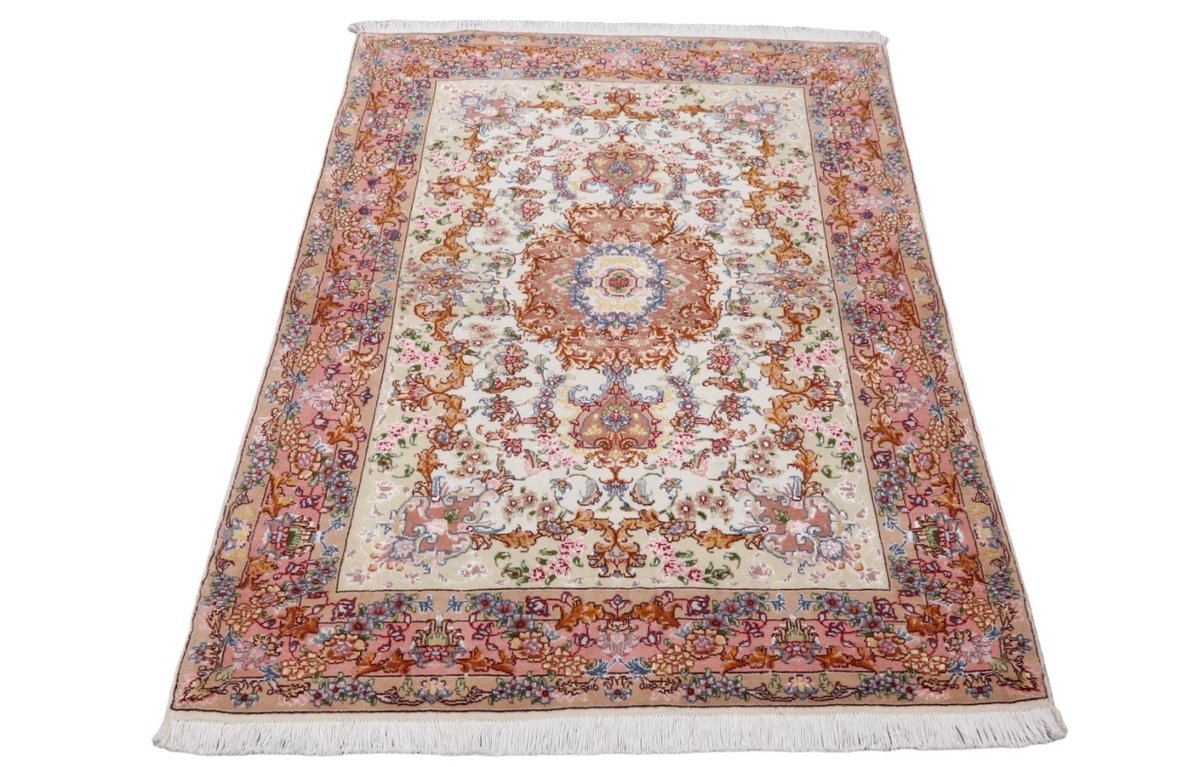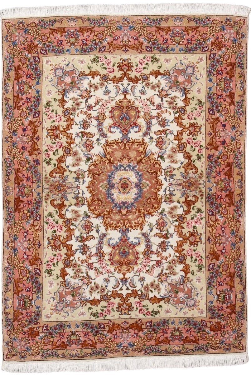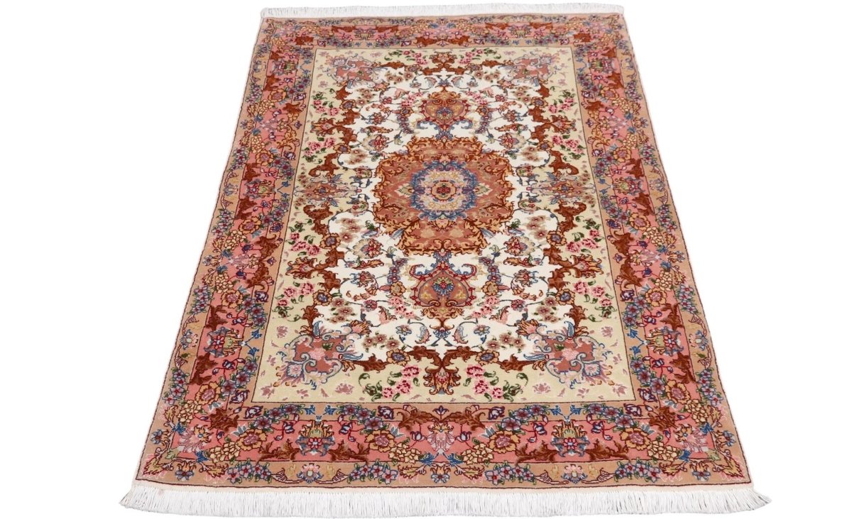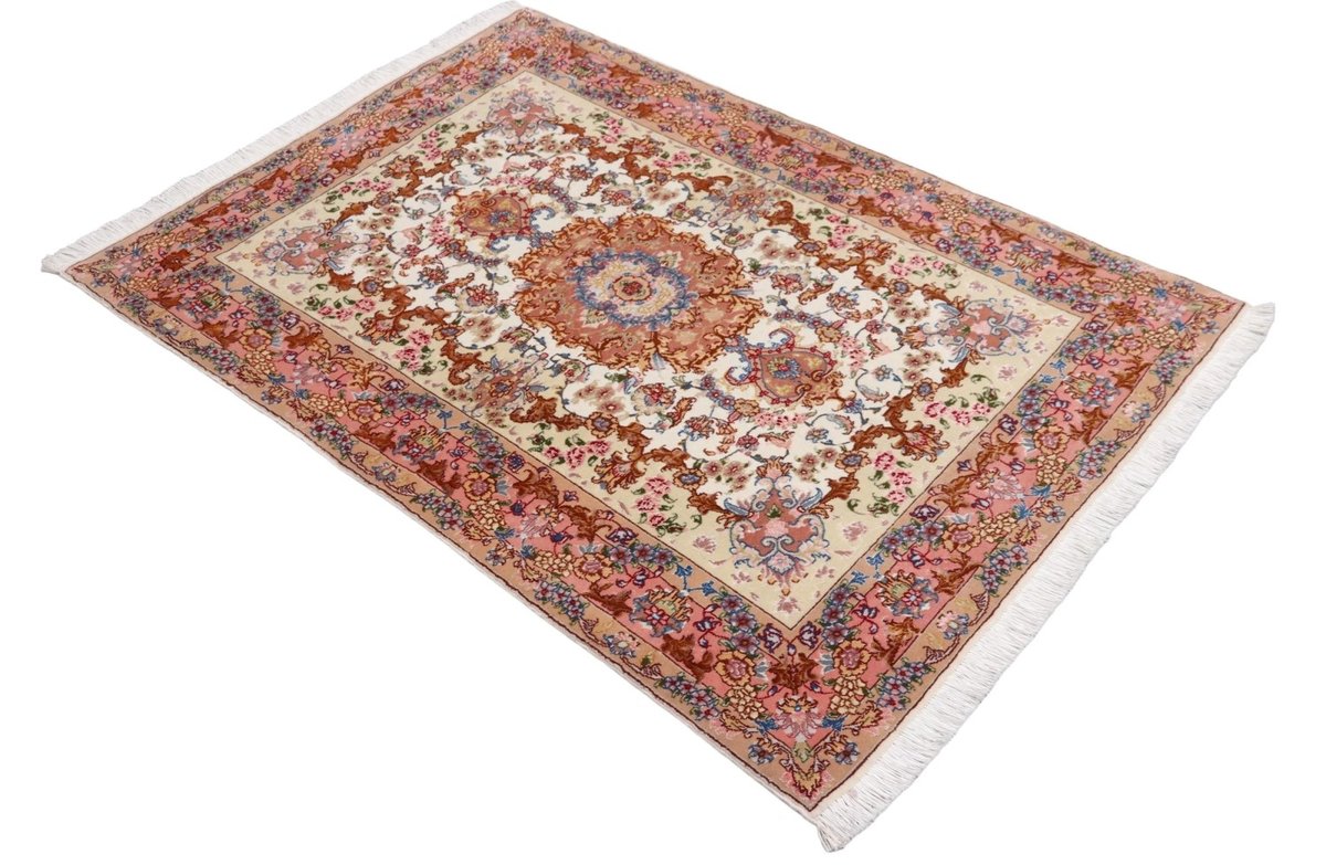 Für die besondere Eleganz des Täbriz-Flors sorgen hervorragende Materialien wie samtig anmutende Korkwolle und glänzende Seidenfäden. Die Knüpfqualität eines Täbriz-Teppichs lässt sich aus der angegebenen Raj-Zahl erschließen – je höher diese ausfällt, umso feiner ist die Knüpfdichte, die eine Million und mehr Knoten pro Quadratmeter erreichen kann. Bei besonders feingeknüpften Qualitäten kommt für die Kette statt des üblichen Baumwollgarns sogar Seide zum Einsatz.
