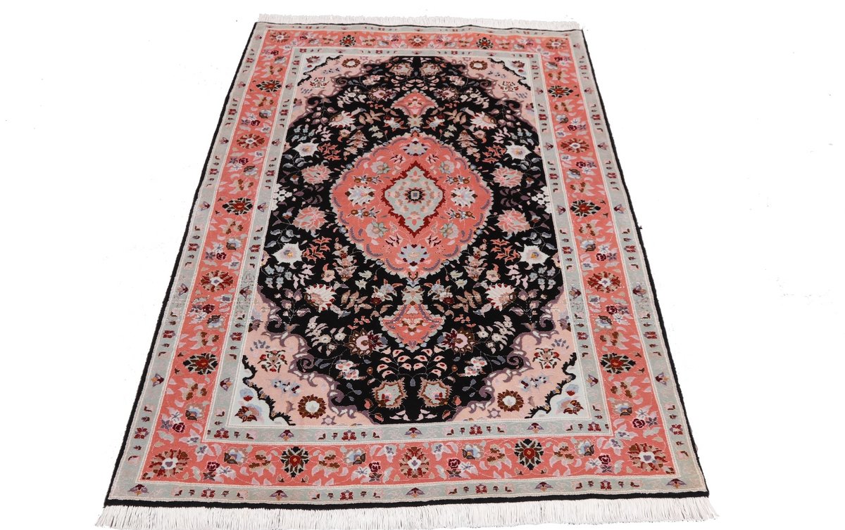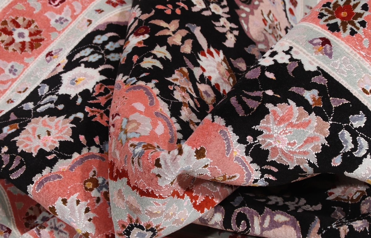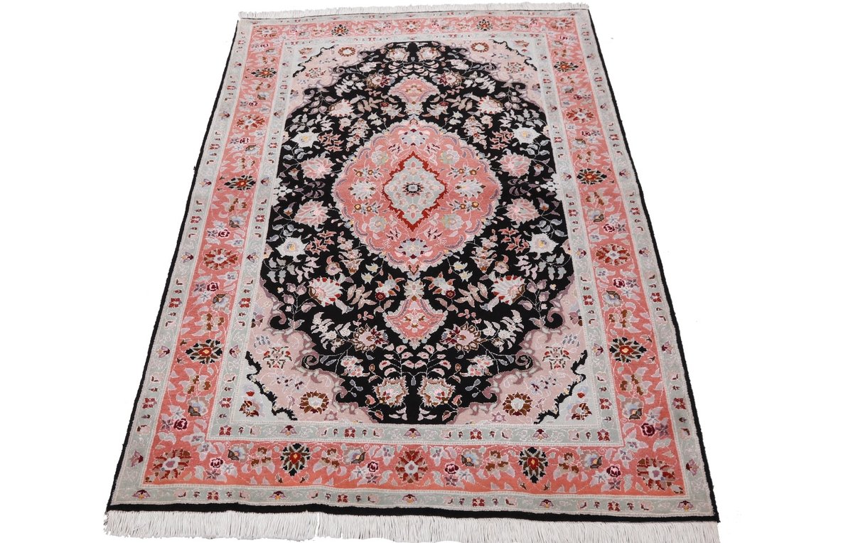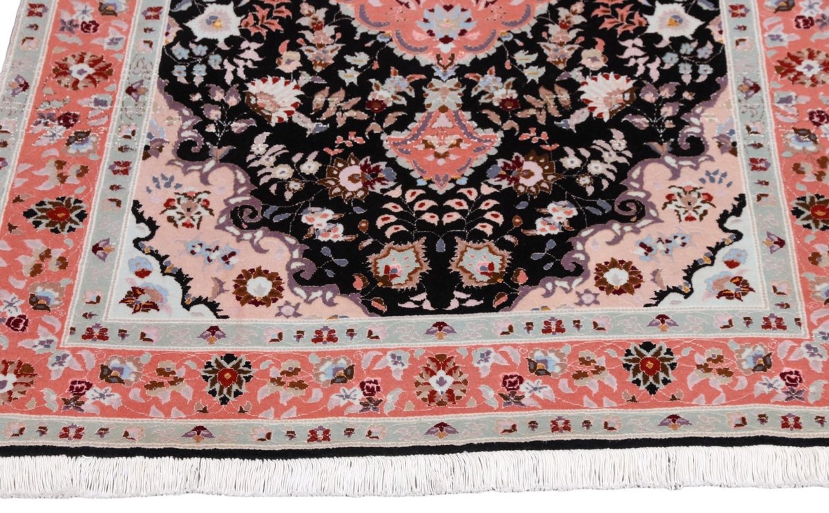Für die besondere Eleganz des Täbriz-Flors sorgen hervorragende Materialien wie samtig anmutende Korkwolle und glänzende Seidenfäden. Die Knüpfqualität eines Täbriz-Teppichs lässt sich aus der angegebenen Raj-Zahl erschließen – je höher diese ausfällt, umso feiner ist die Knüpfdichte, die eine Million und mehr Knoten pro Quadratmeter erreichen kann. Bei besonders feingeknüpften Qualitäten kommt für die Kette statt des üblichen Baumwollgarns sogar Seide zum Einsatz.
