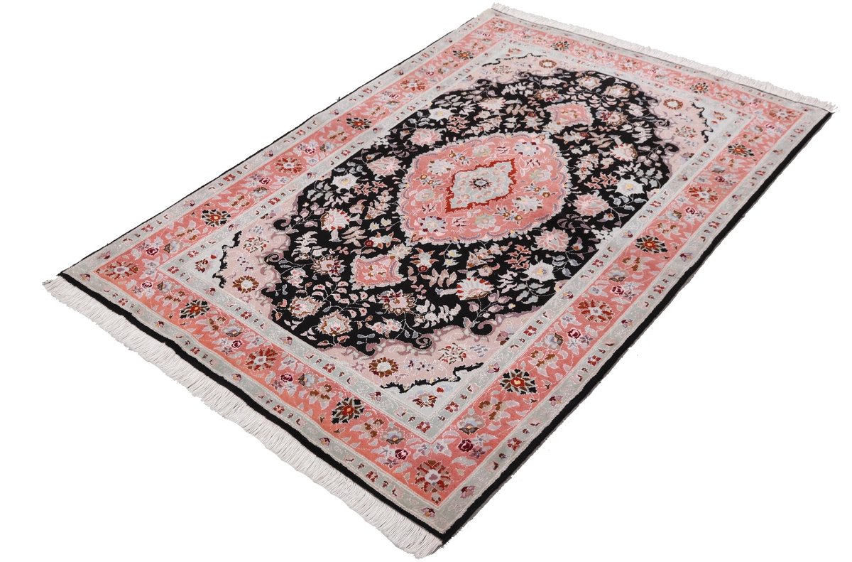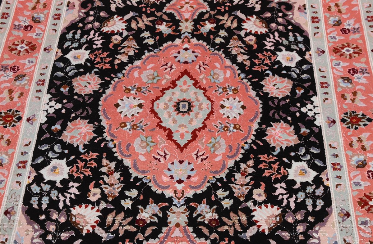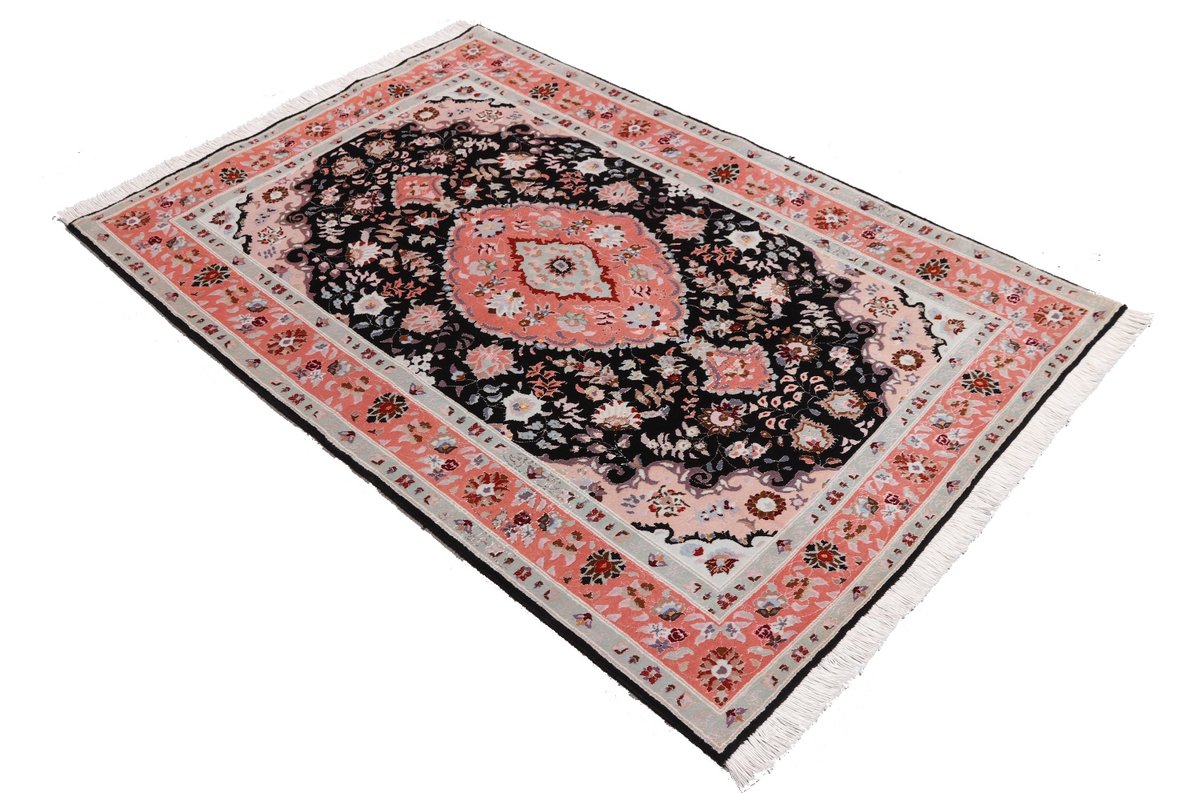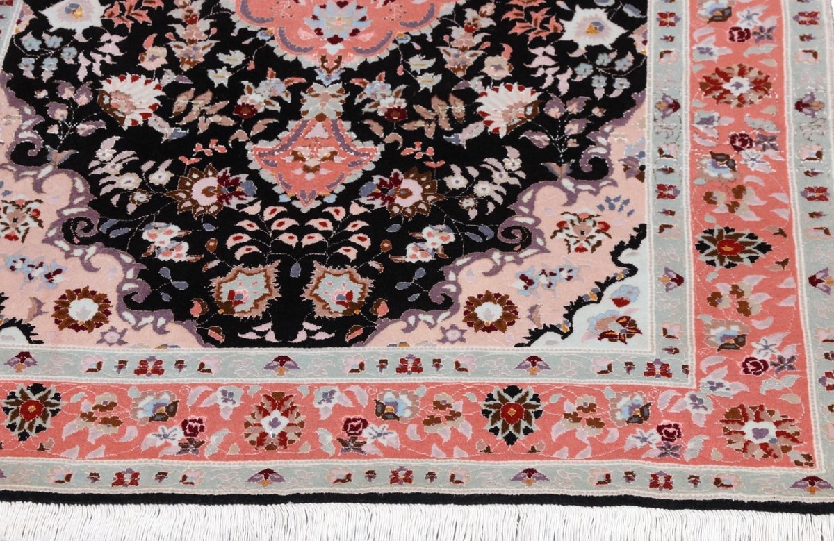 Für die besondere Eleganz des Täbriz-Flors sorgen hervorragende Materialien wie samtig anmutende Korkwolle und glänzende Seidenfäden. Die Knüpfqualität eines Täbriz-Teppichs lässt sich aus der angegebenen Raj-Zahl erschließen – je höher diese ausfällt, umso feiner ist die Knüpfdichte, die eine Million und mehr Knoten pro Quadratmeter erreichen kann. Bei besonders feingeknüpften Qualitäten kommt für die Kette statt des üblichen Baumwollgarns sogar Seide zum Einsatz.