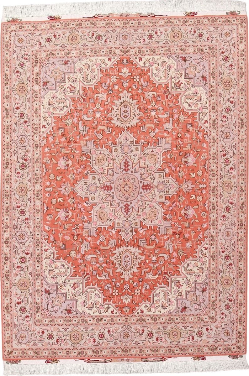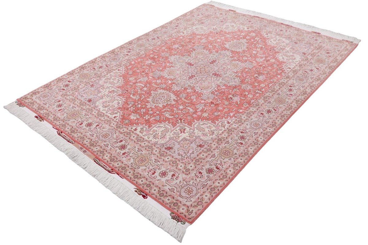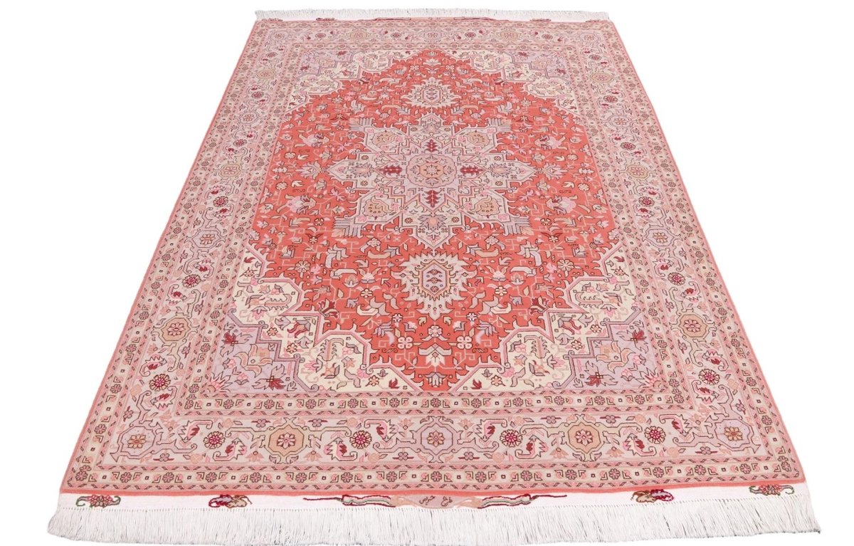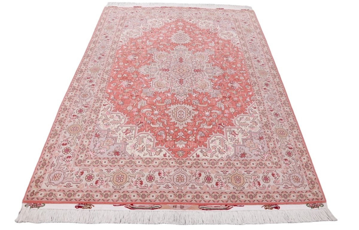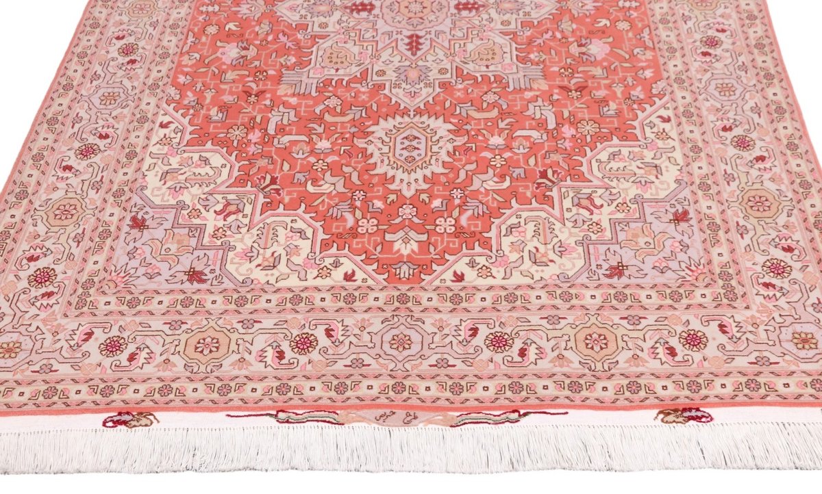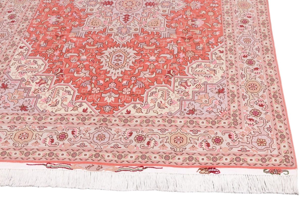 Für die besondere Eleganz des Täbriz-Flors sorgen hervorragende Materialien wie samtig anmutende Korkwolle und glänzende Seidenfäden. Die Knüpfqualität eines Täbriz-Teppichs lässt sich aus der angegebenen Raj-Zahl erschließen – je höher diese ausfällt, umso feiner ist die Knüpfdichte, die eine Million und mehr Knoten pro Quadratmeter erreichen kann. Bei besonders feingeknüpften Qualitäten kommt für die Kette statt des üblichen Baumwollgarns sogar Seide zum Einsatz.