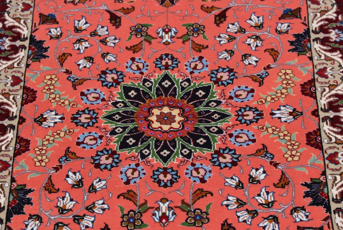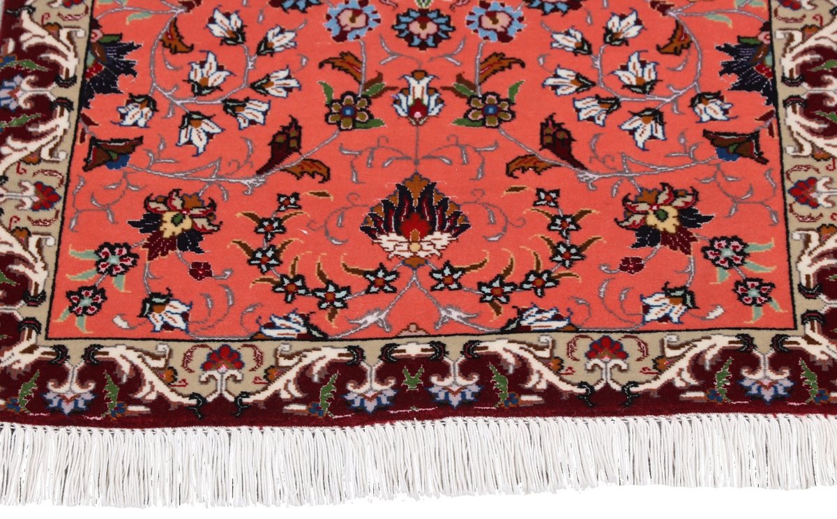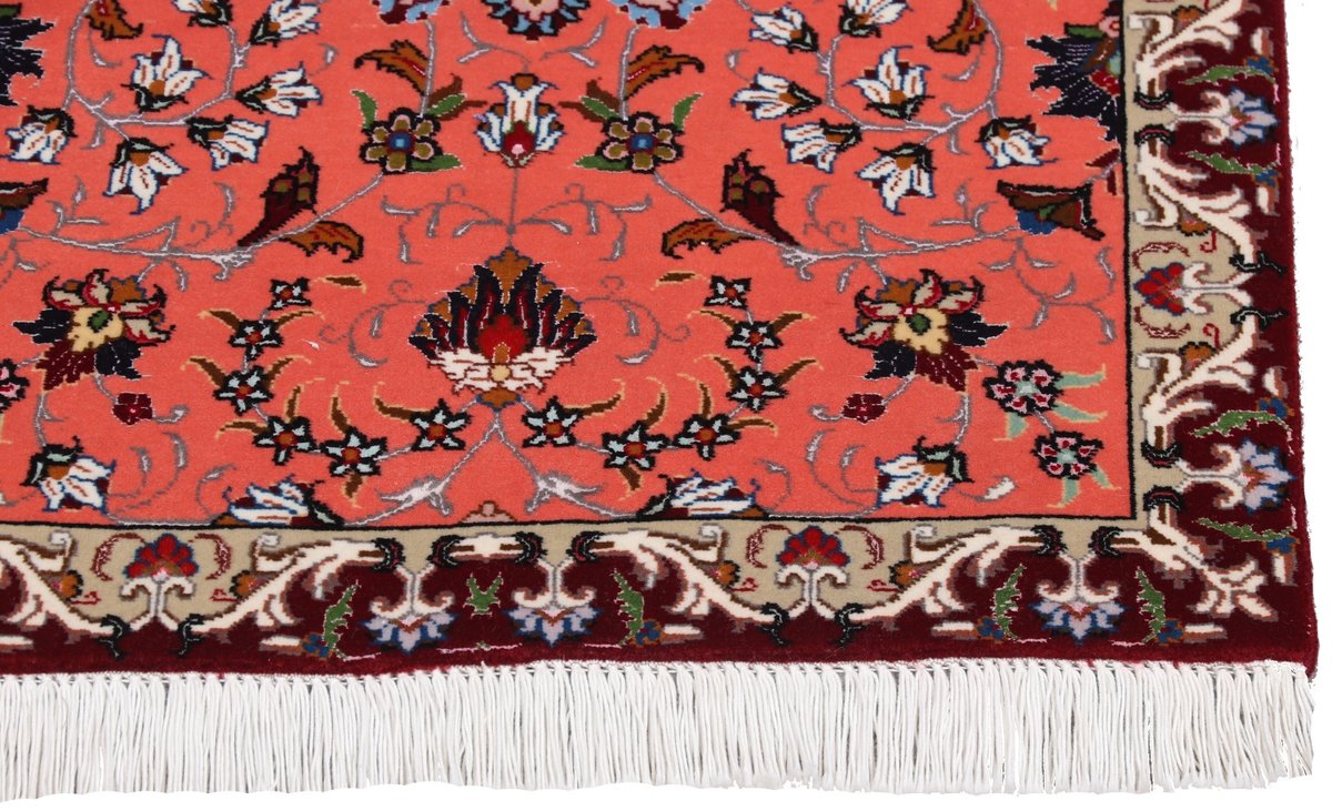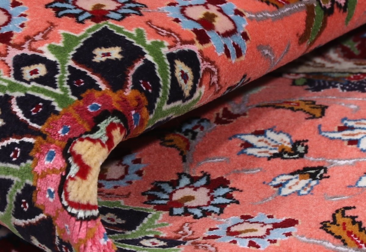 Für die besondere Eleganz des Täbriz-Flors sorgen hervorragende Materialien wie samtig anmutende Korkwolle und glänzende Seidenfäden. Die Knüpfqualität eines Täbriz-Teppichs lässt sich aus der angegebenen Raj-Zahl erschließen – je höher diese ausfällt, umso feiner ist die Knüpfdichte, die eine Million und mehr Knoten pro Quadratmeter erreichen kann. Bei besonders feingeknüpften Qualitäten kommt für die Kette statt des üblichen Baumwollgarns sogar Seide zum Einsatz.