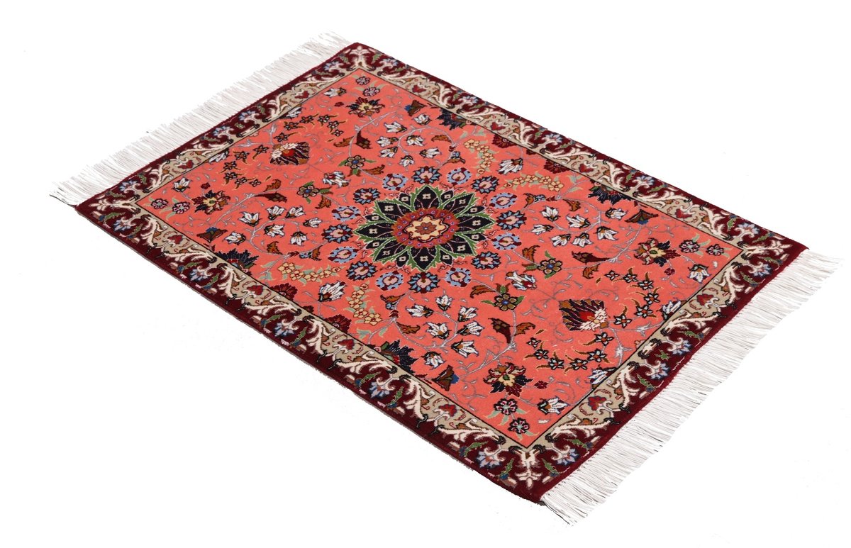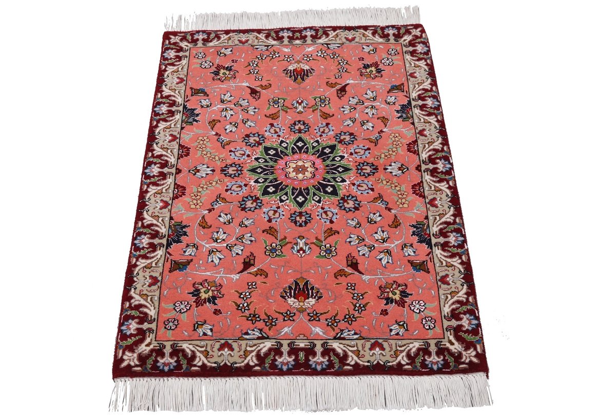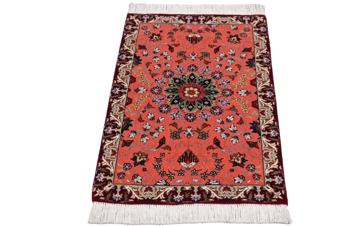 Für die besondere Eleganz des Täbriz-Flors sorgen hervorragende Materialien wie samtig anmutende Korkwolle und glänzende Seidenfäden. Die Knüpfqualität eines Täbriz-Teppichs lässt sich aus der angegebenen Raj-Zahl erschließen – je höher diese ausfällt, umso feiner ist die Knüpfdichte, die eine Million und mehr Knoten pro Quadratmeter erreichen kann. Bei besonders feingeknüpften Qualitäten kommt für die Kette statt des üblichen Baumwollgarns sogar Seide zum Einsatz.