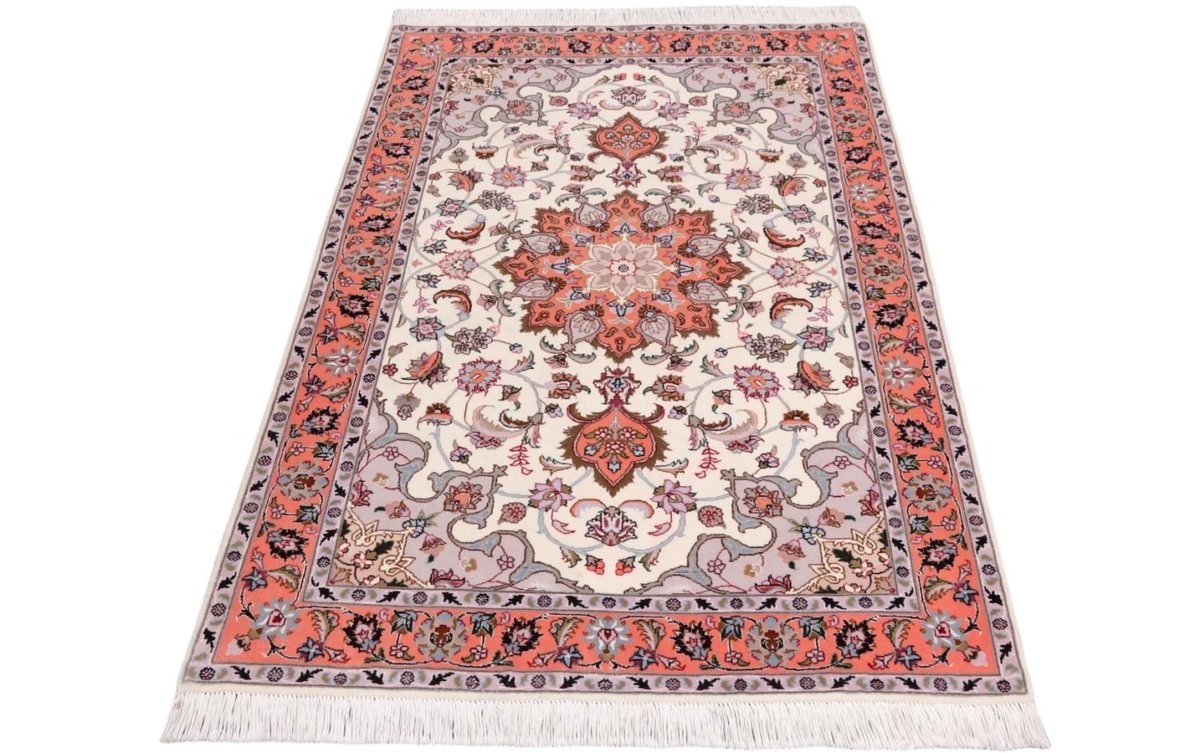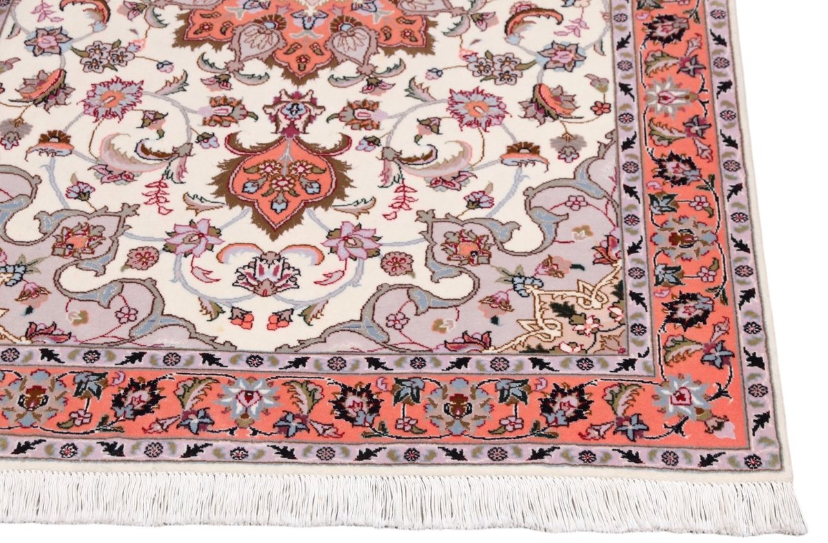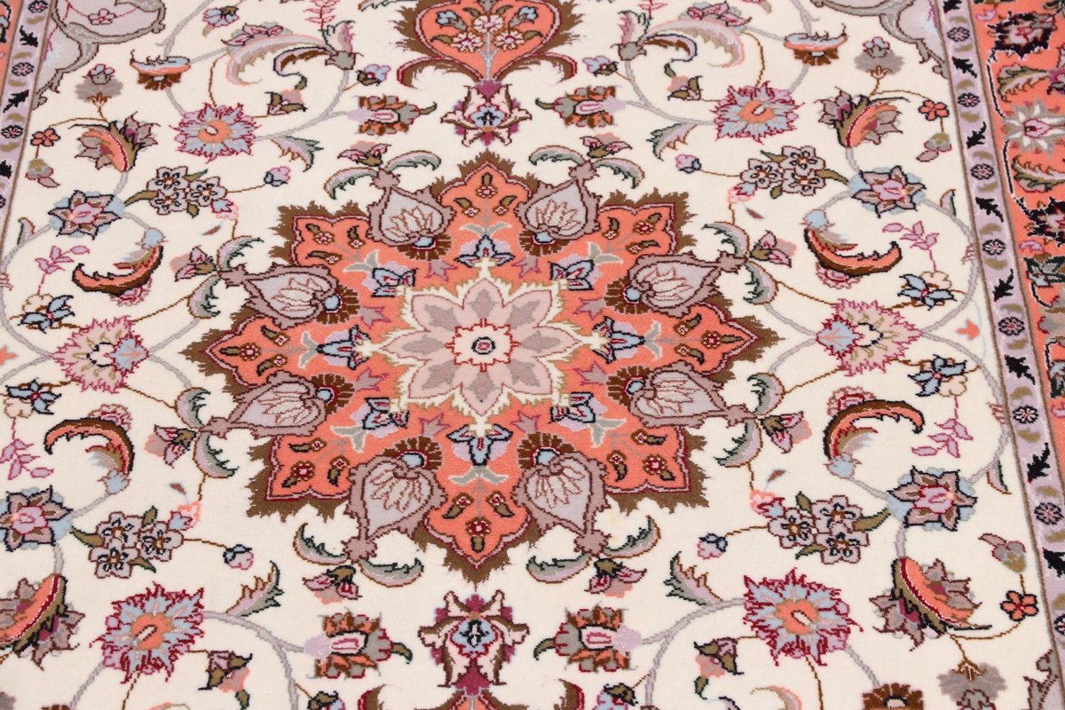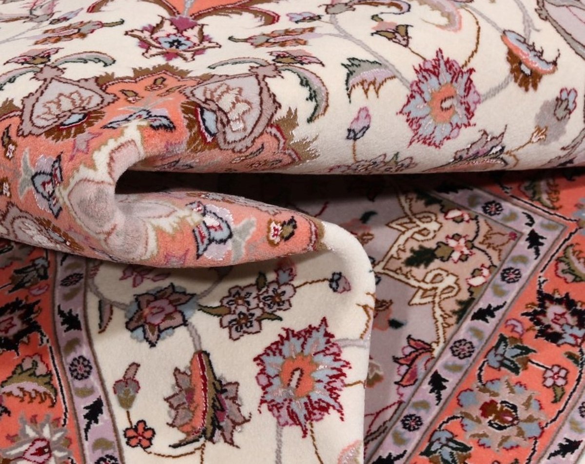 Für die besondere Eleganz des Täbriz-Flors sorgen hervorragende Materialien wie samtig anmutende Korkwolle und glänzende Seidenfäden. Die Knüpfqualität eines Täbriz-Teppichs lässt sich aus der angegebenen Raj-Zahl erschließen – je höher diese ausfällt, umso feiner ist die Knüpfdichte, die eine Million und mehr Knoten pro Quadratmeter erreichen kann. Bei besonders feingeknüpften Qualitäten kommt für die Kette statt des üblichen Baumwollgarns sogar Seide zum Einsatz.