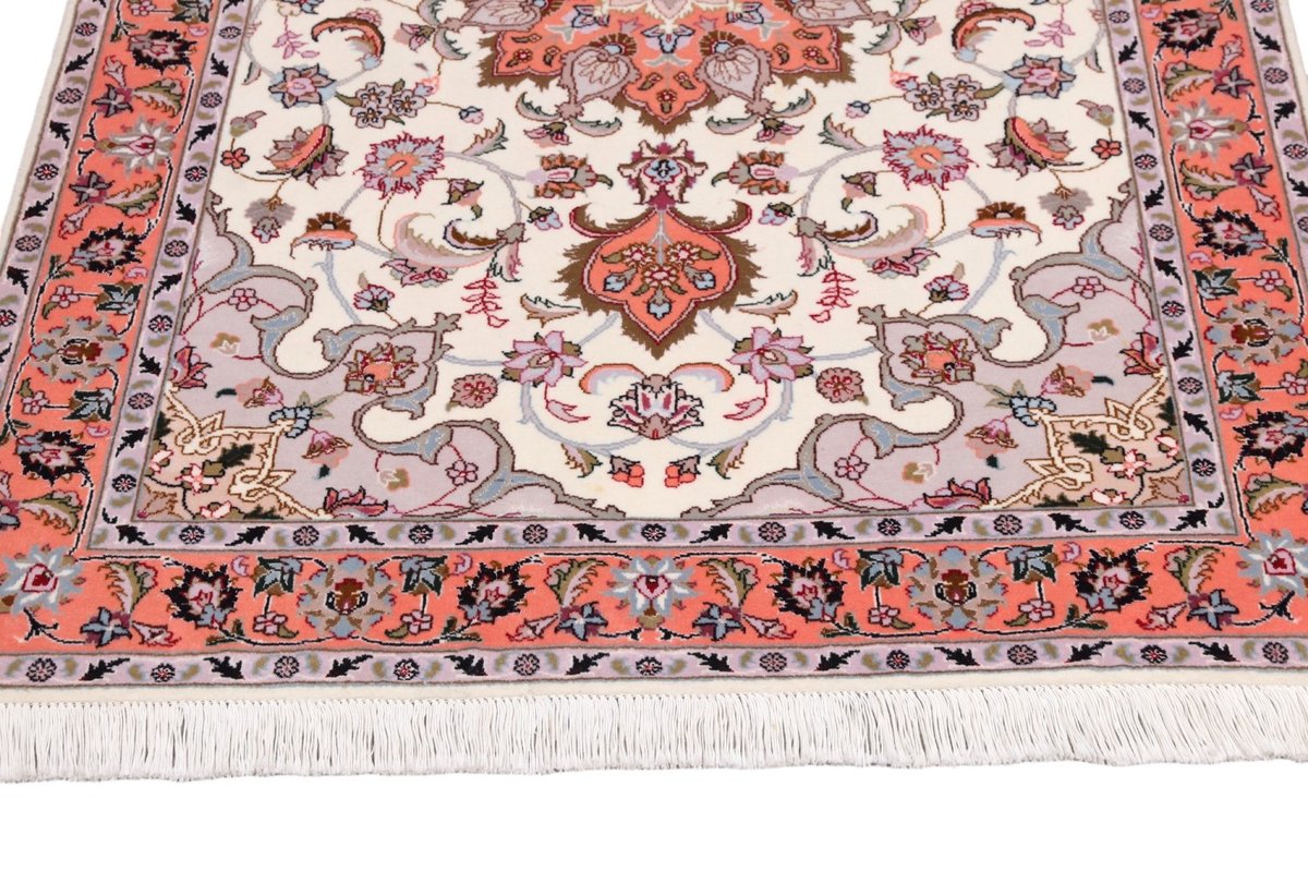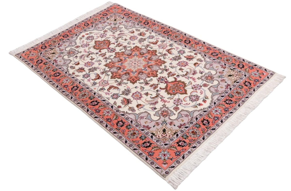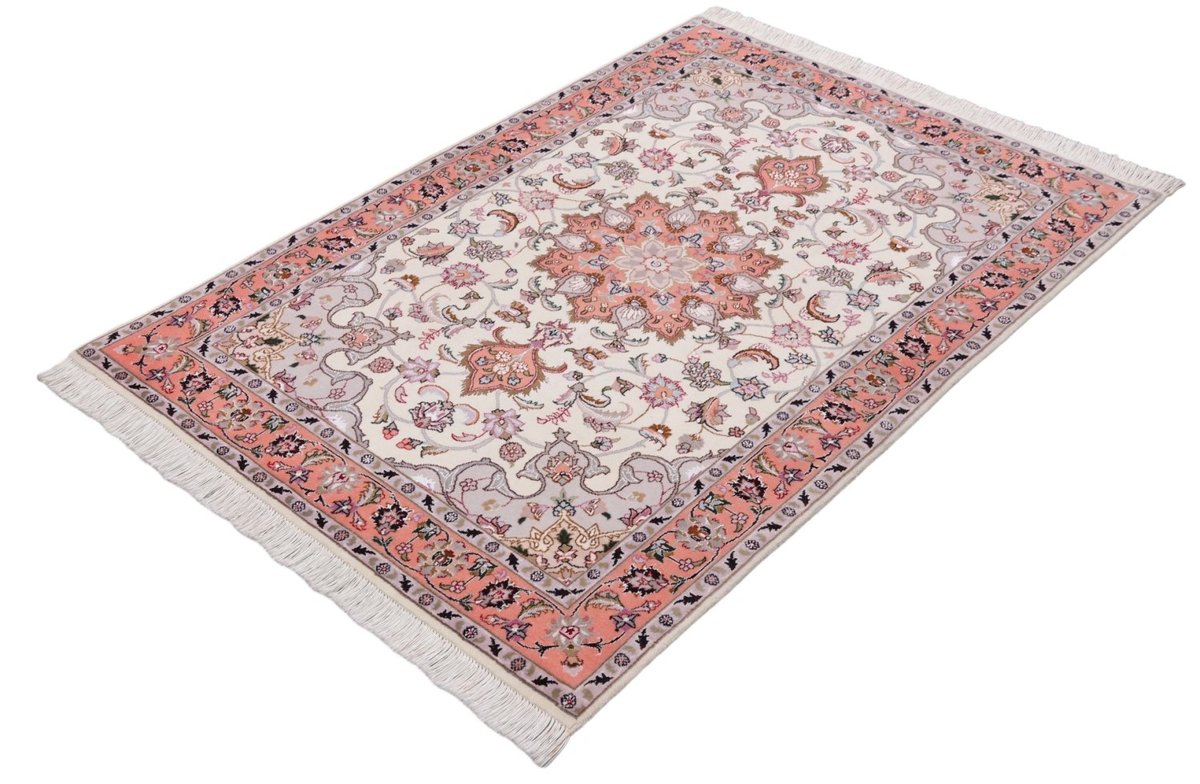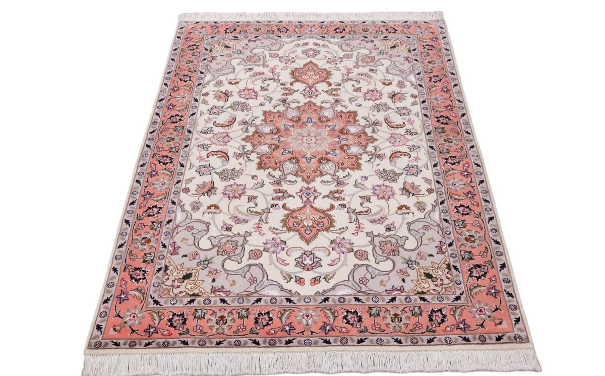 Für die besondere Eleganz des Täbriz-Flors sorgen hervorragende Materialien wie samtig anmutende Korkwolle und glänzende Seidenfäden. Die Knüpfqualität eines Täbriz-Teppichs lässt sich aus der angegebenen Raj-Zahl erschließen – je höher diese ausfällt, umso feiner ist die Knüpfdichte, die eine Million und mehr Knoten pro Quadratmeter erreichen kann. Bei besonders feingeknüpften Qualitäten kommt für die Kette statt des üblichen Baumwollgarns sogar Seide zum Einsatz.