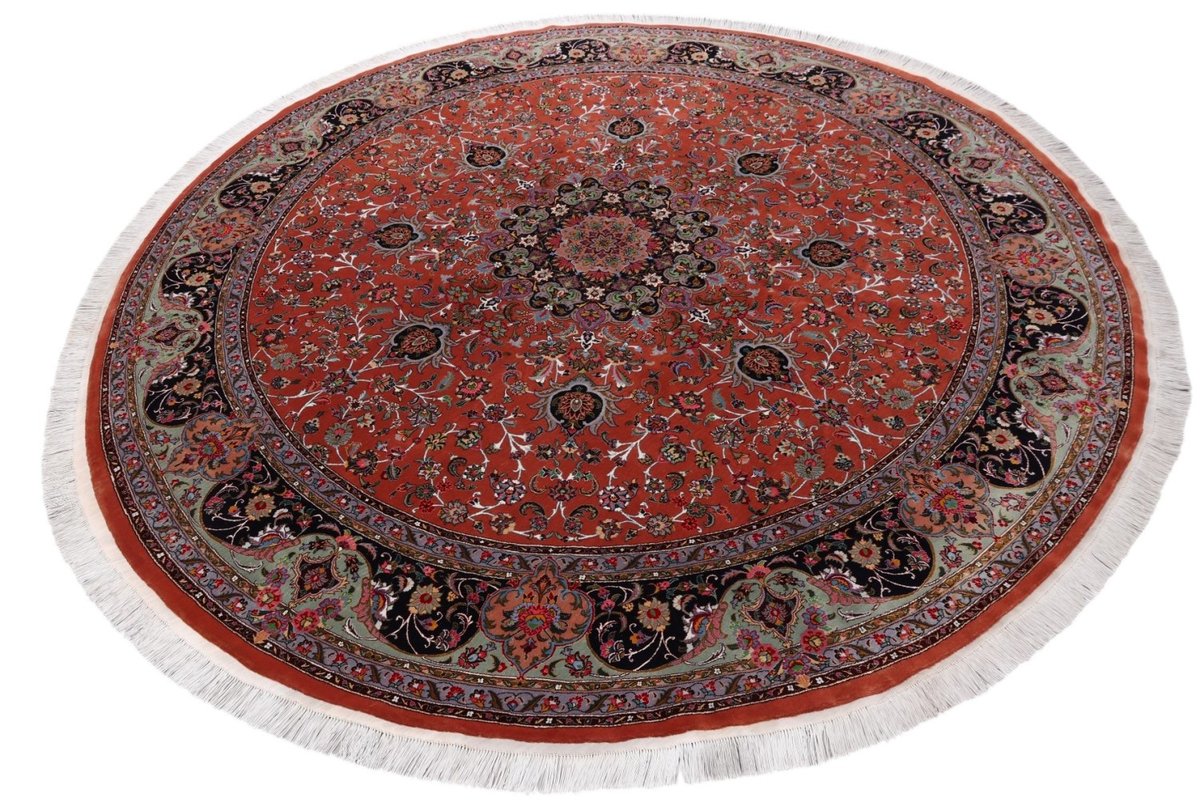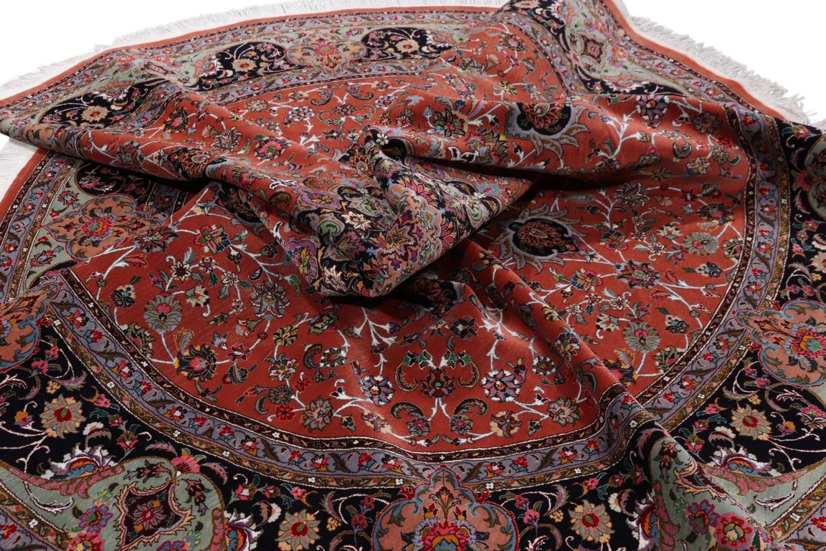 Für die besondere Eleganz des Täbriz-Flors sorgen hervorragende Materialien wie samtig anmutende Korkwolle und glänzende Seidenfäden. Die Knüpfqualität eines Täbriz-Teppichs lässt sich aus der angegebenen Raj-Zahl erschließen – je höher diese ausfällt, umso feiner ist die Knüpfdichte, die eine Million und mehr Knoten pro Quadratmeter erreichen kann. Bei besonders feingeknüpften Qualitäten kommt für die Kette statt des üblichen Baumwollgarns sogar Seide zum Einsatz.