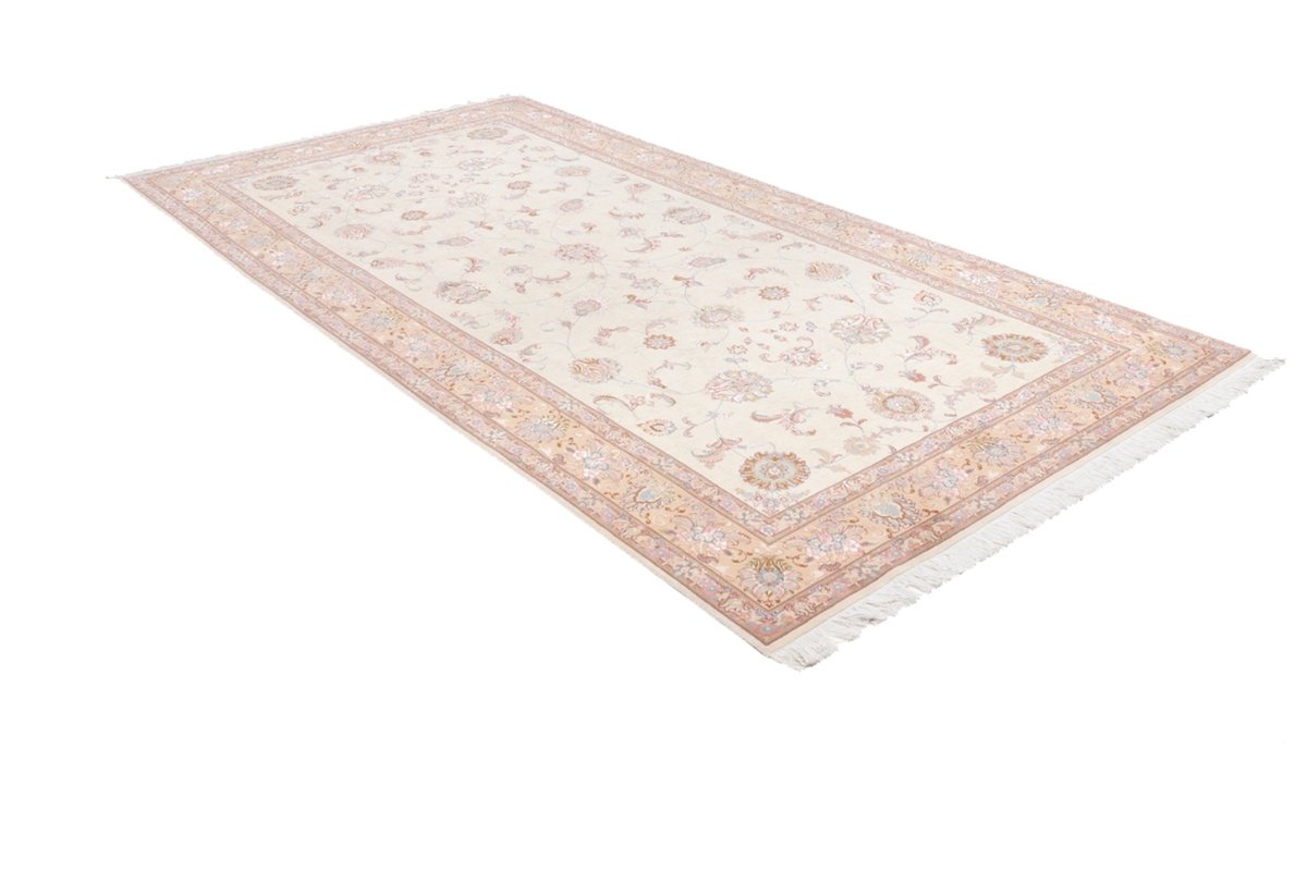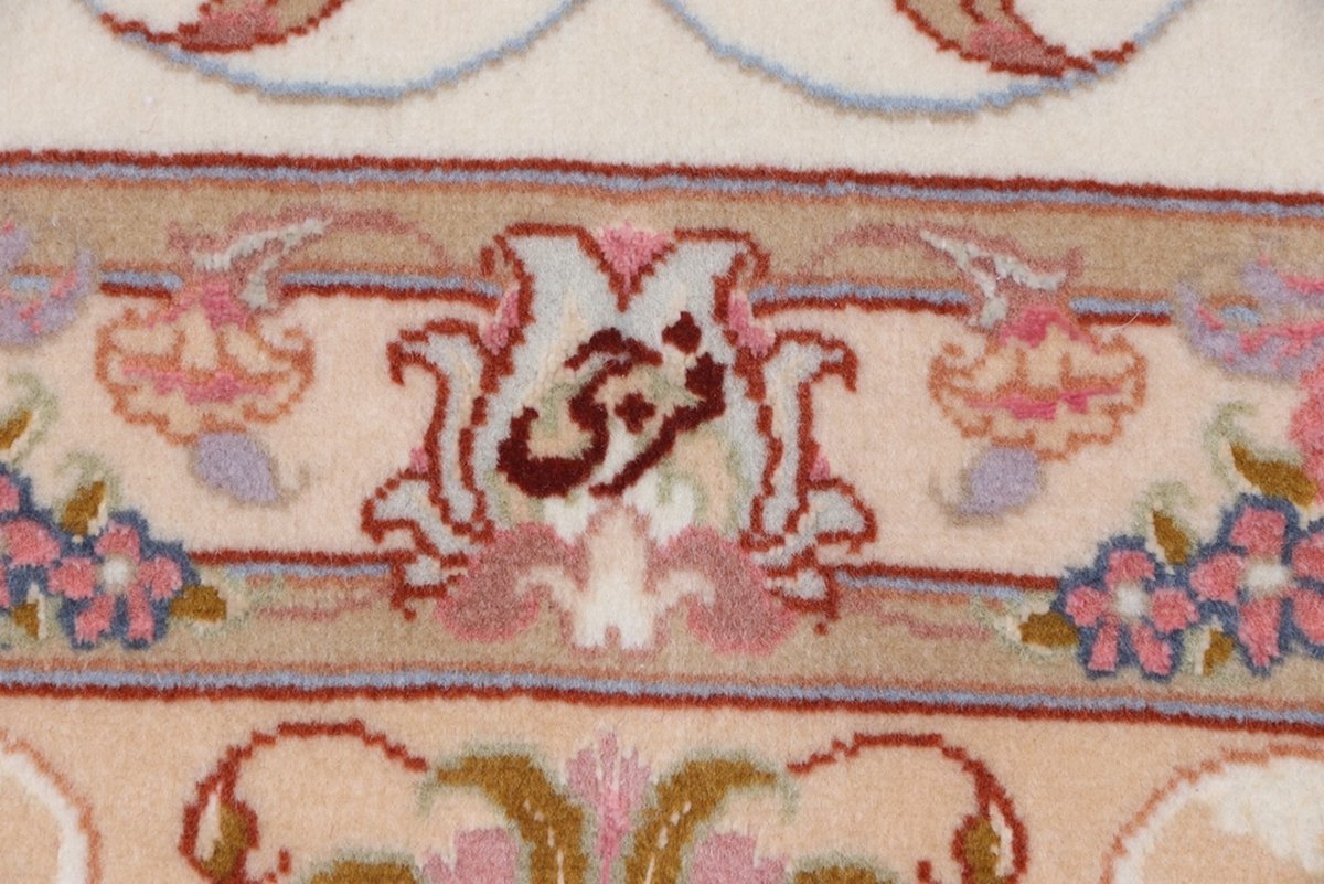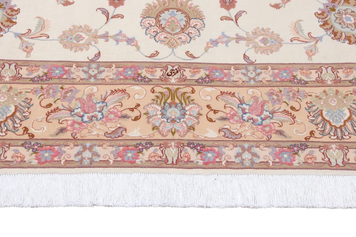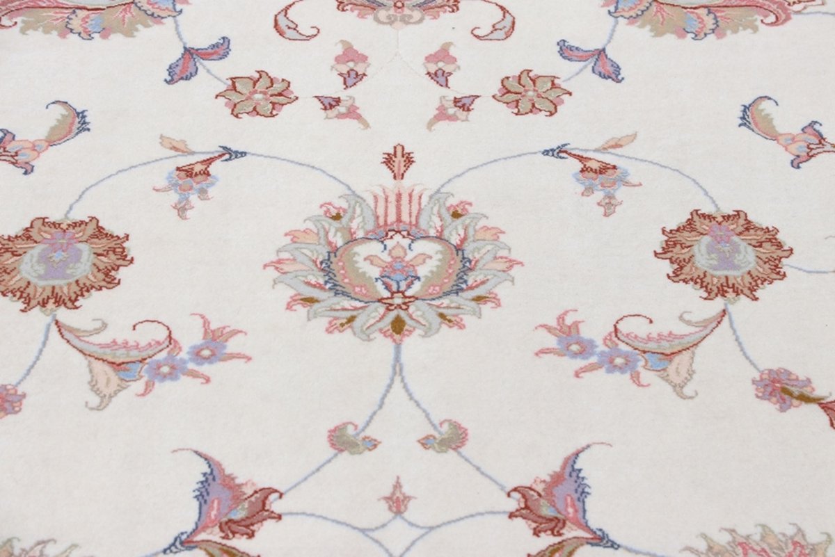 Für die besondere Eleganz des Täbriz-Flors sorgen hervorragende Materialien wie samtig anmutende Korkwolle und glänzende Seidenfäden. Die Knüpfqualität eines Täbriz-Teppichs lässt sich aus der angegebenen Raj-Zahl erschließen – je höher diese ausfällt, umso feiner ist die Knüpfdichte, die eine Million und mehr Knoten pro Quadratmeter erreichen kann. Bei besonders feingeknüpften Qualitäten kommt für die Kette statt des üblichen Baumwollgarns sogar Seide zum Einsatz.