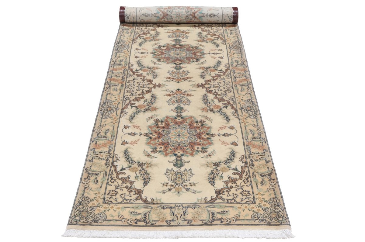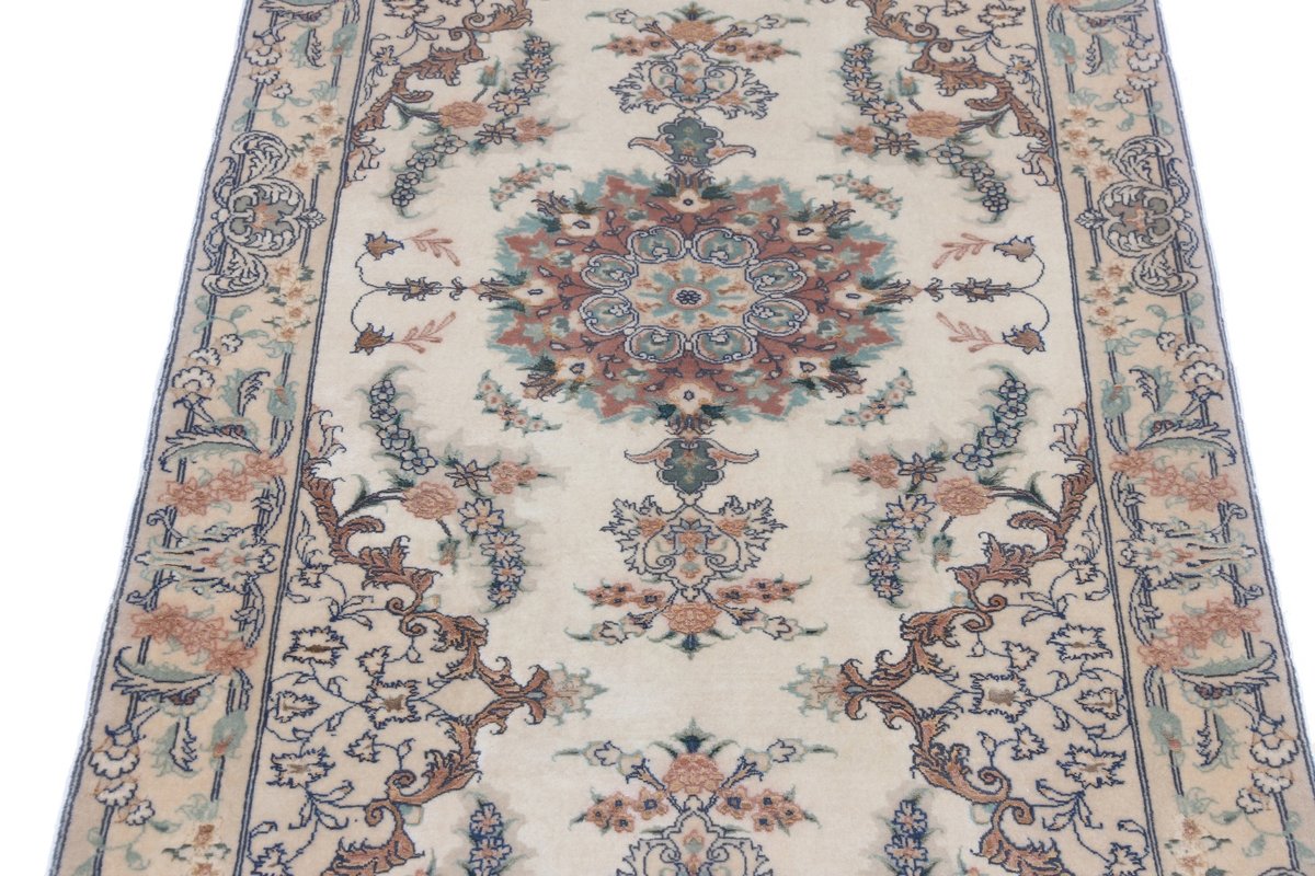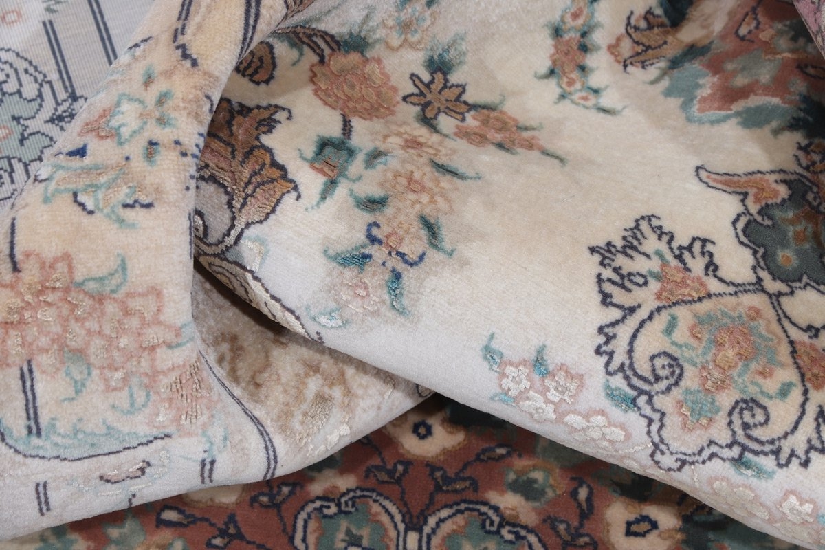 Für die besondere Eleganz des Täbriz-Flors sorgen hervorragende Materialien wie samtig anmutende Korkwolle und glänzende Seidenfäden. Die Knüpfqualität eines Täbriz-Teppichs lässt sich aus der angegebenen Raj-Zahl erschließen – je höher diese ausfällt, umso feiner ist die Knüpfdichte, die eine Million und mehr Knoten pro Quadratmeter erreichen kann. Bei besonders feingeknüpften Qualitäten kommt für die Kette statt des üblichen Baumwollgarns sogar Seide zum Einsatz.