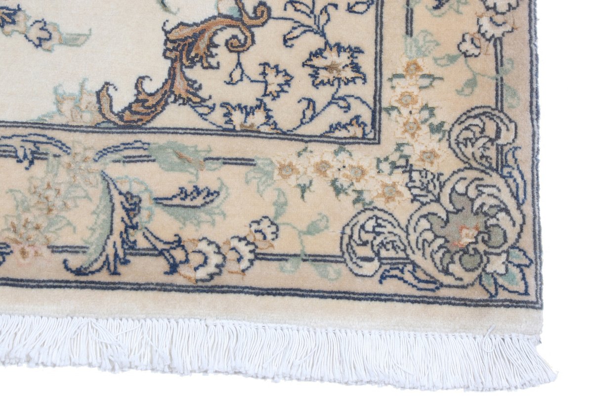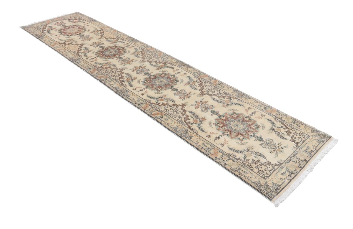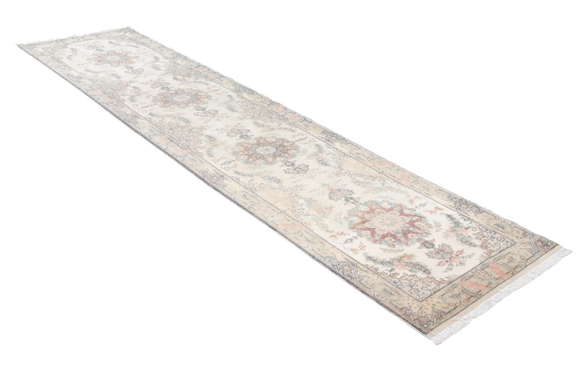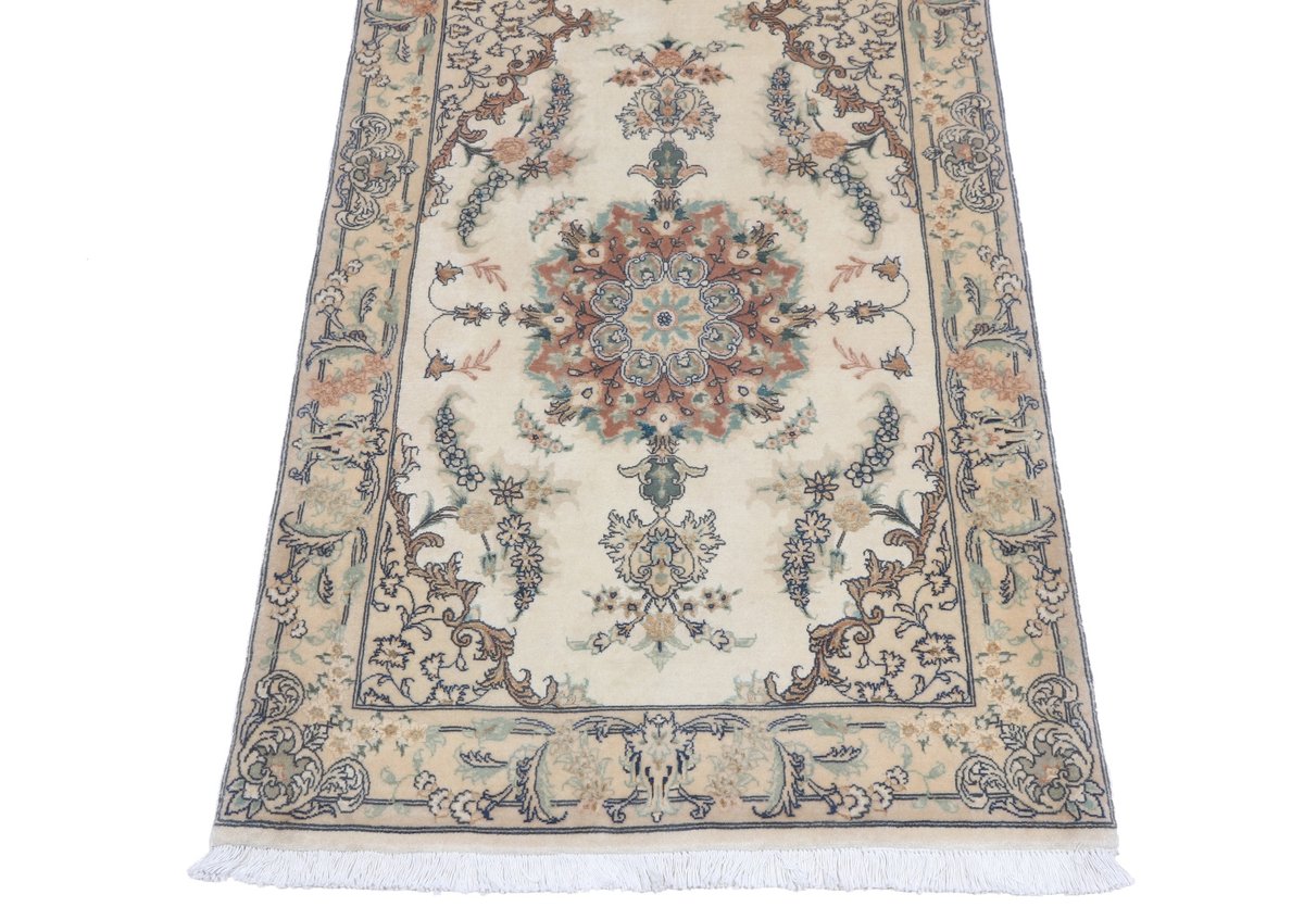 Für die besondere Eleganz des Täbriz-Flors sorgen hervorragende Materialien wie samtig anmutende Korkwolle und glänzende Seidenfäden. Die Knüpfqualität eines Täbriz-Teppichs lässt sich aus der angegebenen Raj-Zahl erschließen – je höher diese ausfällt, umso feiner ist die Knüpfdichte, die eine Million und mehr Knoten pro Quadratmeter erreichen kann. Bei besonders feingeknüpften Qualitäten kommt für die Kette statt des üblichen Baumwollgarns sogar Seide zum Einsatz.