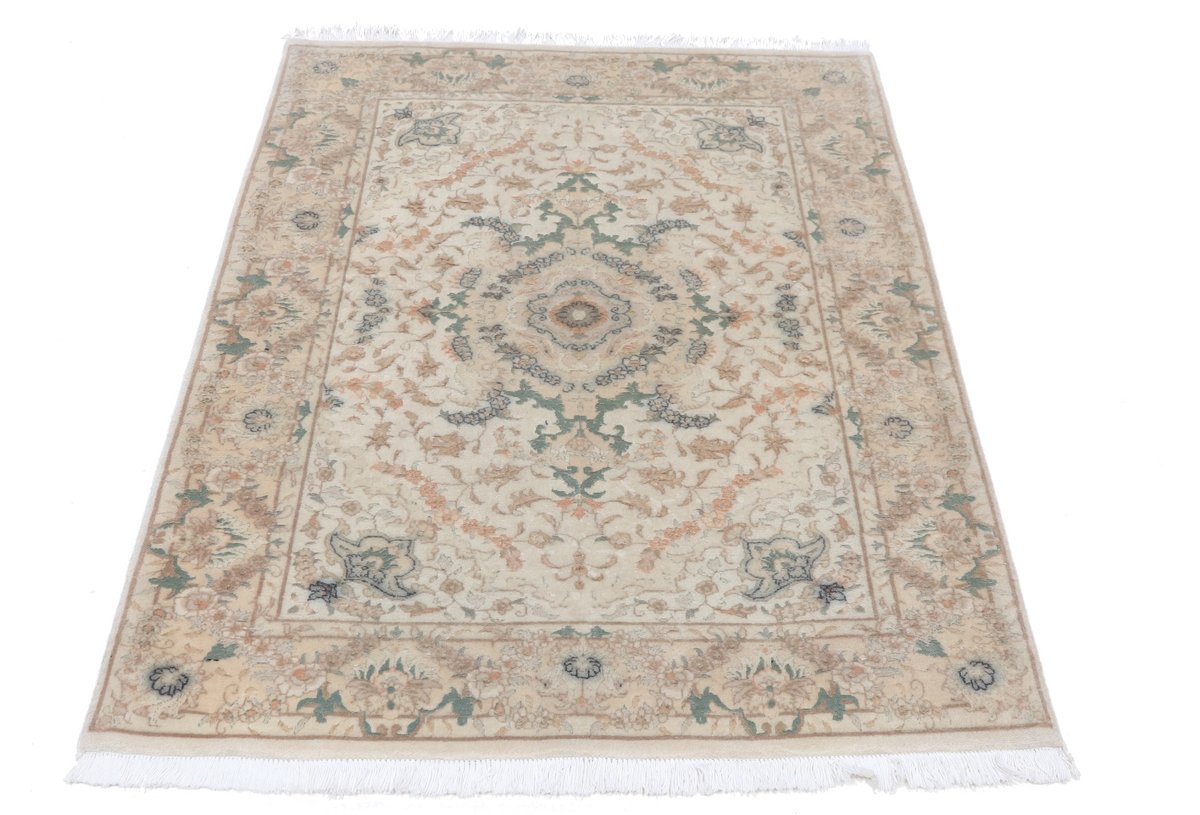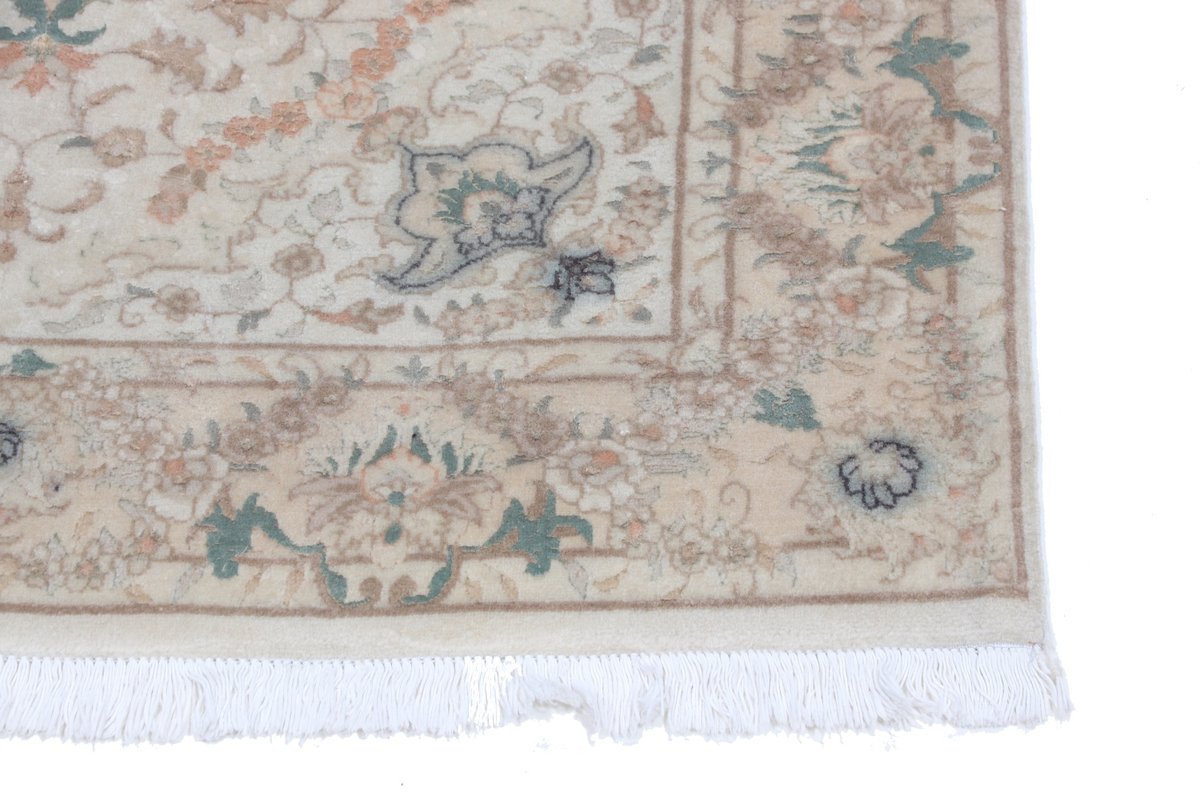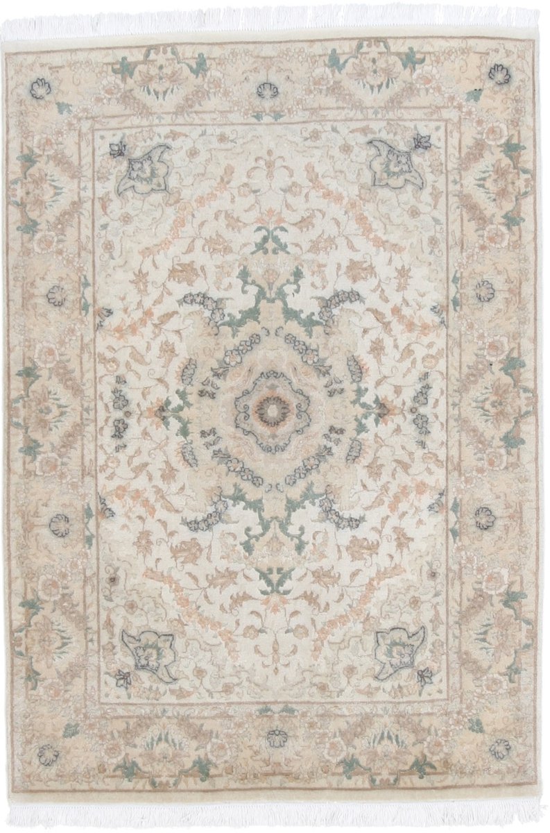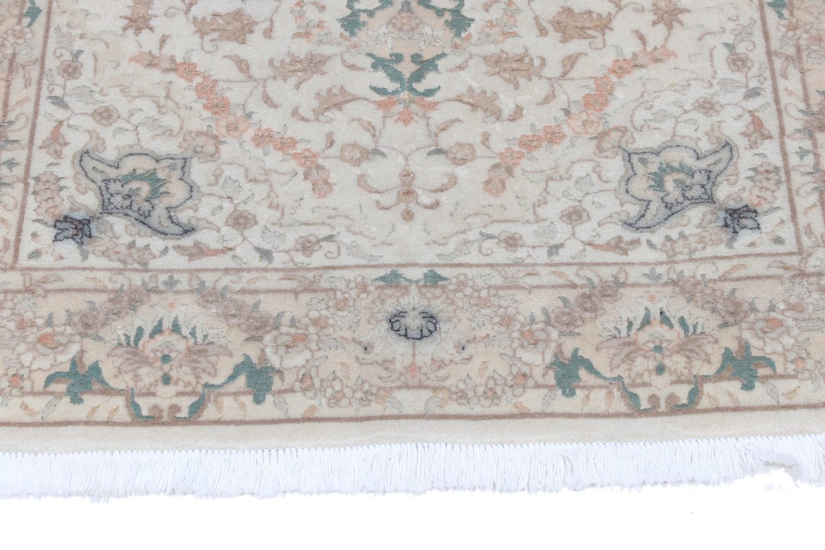 Für die besondere Eleganz des Täbriz-Flors sorgen hervorragende Materialien wie samtig anmutende Korkwolle und glänzende Seidenfäden. Die Knüpfqualität eines Täbriz-Teppichs lässt sich aus der angegebenen Raj-Zahl erschließen – je höher diese ausfällt, umso feiner ist die Knüpfdichte, die eine Million und mehr Knoten pro Quadratmeter erreichen kann. Bei besonders feingeknüpften Qualitäten kommt für die Kette statt des üblichen Baumwollgarns sogar Seide zum Einsatz.