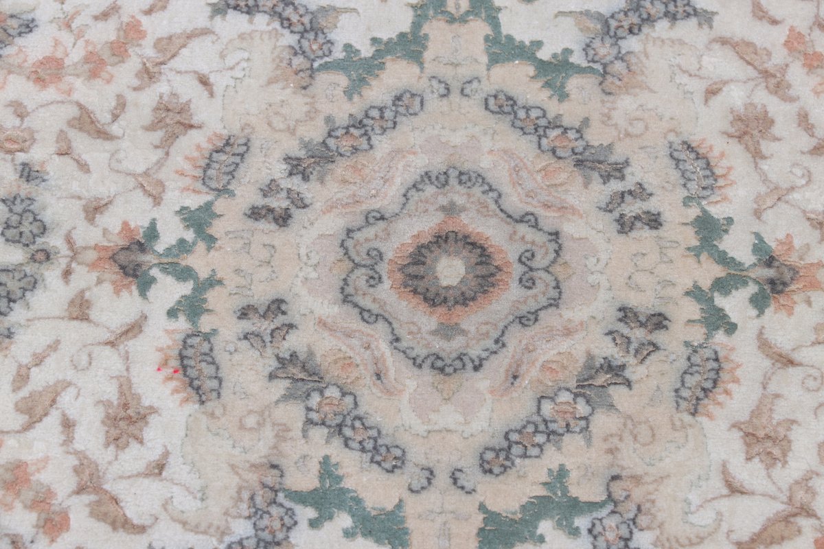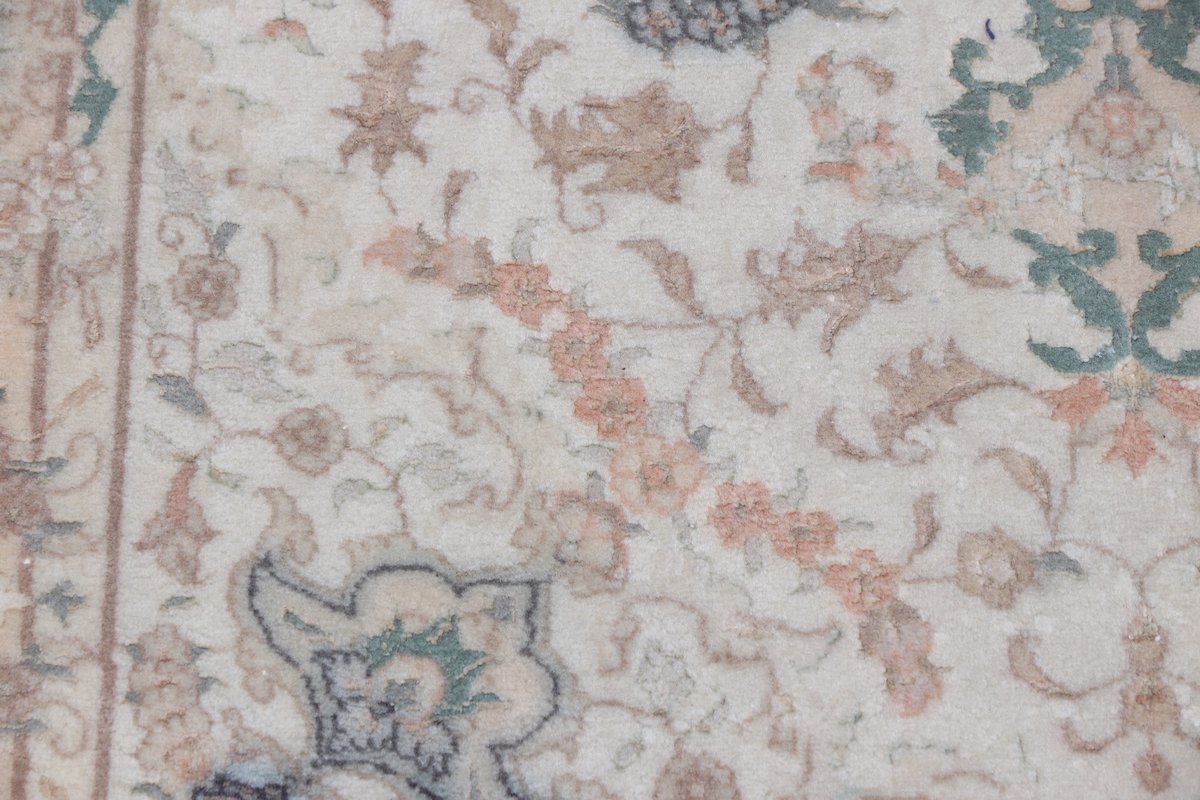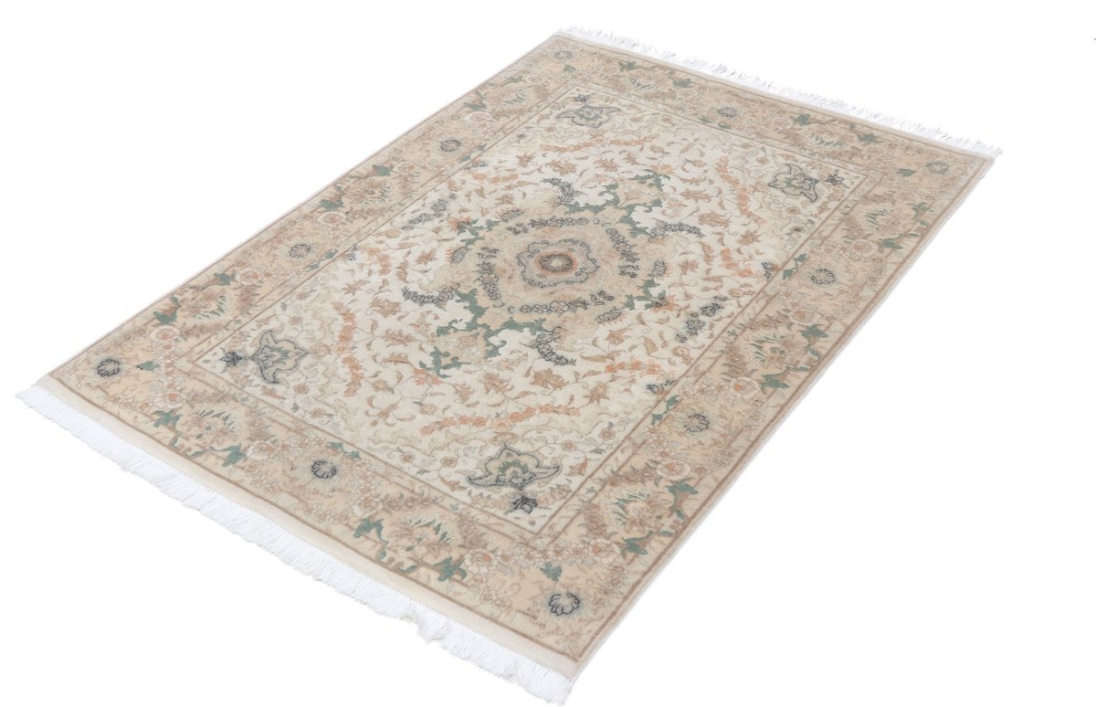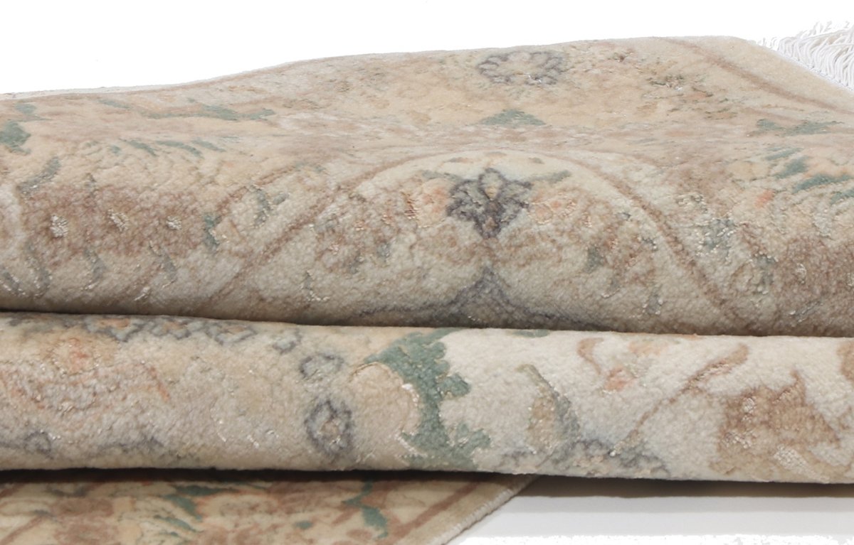 Für die besondere Eleganz des Täbriz-Flors sorgen hervorragende Materialien wie samtig anmutende Korkwolle und glänzende Seidenfäden. Die Knüpfqualität eines Täbriz-Teppichs lässt sich aus der angegebenen Raj-Zahl erschließen – je höher diese ausfällt, umso feiner ist die Knüpfdichte, die eine Million und mehr Knoten pro Quadratmeter erreichen kann. Bei besonders feingeknüpften Qualitäten kommt für die Kette statt des üblichen Baumwollgarns sogar Seide zum Einsatz.