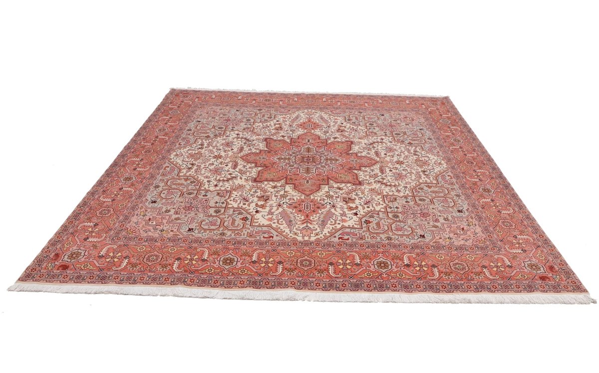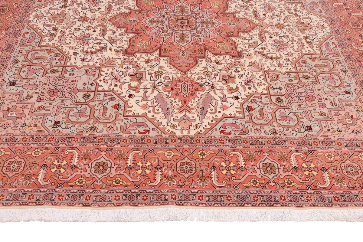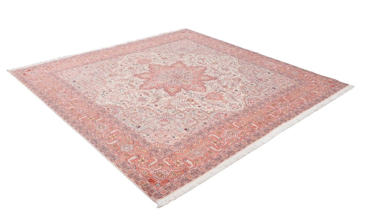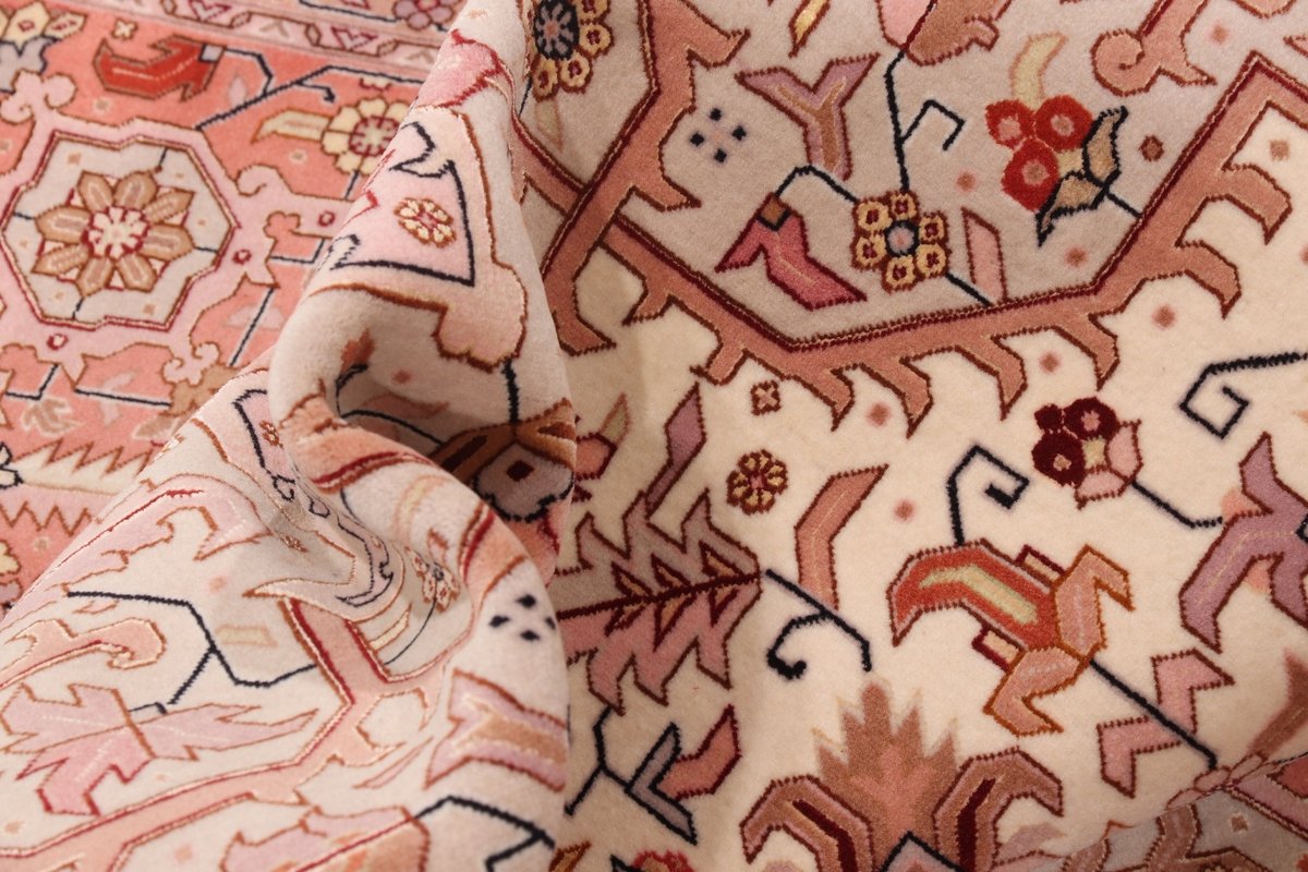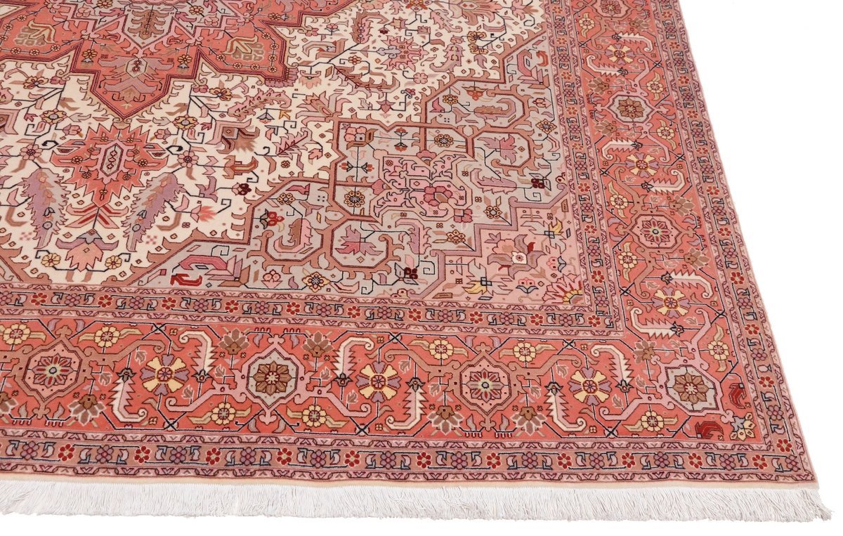 Für die besondere Eleganz des Täbriz-Flors sorgen hervorragende Materialien wie samtig anmutende Korkwolle und glänzende Seidenfäden. Die Knüpfqualität eines Täbriz-Teppichs lässt sich aus der angegebenen Raj-Zahl erschließen – je höher diese ausfällt, umso feiner ist die Knüpfdichte, die eine Million und mehr Knoten pro Quadratmeter erreichen kann. Bei besonders feingeknüpften Qualitäten kommt für die Kette statt des üblichen Baumwollgarns sogar Seide zum Einsatz.
