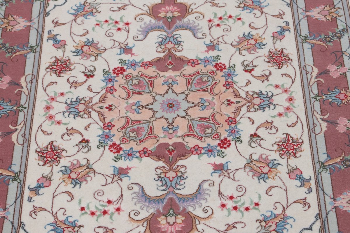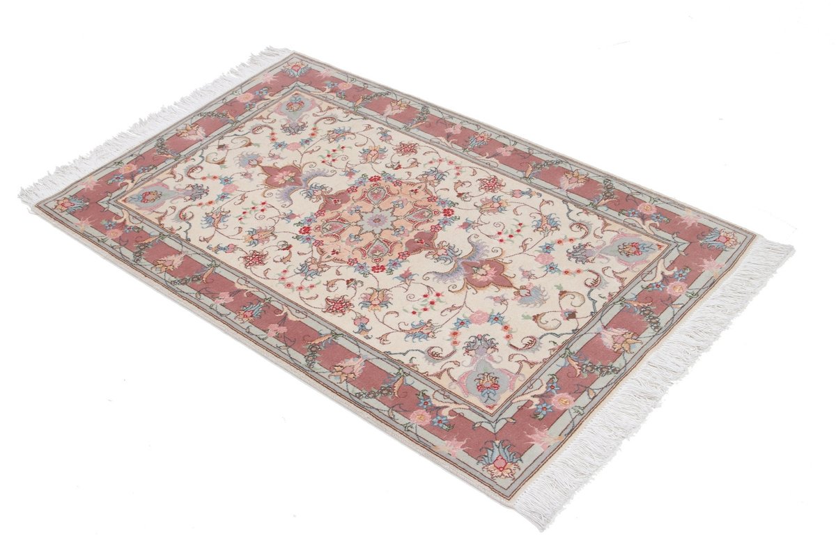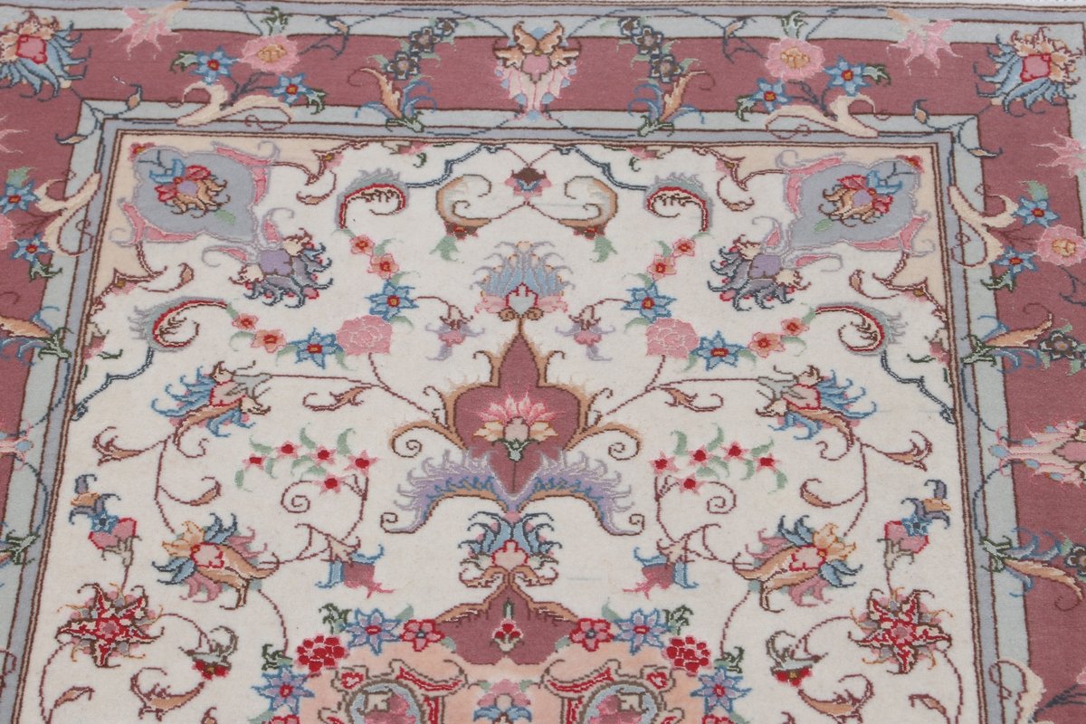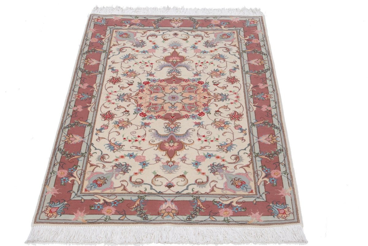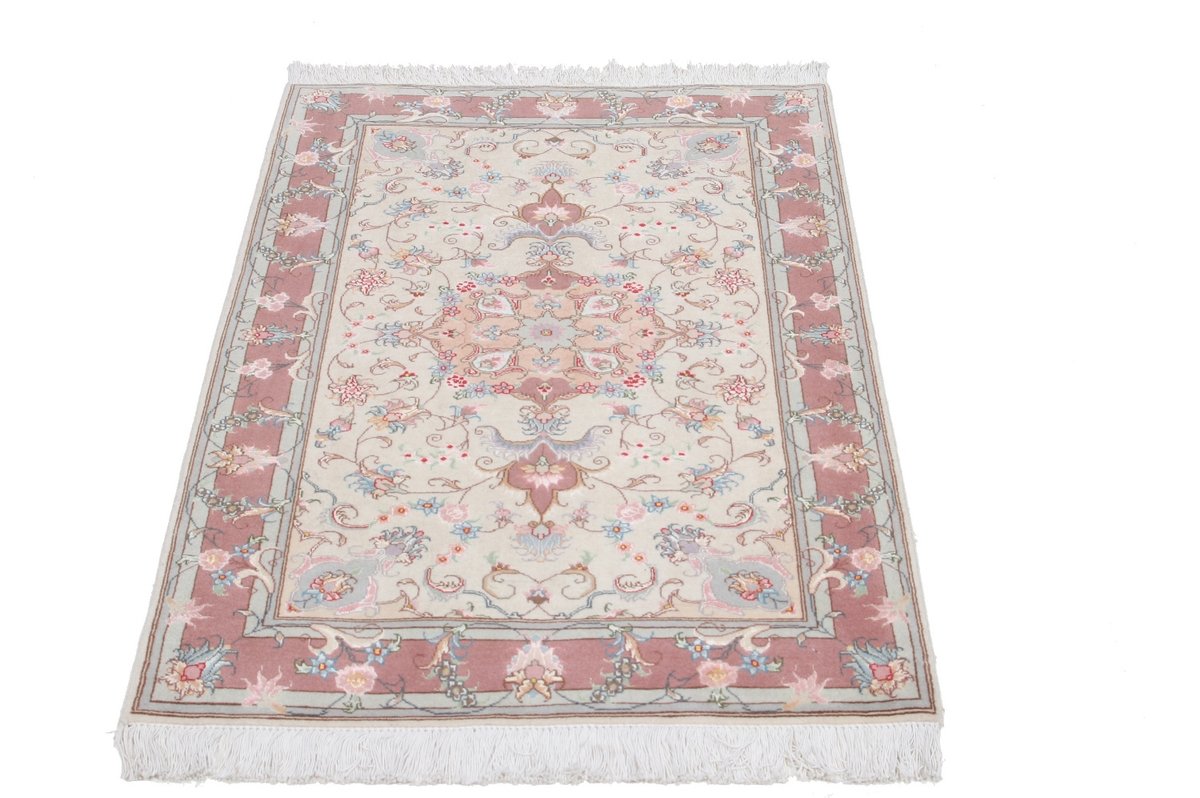 Für die besondere Eleganz des Täbriz-Flors sorgen hervorragende Materialien wie samtig anmutende Korkwolle und glänzende Seidenfäden. Die Knüpfqualität eines Täbriz-Teppichs lässt sich aus der angegebenen Raj-Zahl erschließen – je höher diese ausfällt, umso feiner ist die Knüpfdichte, die eine Million und mehr Knoten pro Quadratmeter erreichen kann. Bei besonders feingeknüpften Qualitäten kommt für die Kette statt des üblichen Baumwollgarns sogar Seide zum Einsatz.