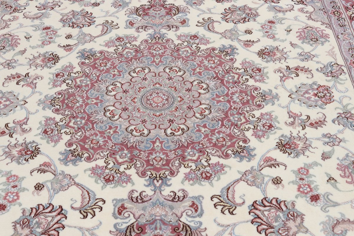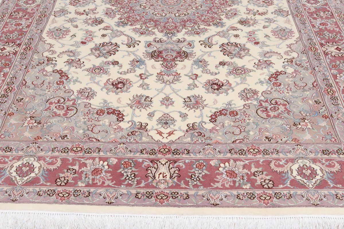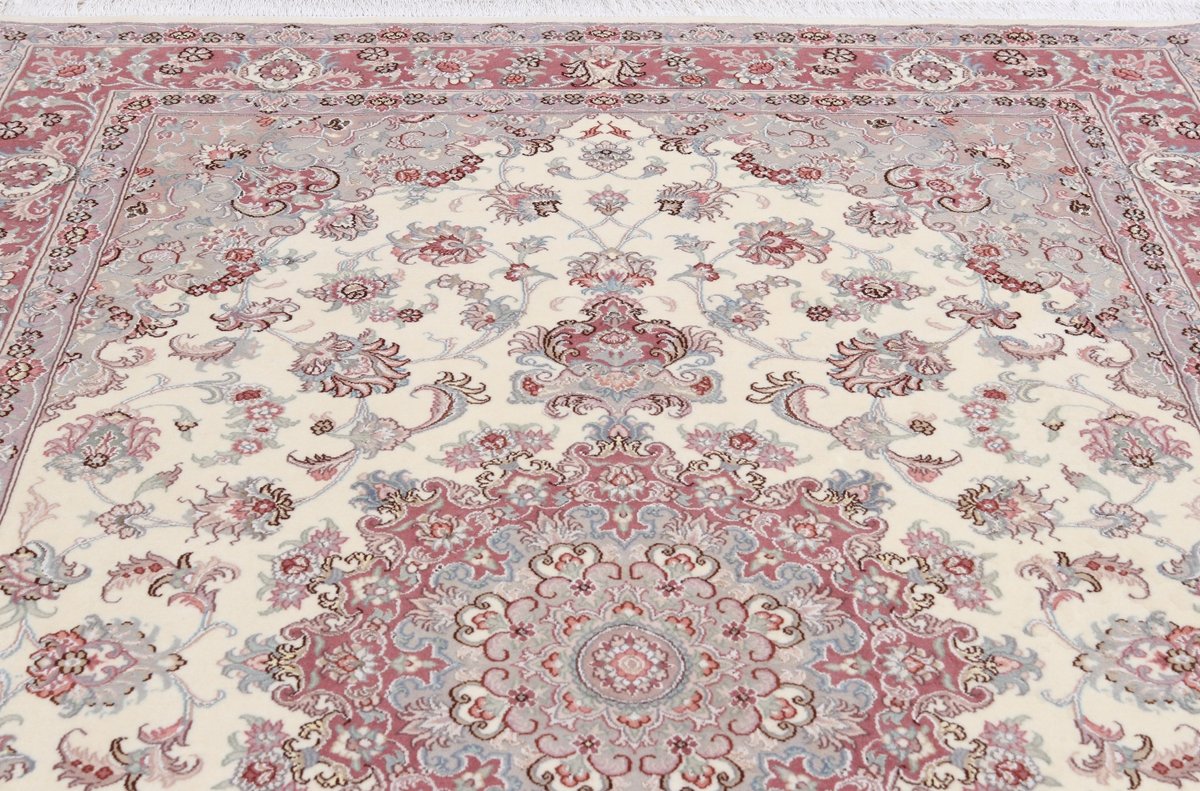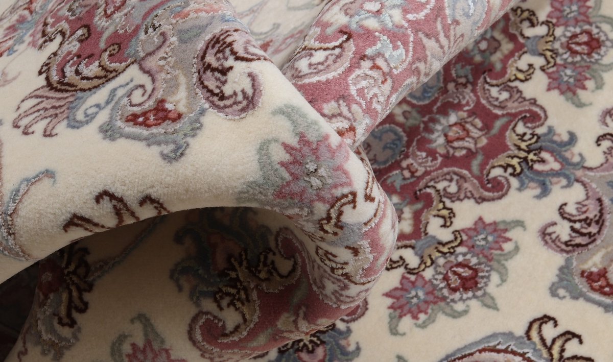 Für die besondere Eleganz des Täbriz-Flors sorgen hervorragende Materialien wie samtig anmutende Korkwolle und glänzende Seidenfäden. Die Knüpfqualität eines Täbriz-Teppichs lässt sich aus der angegebenen Raj-Zahl erschließen – je höher diese ausfällt, umso feiner ist die Knüpfdichte, die eine Million und mehr Knoten pro Quadratmeter erreichen kann. Bei besonders feingeknüpften Qualitäten kommt für die Kette statt des üblichen Baumwollgarns sogar Seide zum Einsatz.
