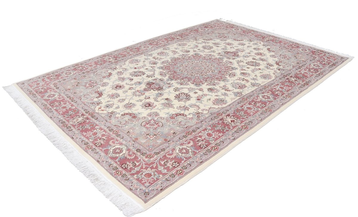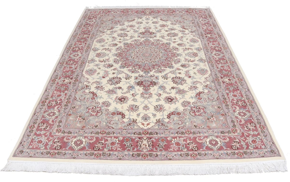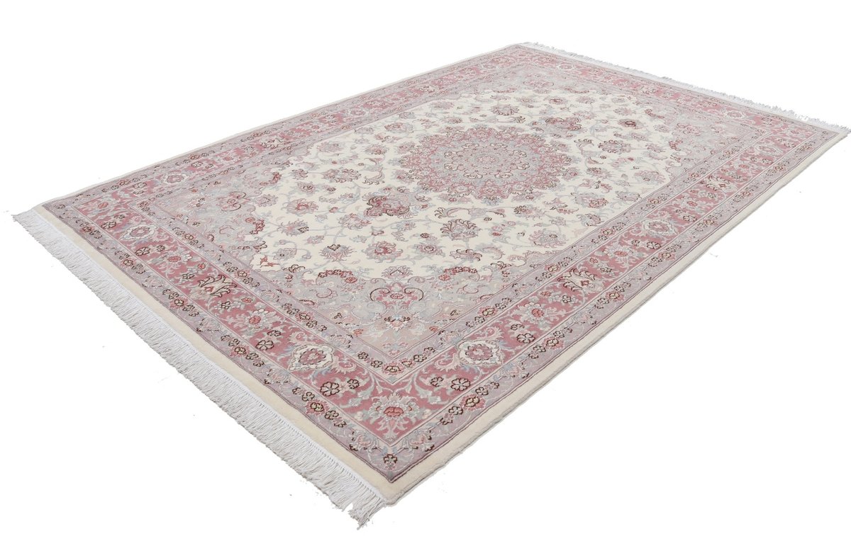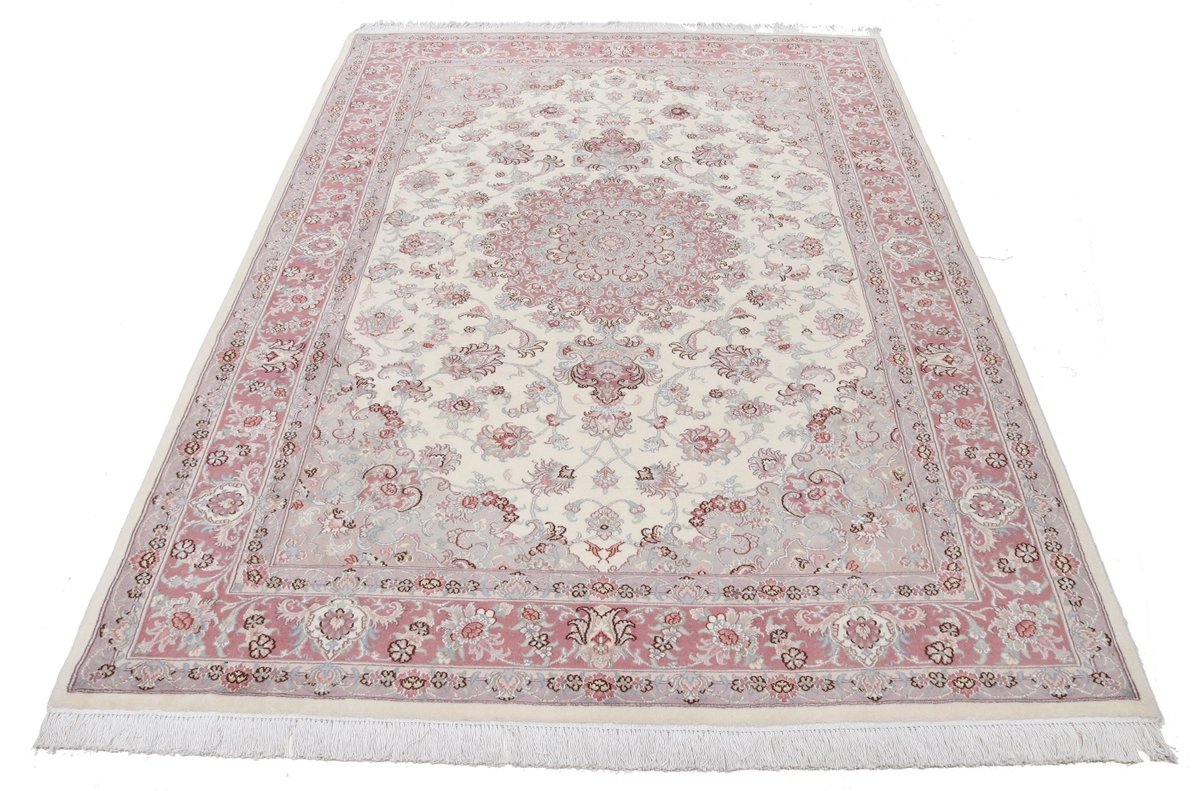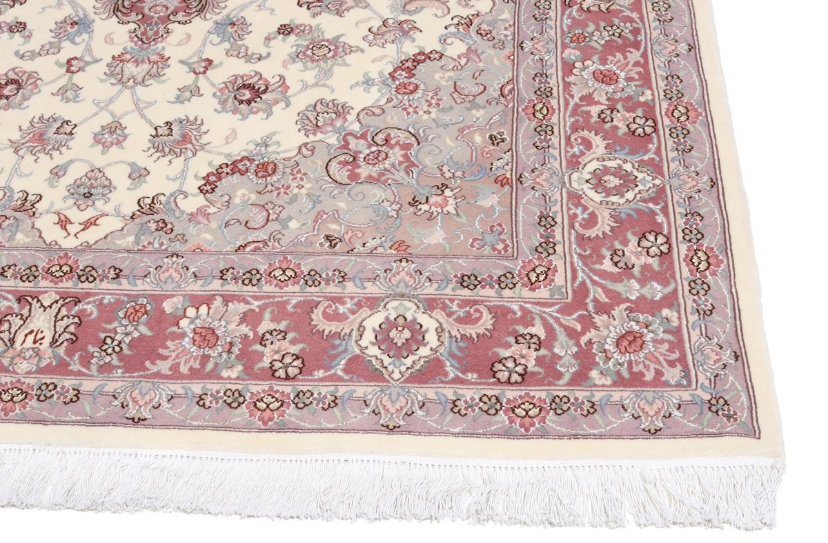 Für die besondere Eleganz des Täbriz-Flors sorgen hervorragende Materialien wie samtig anmutende Korkwolle und glänzende Seidenfäden. Die Knüpfqualität eines Täbriz-Teppichs lässt sich aus der angegebenen Raj-Zahl erschließen – je höher diese ausfällt, umso feiner ist die Knüpfdichte, die eine Million und mehr Knoten pro Quadratmeter erreichen kann. Bei besonders feingeknüpften Qualitäten kommt für die Kette statt des üblichen Baumwollgarns sogar Seide zum Einsatz.