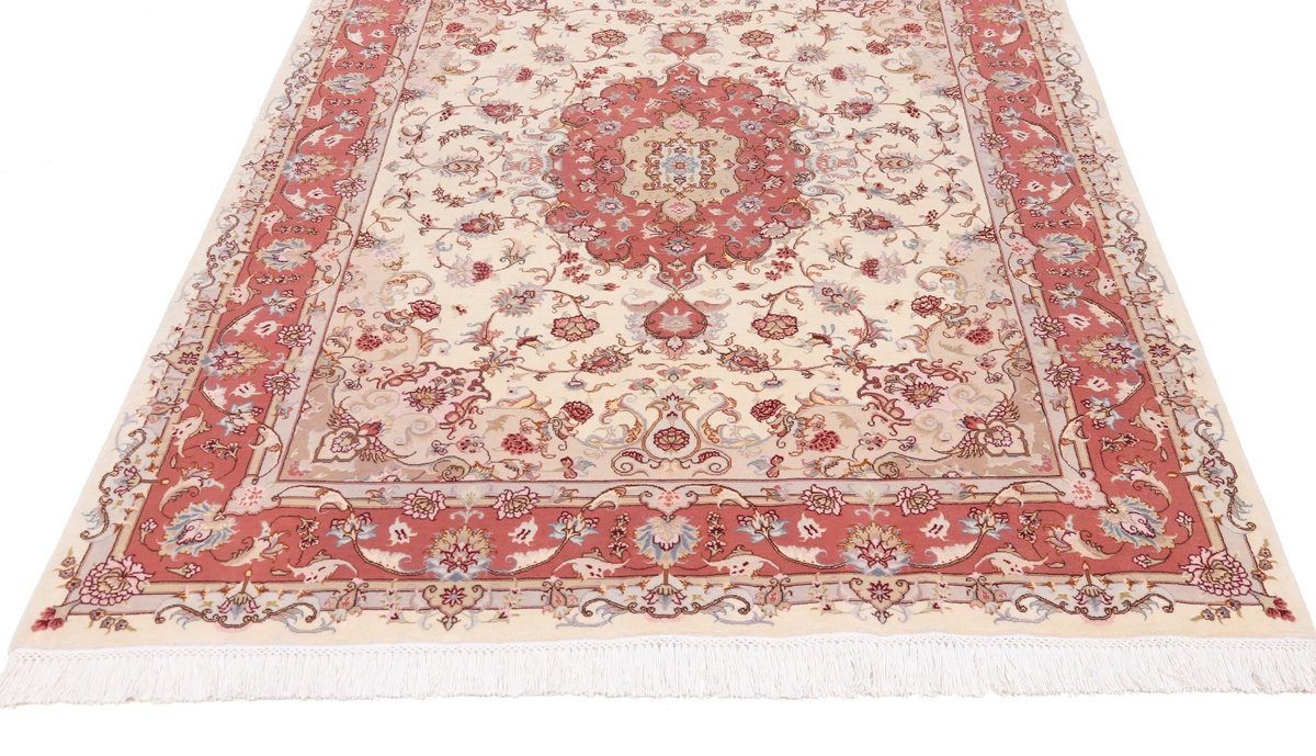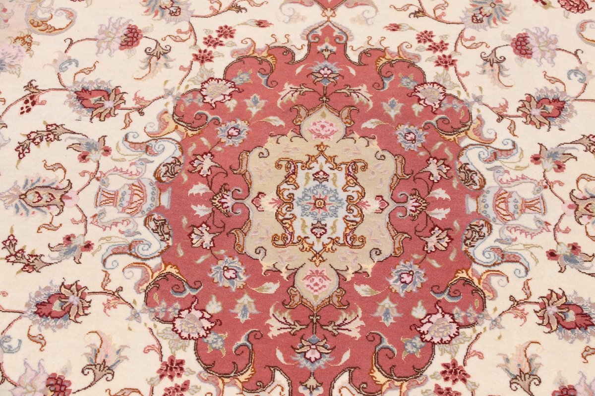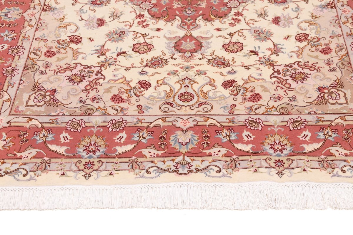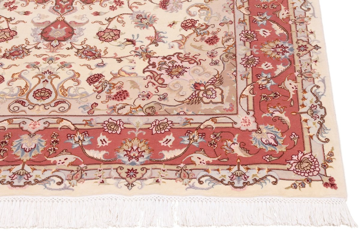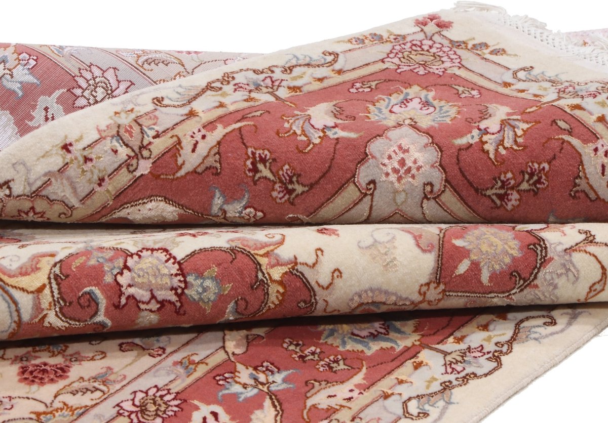 Für die besondere Eleganz des Täbriz-Flors sorgen hervorragende Materialien wie samtig anmutende Korkwolle und glänzende Seidenfäden. Die Knüpfqualität eines Täbriz-Teppichs lässt sich aus der angegebenen Raj-Zahl erschließen – je höher diese ausfällt, umso feiner ist die Knüpfdichte, die eine Million und mehr Knoten pro Quadratmeter erreichen kann. Bei besonders feingeknüpften Qualitäten kommt für die Kette statt des üblichen Baumwollgarns sogar Seide zum Einsatz.