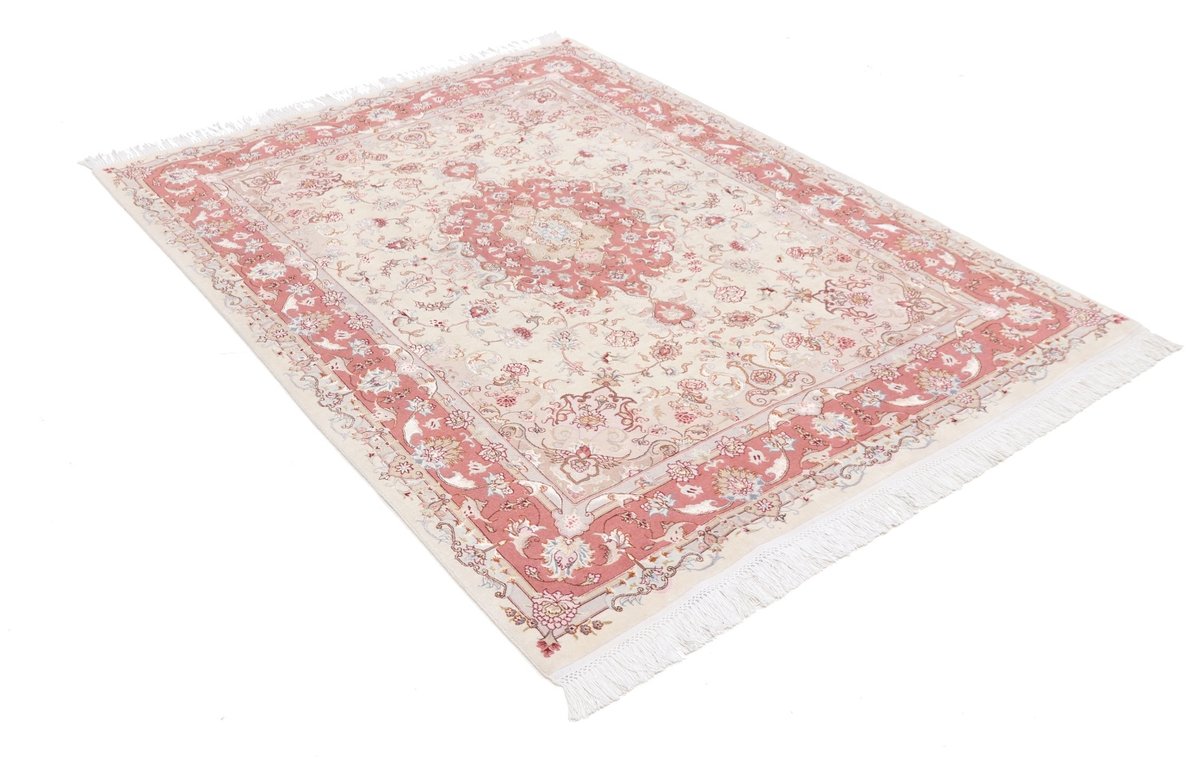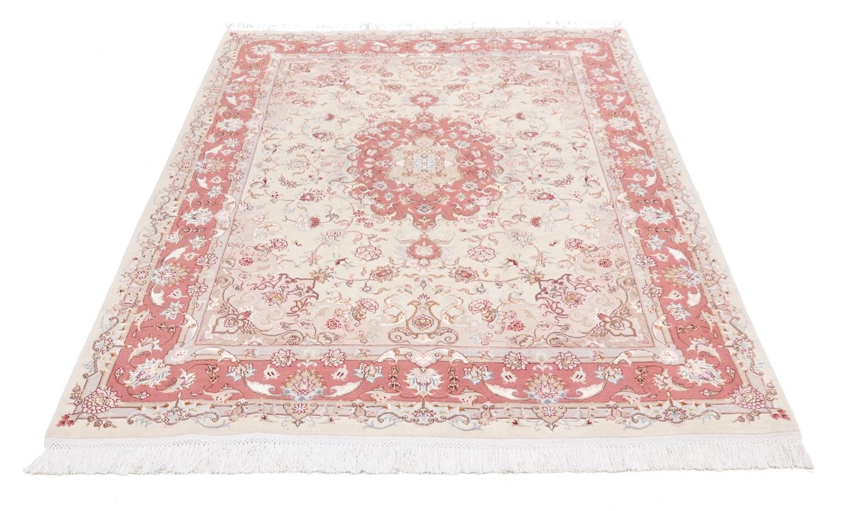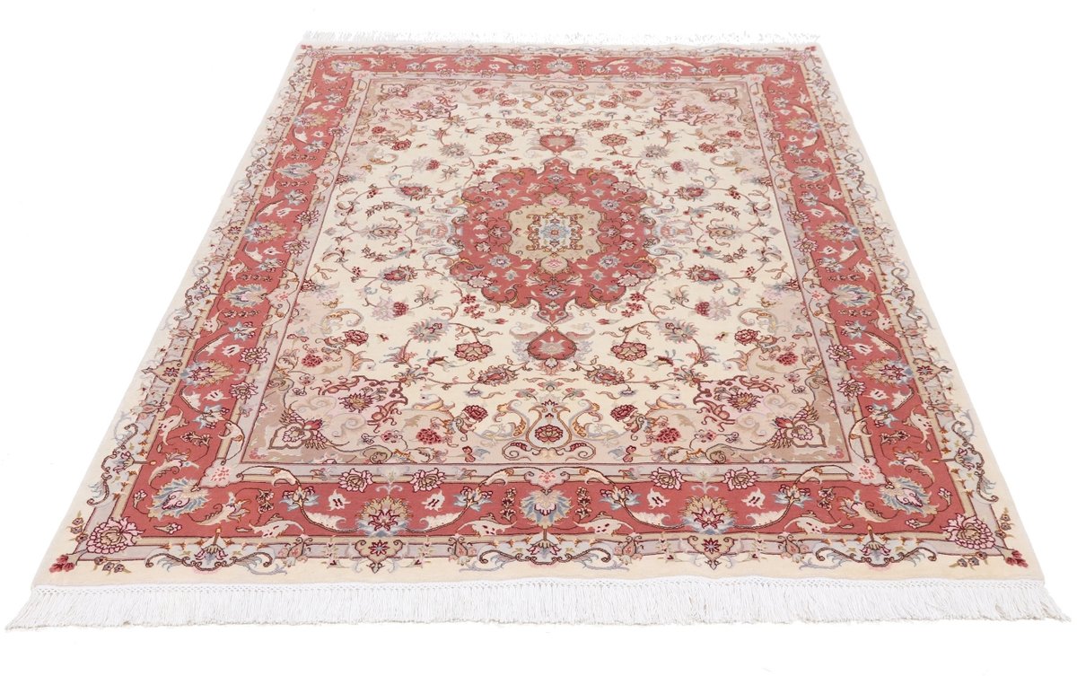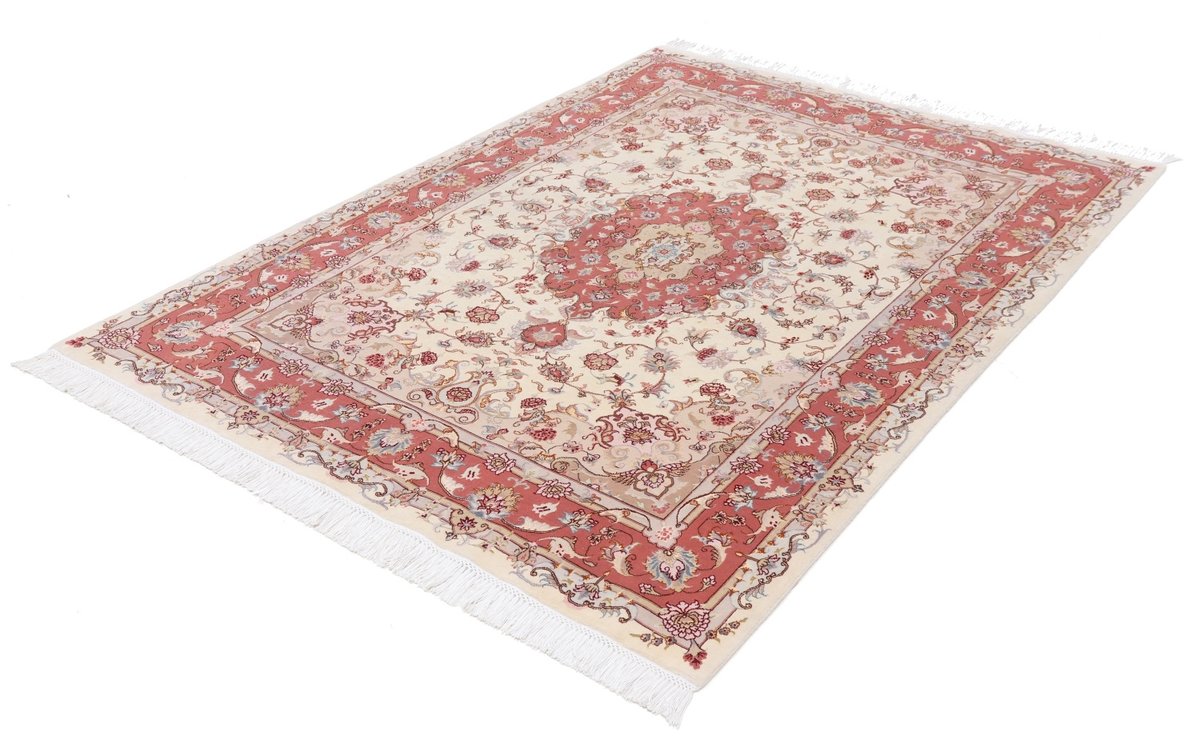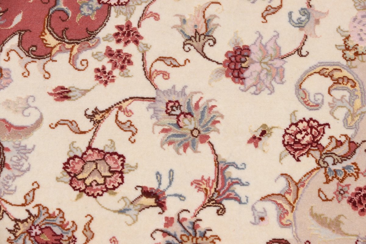 Für die besondere Eleganz des Täbriz-Flors sorgen hervorragende Materialien wie samtig anmutende Korkwolle und glänzende Seidenfäden. Die Knüpfqualität eines Täbriz-Teppichs lässt sich aus der angegebenen Raj-Zahl erschließen – je höher diese ausfällt, umso feiner ist die Knüpfdichte, die eine Million und mehr Knoten pro Quadratmeter erreichen kann. Bei besonders feingeknüpften Qualitäten kommt für die Kette statt des üblichen Baumwollgarns sogar Seide zum Einsatz.