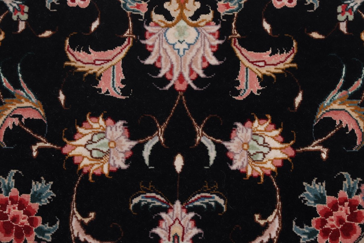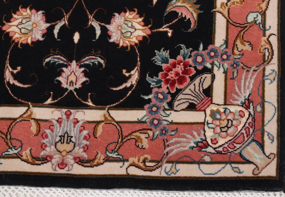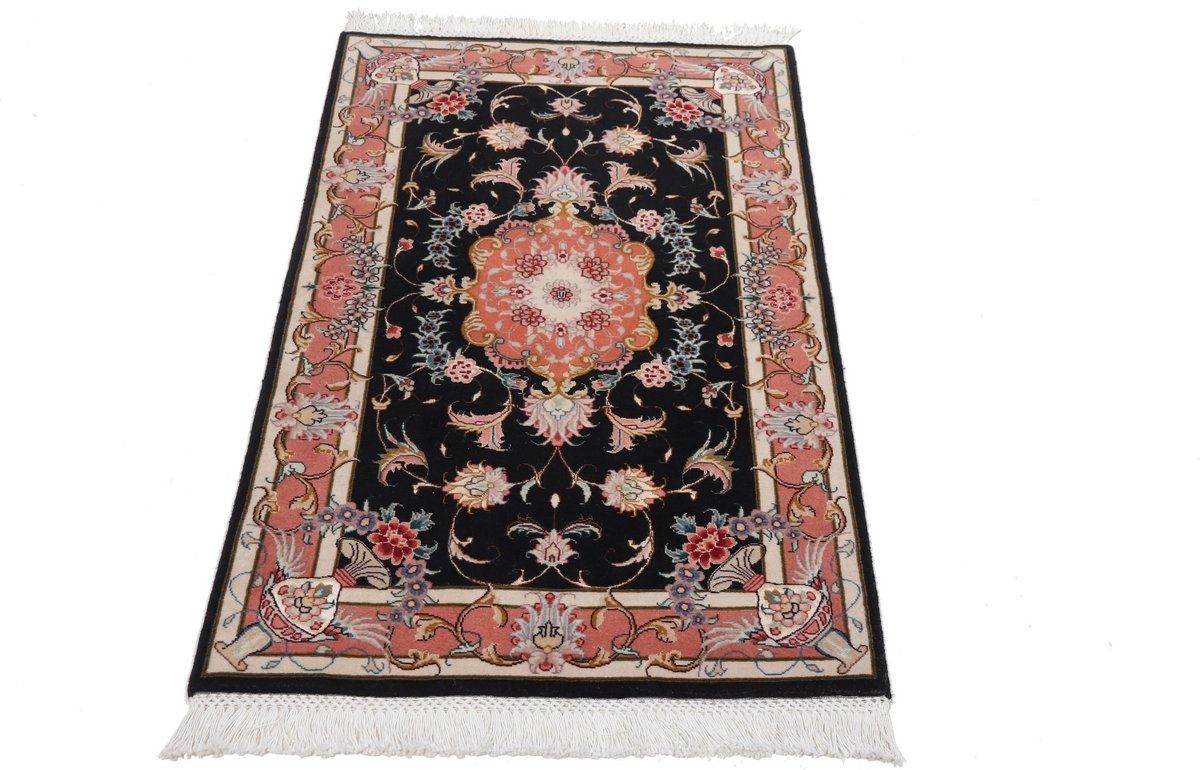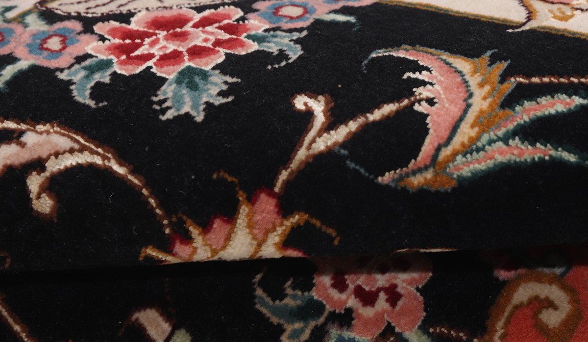 Für die besondere Eleganz des Täbriz-Flors sorgen hervorragende Materialien wie samtig anmutende Korkwolle und glänzende Seidenfäden. Die Knüpfqualität eines Täbriz-Teppichs lässt sich aus der angegebenen Raj-Zahl erschließen – je höher diese ausfällt, umso feiner ist die Knüpfdichte, die eine Million und mehr Knoten pro Quadratmeter erreichen kann. Bei besonders feingeknüpften Qualitäten kommt für die Kette statt des üblichen Baumwollgarns sogar Seide zum Einsatz.