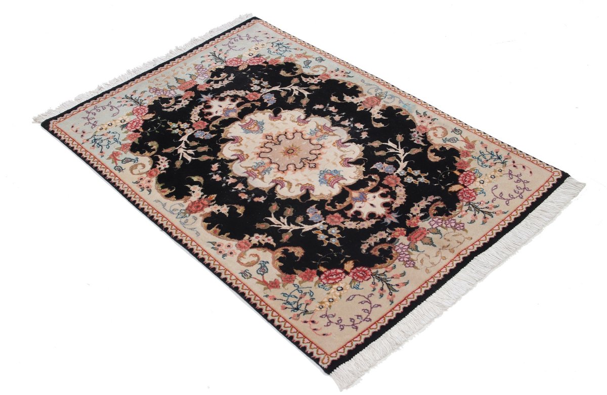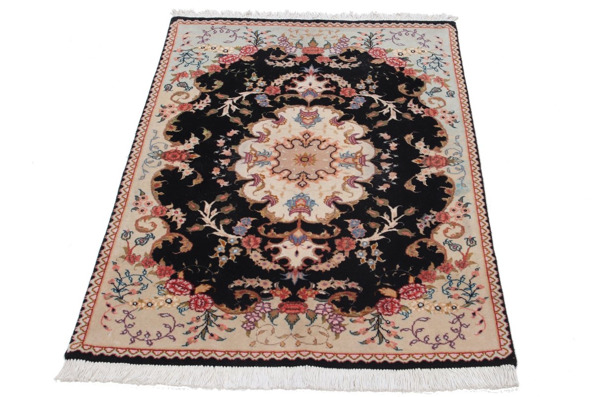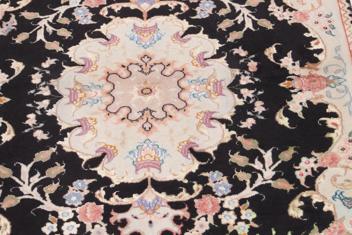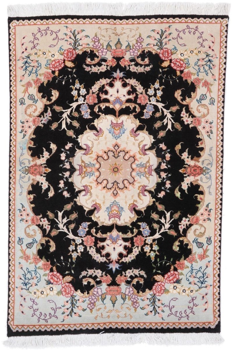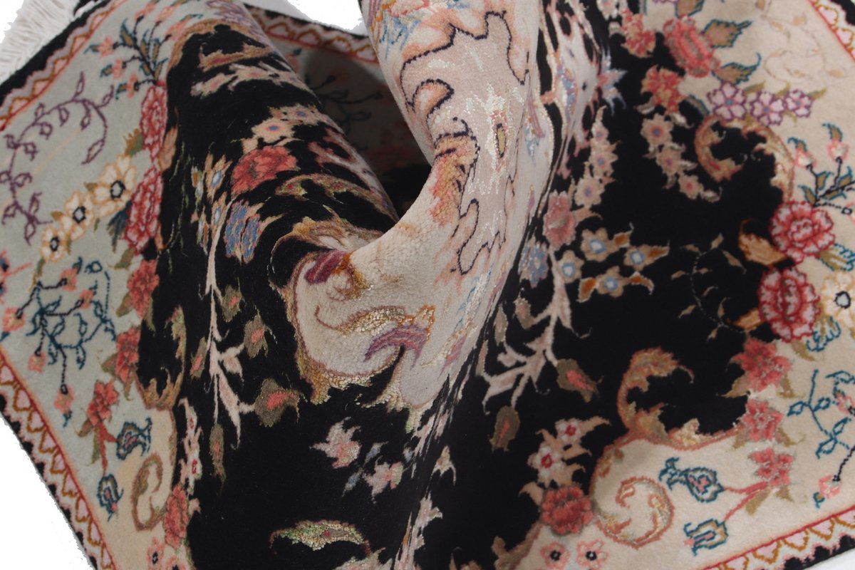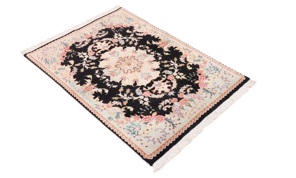 Für die besondere Eleganz des Täbriz-Flors sorgen hervorragende Materialien wie samtig anmutende Korkwolle und glänzende Seidenfäden. Die Knüpfqualität eines Täbriz-Teppichs lässt sich aus der angegebenen Raj-Zahl erschließen – je höher diese ausfällt, umso feiner ist die Knüpfdichte, die eine Million und mehr Knoten pro Quadratmeter erreichen kann. Bei besonders feingeknüpften Qualitäten kommt für die Kette statt des üblichen Baumwollgarns sogar Seide zum Einsatz.