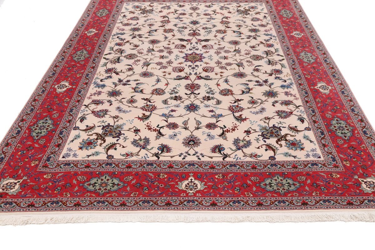 Für die besondere Eleganz des Täbriz-Flors sorgen hervorragende Materialien wie samtig anmutende Korkwolle und glänzende Seidenfäden. Die Knüpfqualität eines Täbriz-Teppichs lässt sich aus der angegebenen Raj-Zahl erschließen – je höher diese ausfällt, umso feiner ist die Knüpfdichte, die eine Million und mehr Knoten pro Quadratmeter erreichen kann. Bei besonders feingeknüpften Qualitäten kommt für die Kette statt des üblichen Baumwollgarns sogar Seide zum Einsatz.