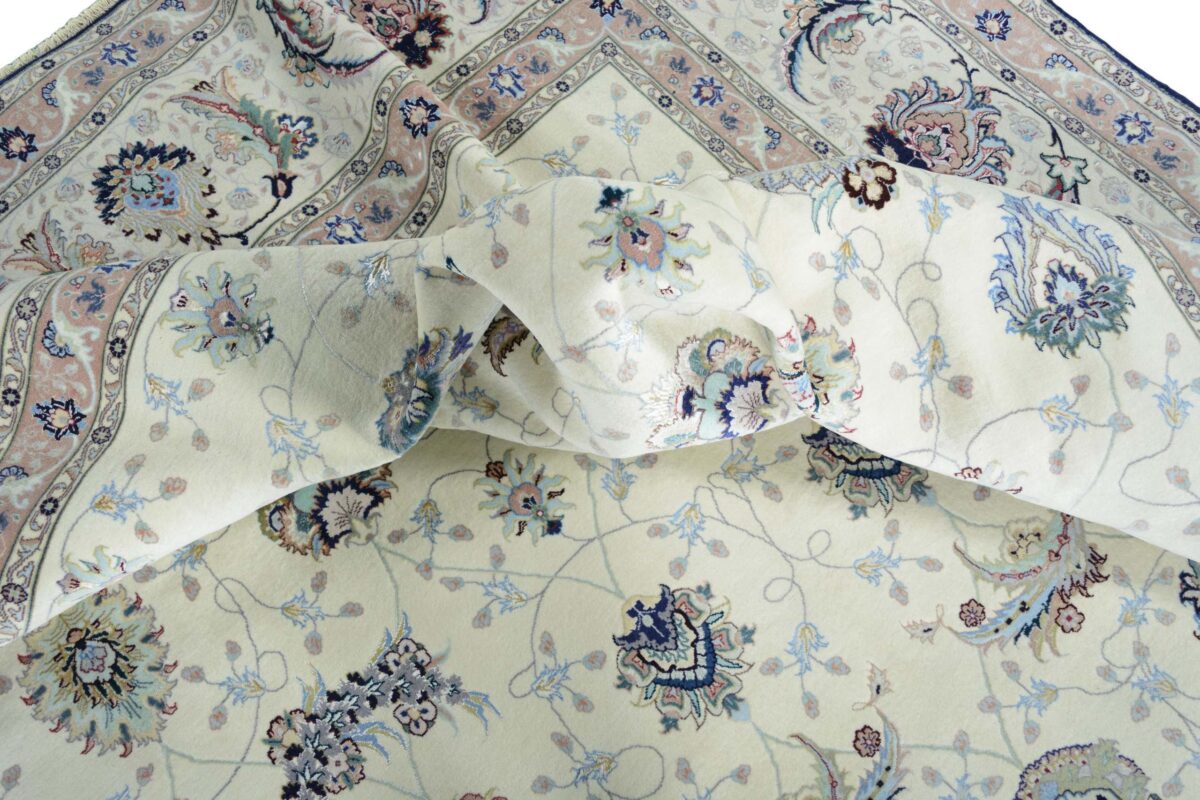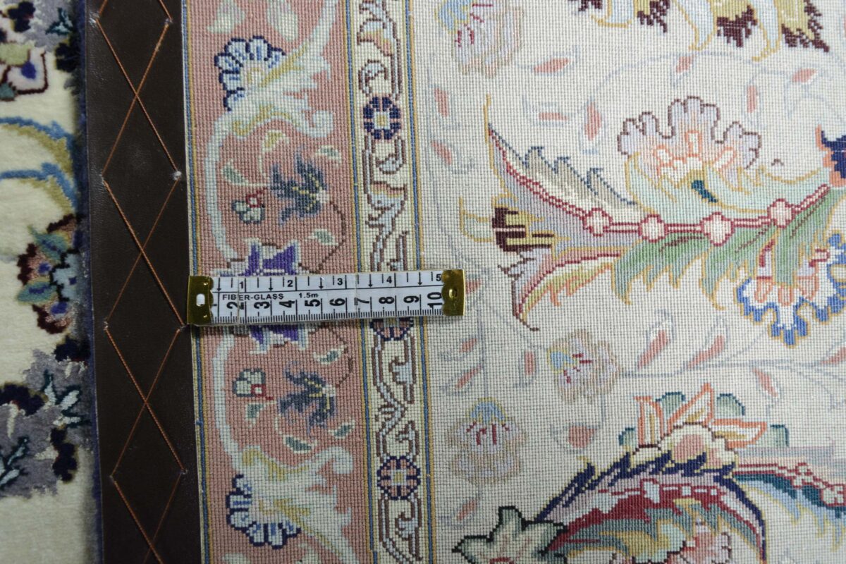 Für die besondere Eleganz des Täbriz-Flors sorgen hervorragende Materialien wie samtig anmutende Korkwolle und glänzende Seidenfäden. Die Knüpfqualität eines Täbriz-Teppichs lässt sich aus der angegebenen Raj-Zahl erschließen – je höher diese ausfällt, umso feiner ist die Knüpfdichte, die eine Million und mehr Knoten pro Quadratmeter erreichen kann. Bei besonders feingeknüpften Qualitäten kommt für die Kette statt des üblichen Baumwollgarns sogar Seide zum Einsatz.