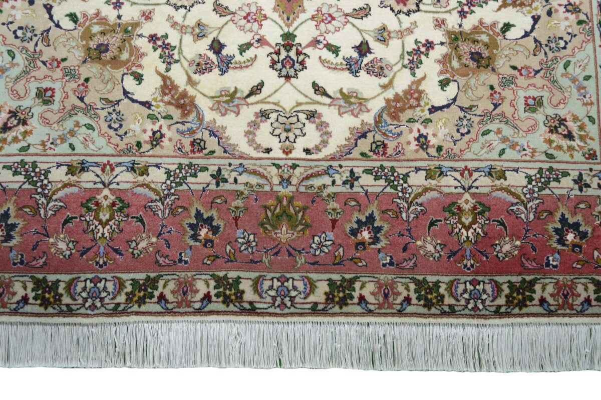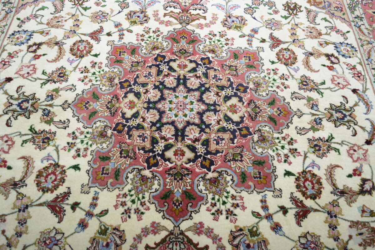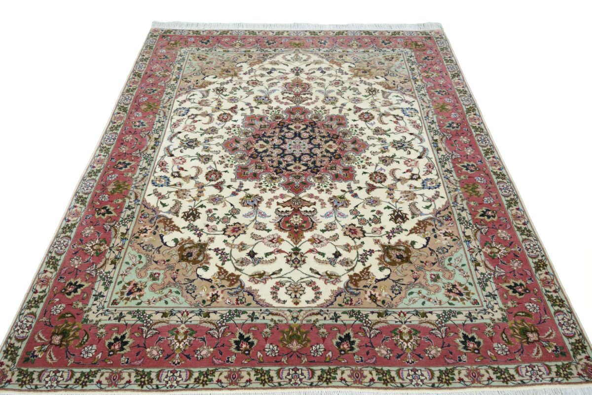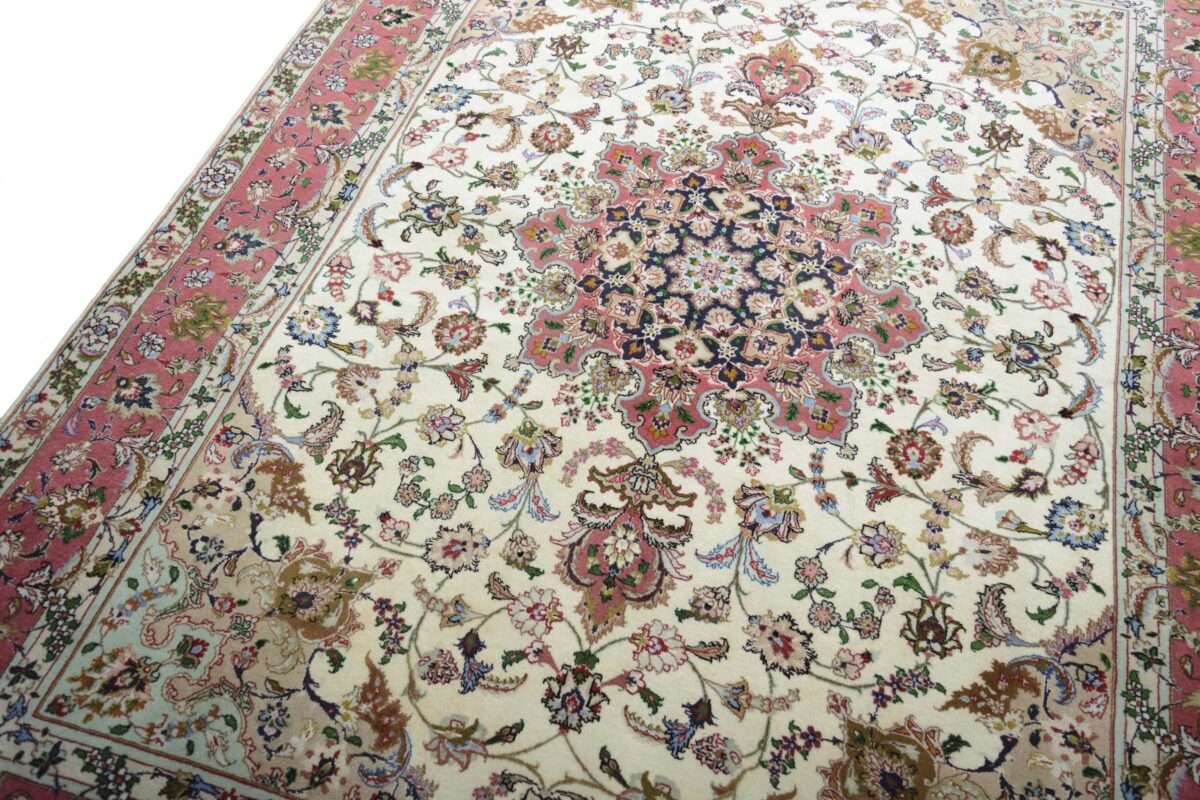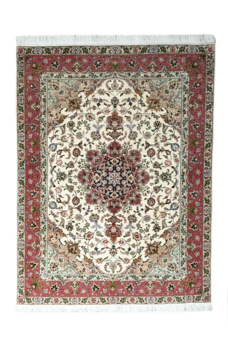 Für die besondere Eleganz des Täbriz-Flors sorgen hervorragende Materialien wie samtig anmutende Korkwolle und glänzende Seidenfäden. Die Knüpfqualität eines Täbriz-Teppichs lässt sich aus der angegebenen Raj-Zahl erschließen – je höher diese ausfällt, umso feiner ist die Knüpfdichte, die eine Million und mehr Knoten pro Quadratmeter erreichen kann. Bei besonders feingeknüpften Qualitäten kommt für die Kette statt des üblichen Baumwollgarns sogar Seide zum Einsatz.
