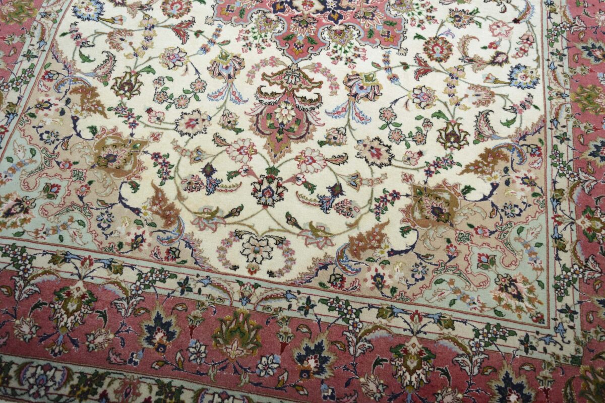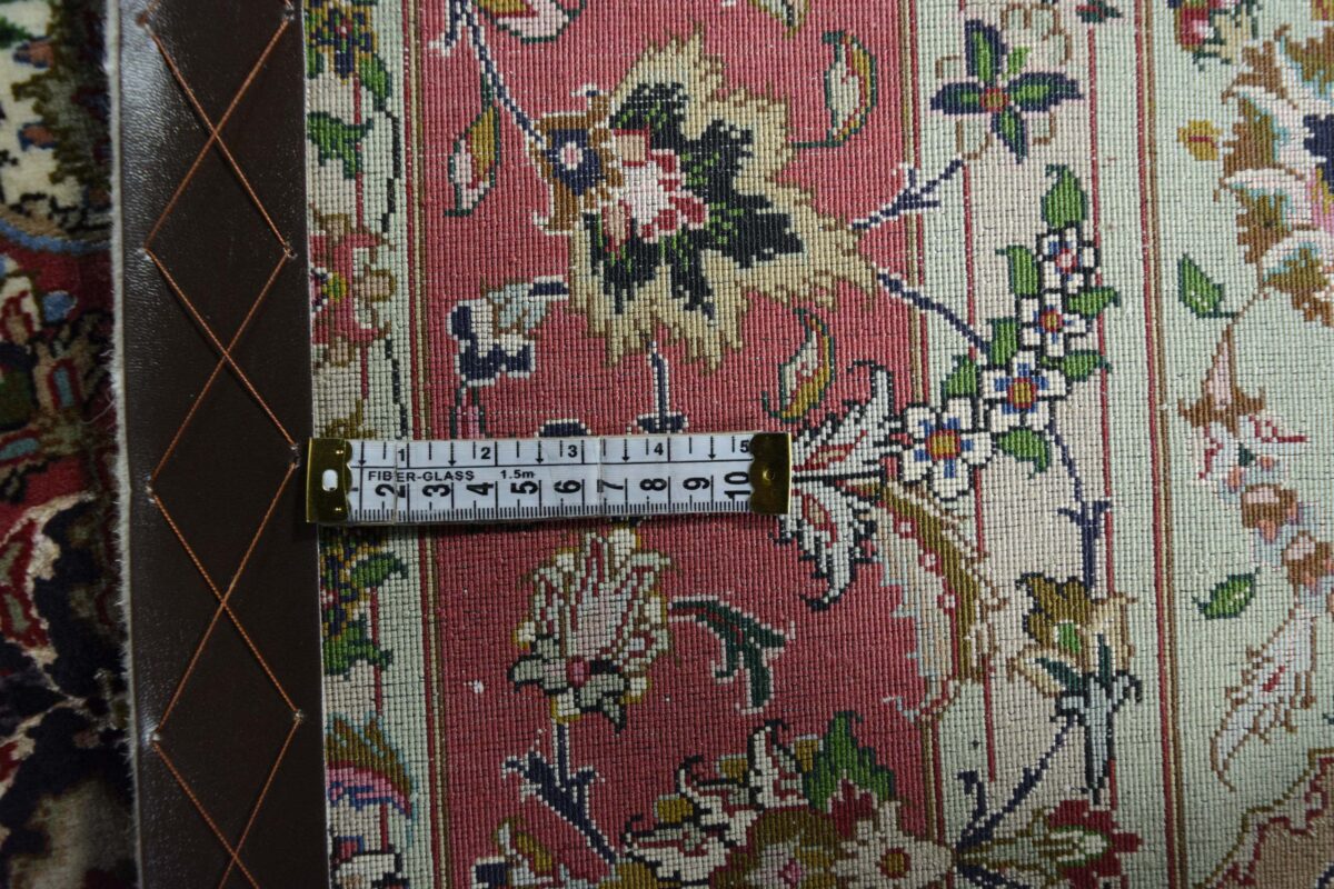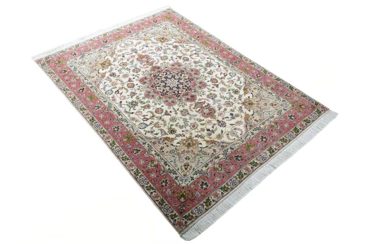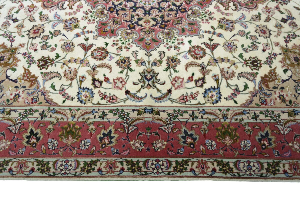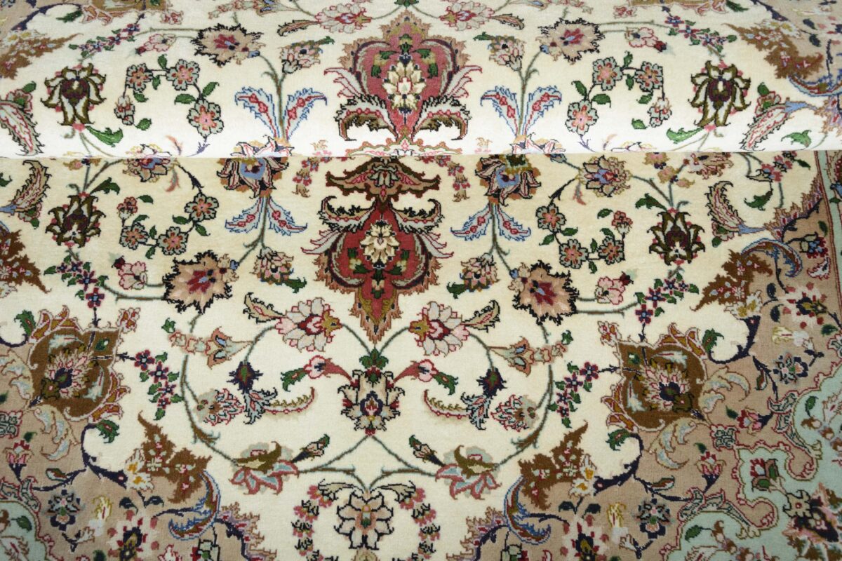Für die besondere Eleganz des Täbriz-Flors sorgen hervorragende Materialien wie samtig anmutende Korkwolle und glänzende Seidenfäden. Die Knüpfqualität eines Täbriz-Teppichs lässt sich aus der angegebenen Raj-Zahl erschließen – je höher diese ausfällt, umso feiner ist die Knüpfdichte, die eine Million und mehr Knoten pro Quadratmeter erreichen kann. Bei besonders feingeknüpften Qualitäten kommt für die Kette statt des üblichen Baumwollgarns sogar Seide zum Einsatz.