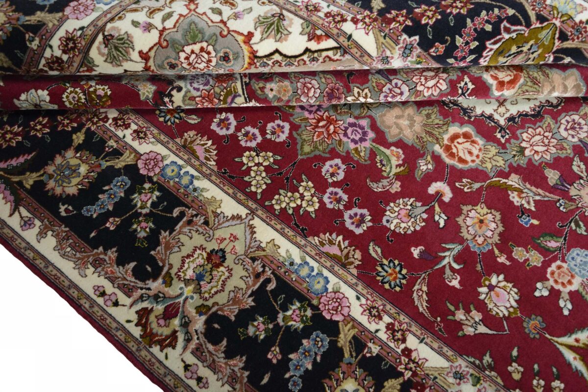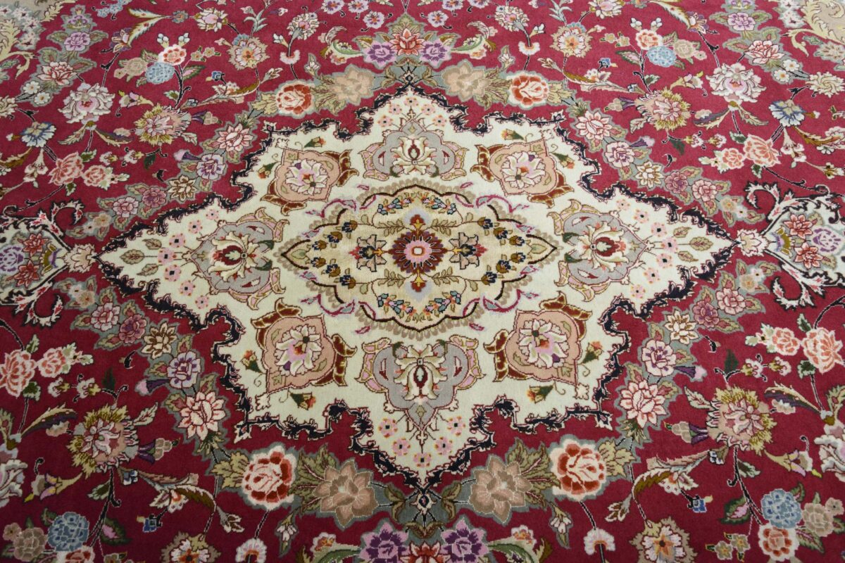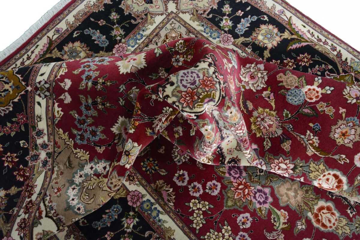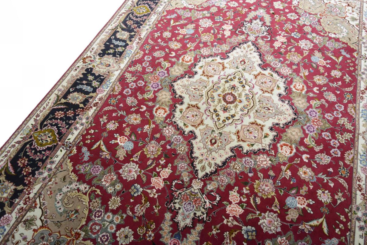Für die besondere Eleganz des Täbriz-Flors sorgen hervorragende Materialien wie samtig anmutende Korkwolle und glänzende Seidenfäden. Die Knüpfqualität eines Täbriz-Teppichs lässt sich aus der angegebenen Raj-Zahl erschließen – je höher diese ausfällt, umso feiner ist die Knüpfdichte, die eine Million und mehr Knoten pro Quadratmeter erreichen kann. Bei besonders feingeknüpften Qualitäten kommt für die Kette statt des üblichen Baumwollgarns sogar Seide zum Einsatz.