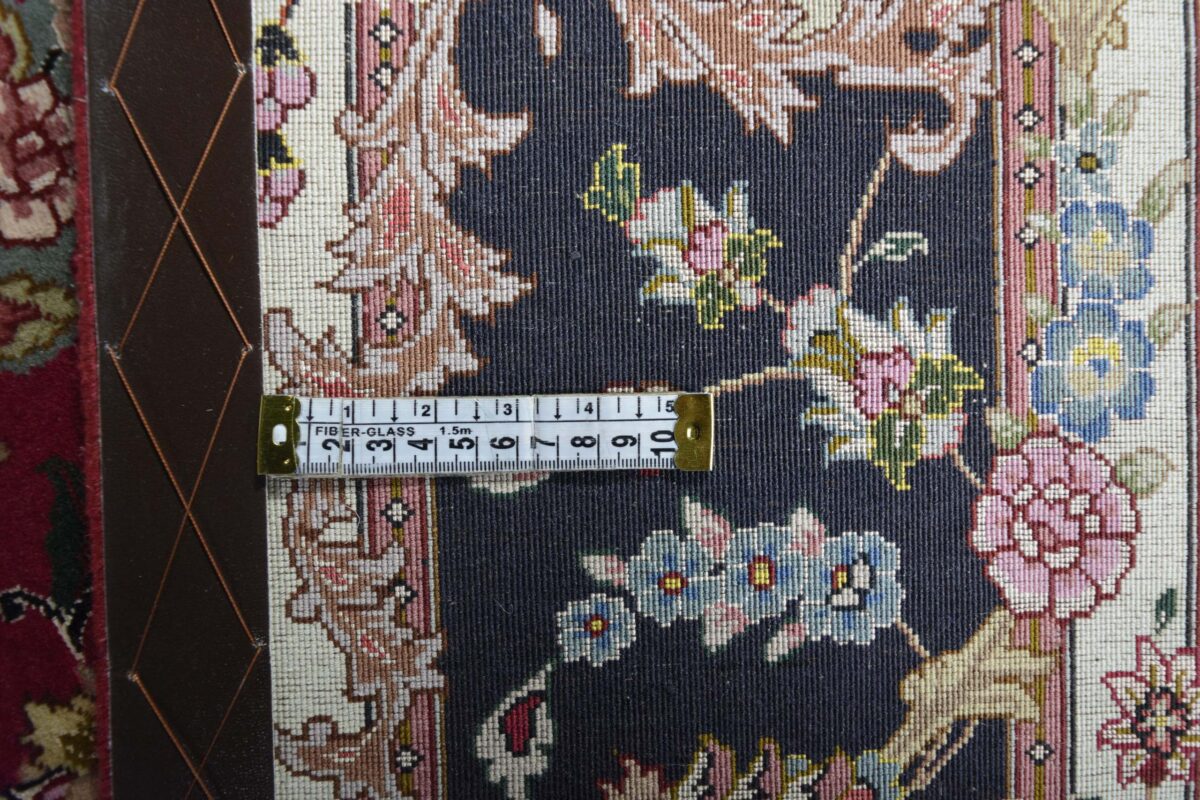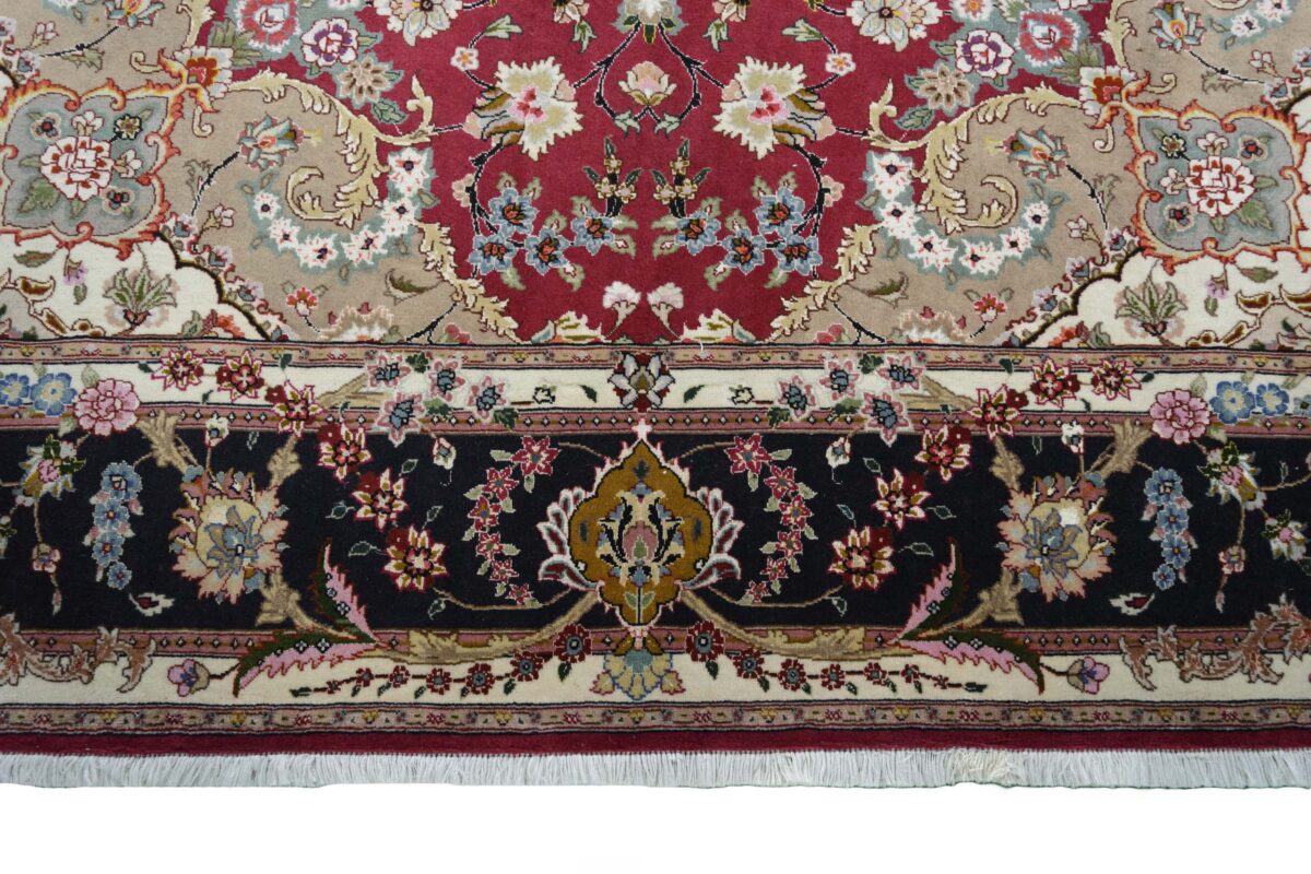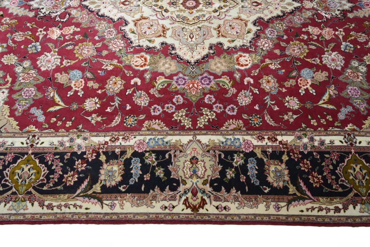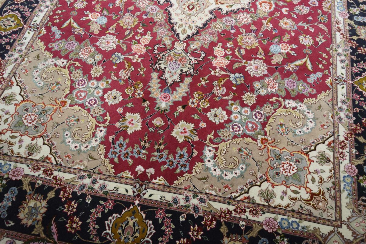 Für die besondere Eleganz des Täbriz-Flors sorgen hervorragende Materialien wie samtig anmutende Korkwolle und glänzende Seidenfäden. Die Knüpfqualität eines Täbriz-Teppichs lässt sich aus der angegebenen Raj-Zahl erschließen – je höher diese ausfällt, umso feiner ist die Knüpfdichte, die eine Million und mehr Knoten pro Quadratmeter erreichen kann. Bei besonders feingeknüpften Qualitäten kommt für die Kette statt des üblichen Baumwollgarns sogar Seide zum Einsatz.