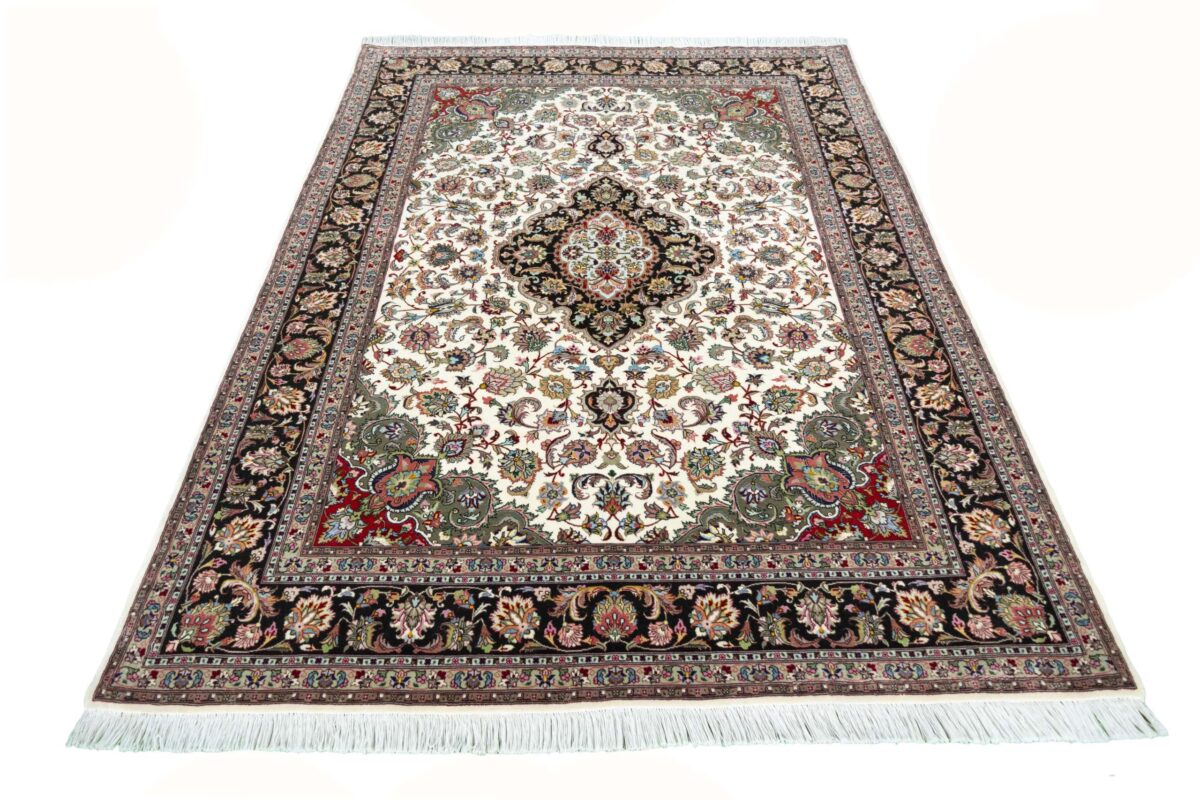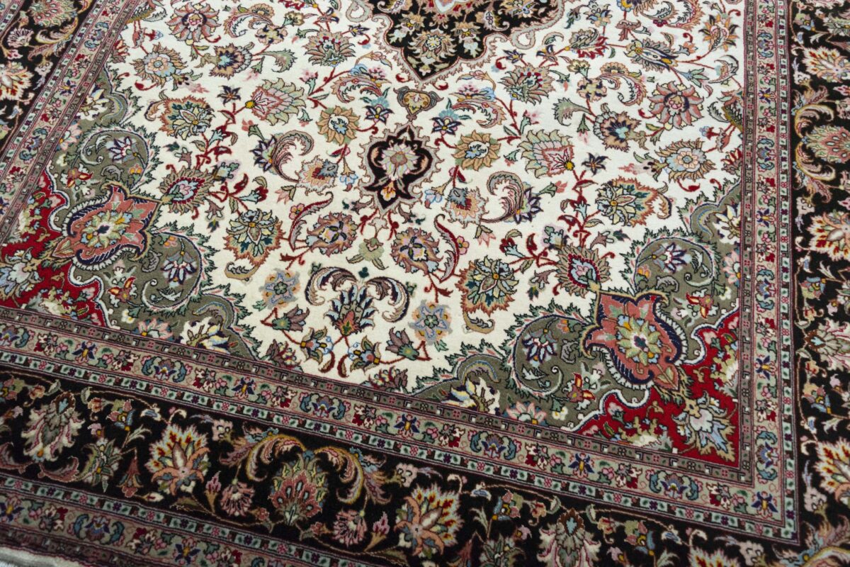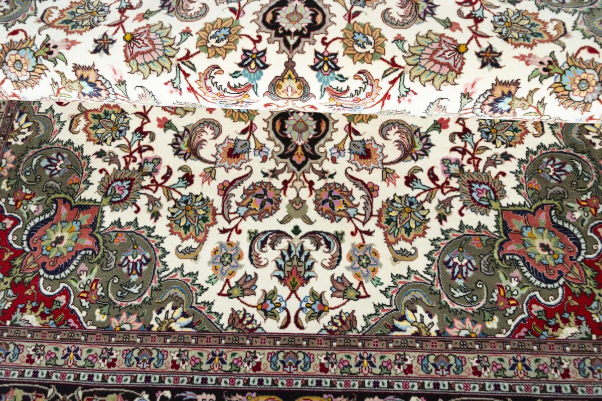 Für die besondere Eleganz des Täbriz-Flors sorgen hervorragende Materialien wie samtig anmutende Korkwolle und glänzende Seidenfäden. Die Knüpfqualität eines Täbriz-Teppichs lässt sich aus der angegebenen Raj-Zahl erschließen – je höher diese ausfällt, umso feiner ist die Knüpfdichte, die eine Million und mehr Knoten pro Quadratmeter erreichen kann. Bei besonders feingeknüpften Qualitäten kommt für die Kette statt des üblichen Baumwollgarns sogar Seide zum Einsatz.