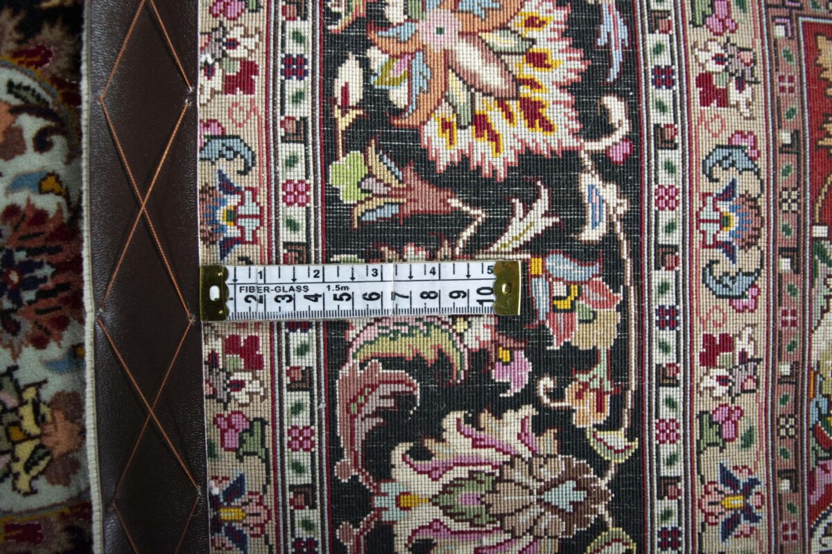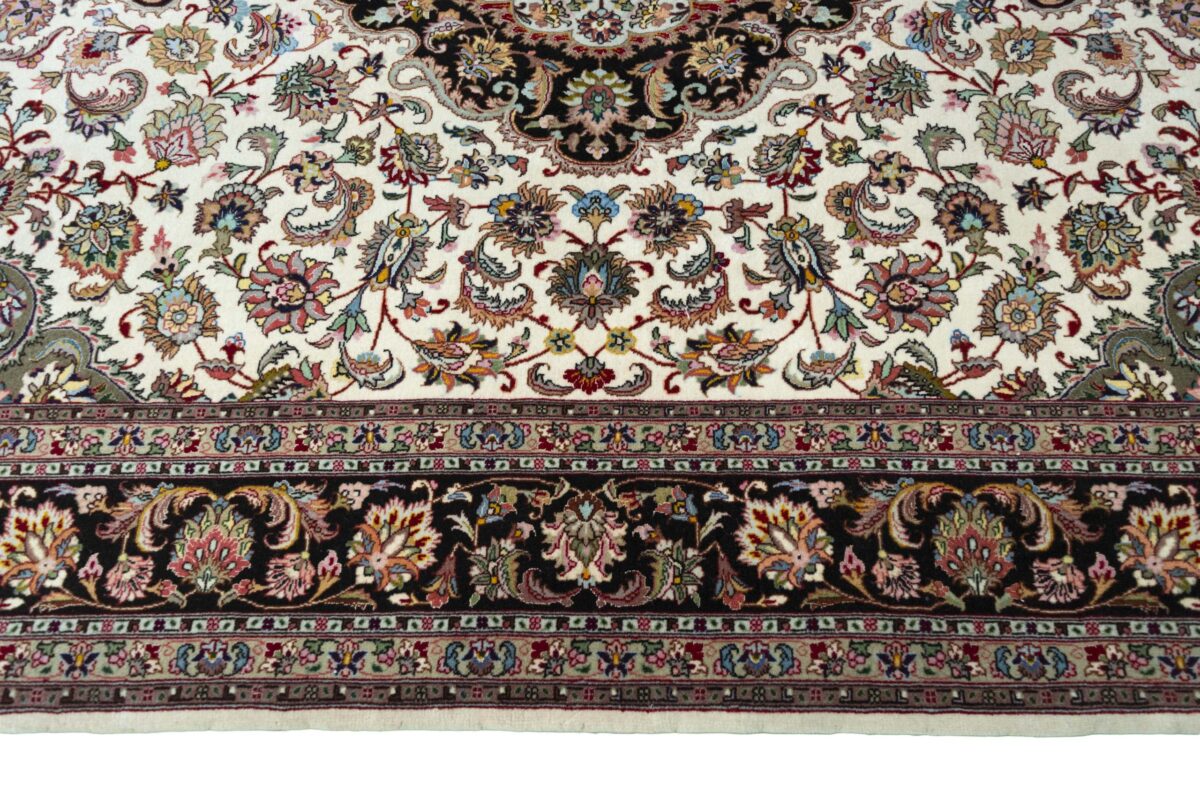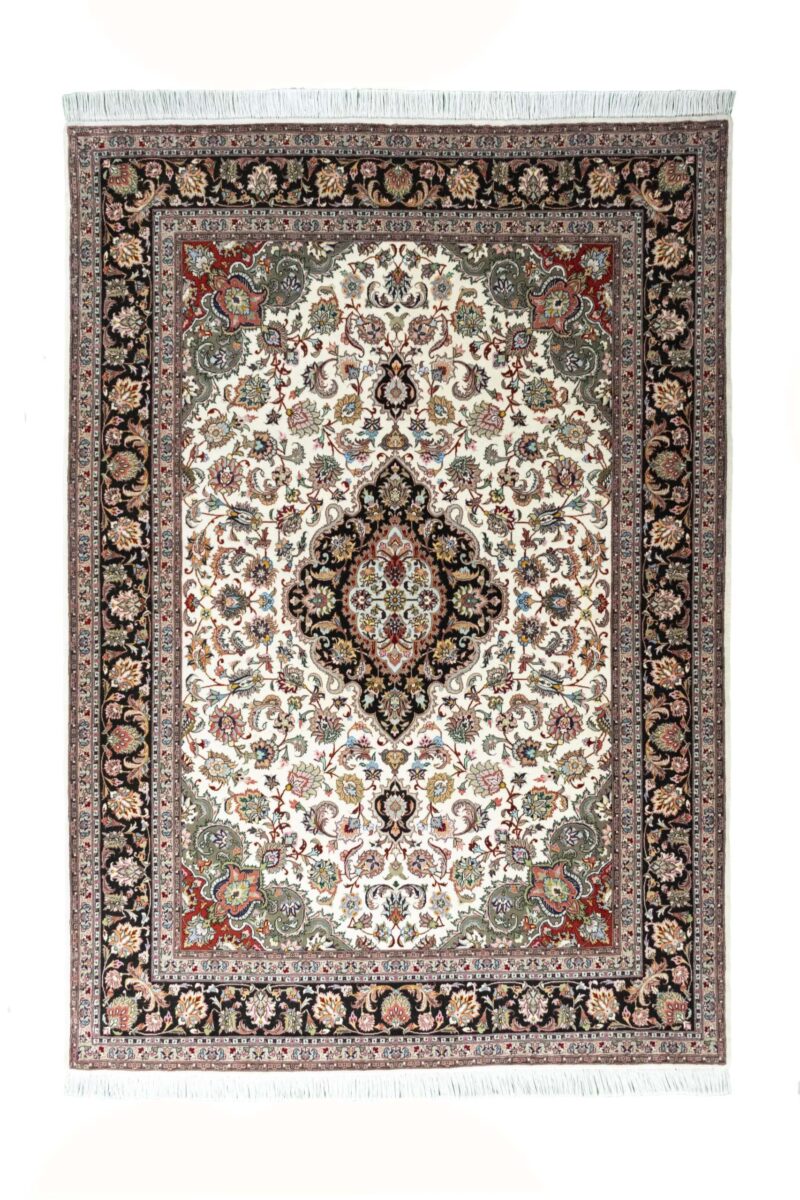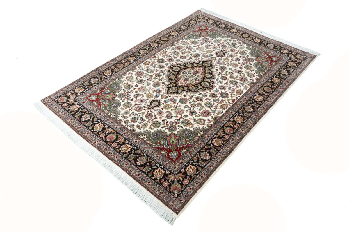 Für die besondere Eleganz des Täbriz-Flors sorgen hervorragende Materialien wie samtig anmutende Korkwolle und glänzende Seidenfäden. Die Knüpfqualität eines Täbriz-Teppichs lässt sich aus der angegebenen Raj-Zahl erschließen – je höher diese ausfällt, umso feiner ist die Knüpfdichte, die eine Million und mehr Knoten pro Quadratmeter erreichen kann. Bei besonders feingeknüpften Qualitäten kommt für die Kette statt des üblichen Baumwollgarns sogar Seide zum Einsatz.
