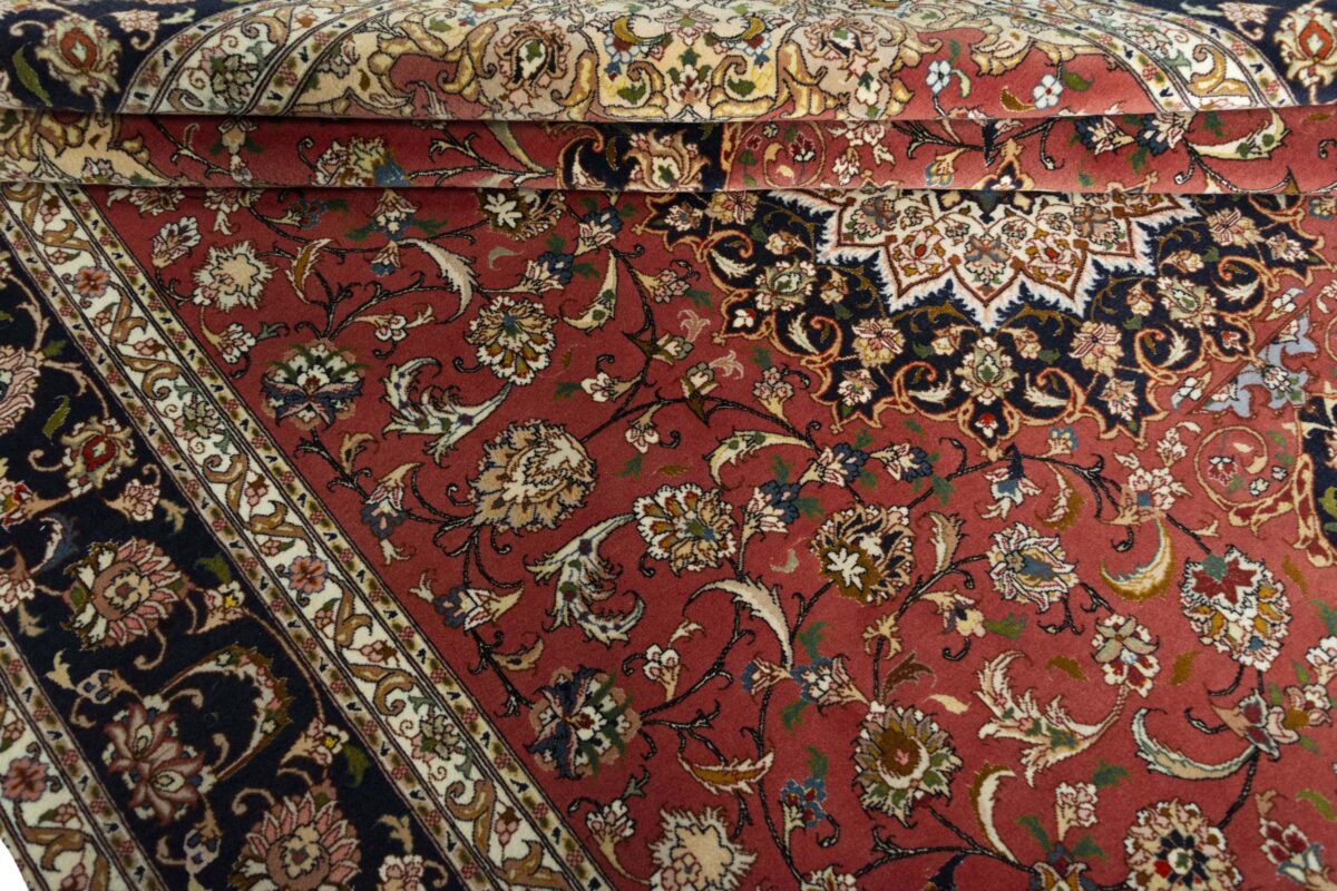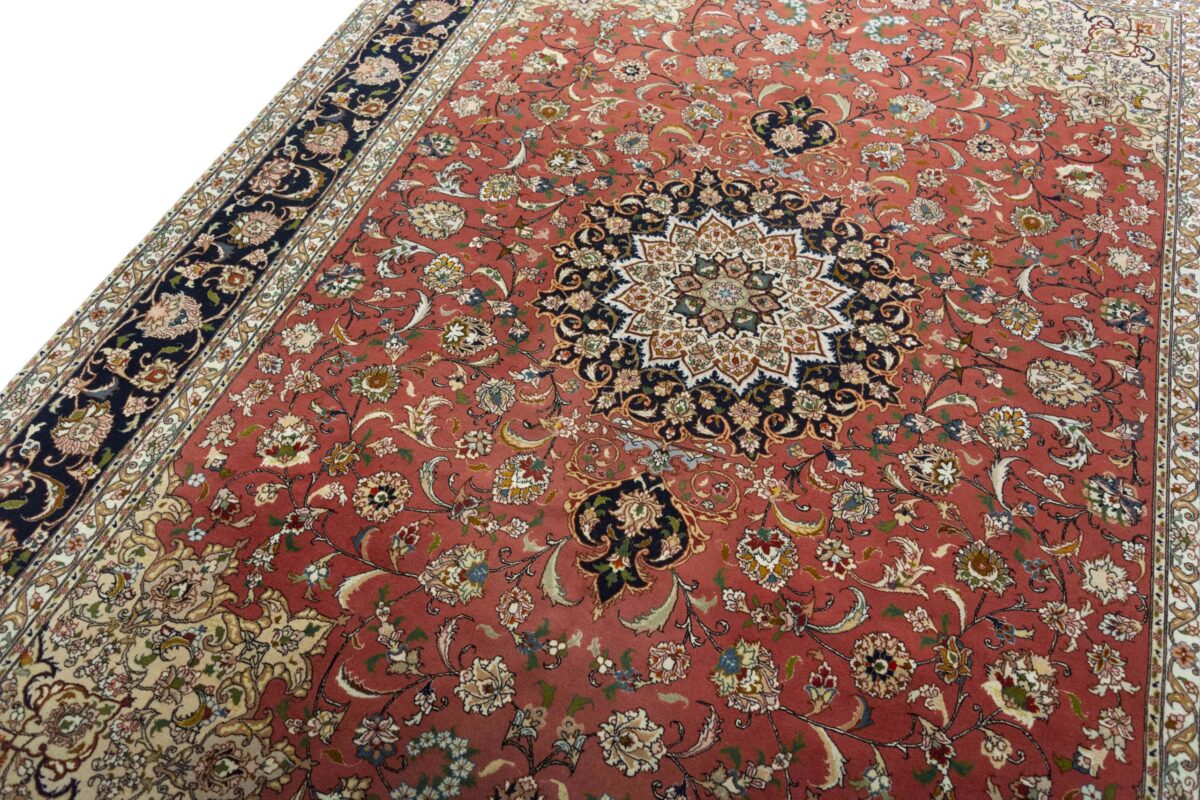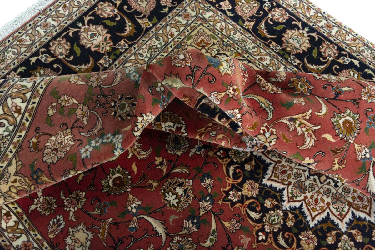 Für die besondere Eleganz des Täbriz-Flors sorgen hervorragende Materialien wie samtig anmutende Korkwolle und glänzende Seidenfäden. Die Knüpfqualität eines Täbriz-Teppichs lässt sich aus der angegebenen Raj-Zahl erschließen – je höher diese ausfällt, umso feiner ist die Knüpfdichte, die eine Million und mehr Knoten pro Quadratmeter erreichen kann. Bei besonders feingeknüpften Qualitäten kommt für die Kette statt des üblichen Baumwollgarns sogar Seide zum Einsatz.