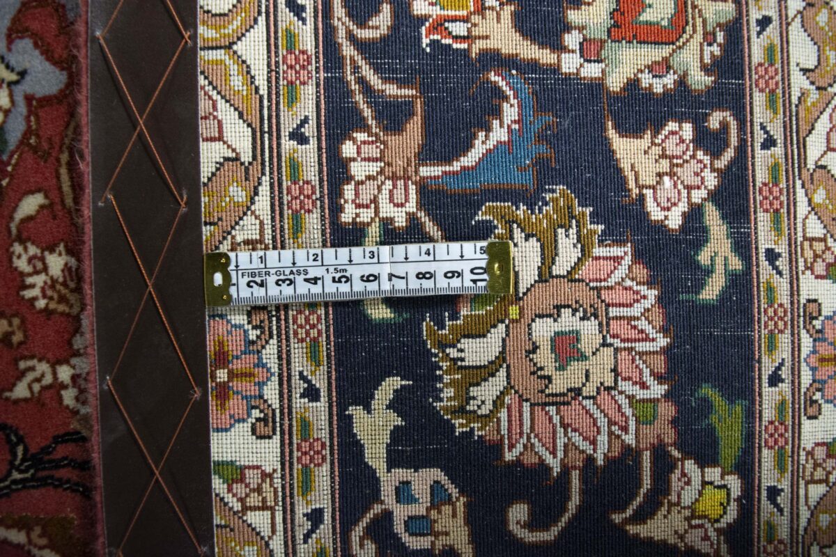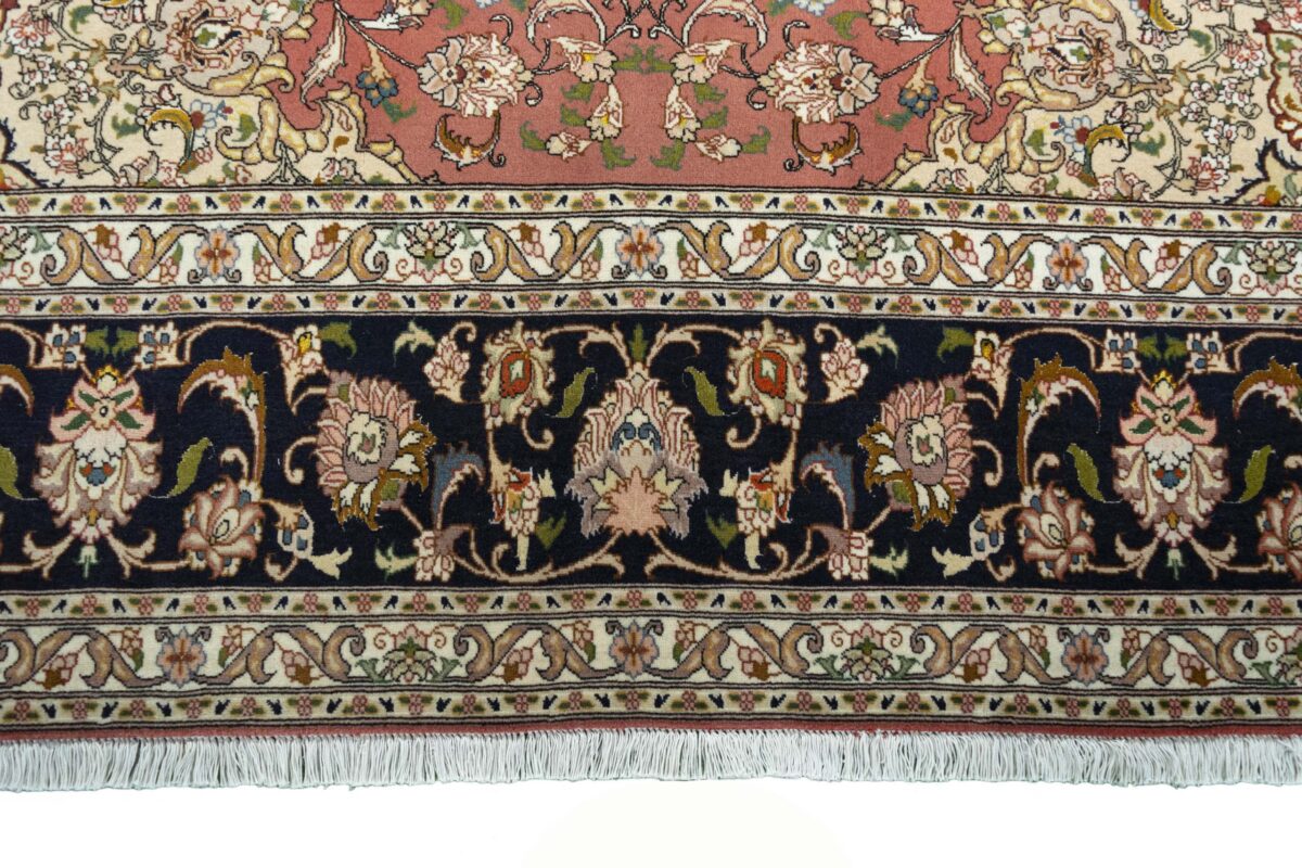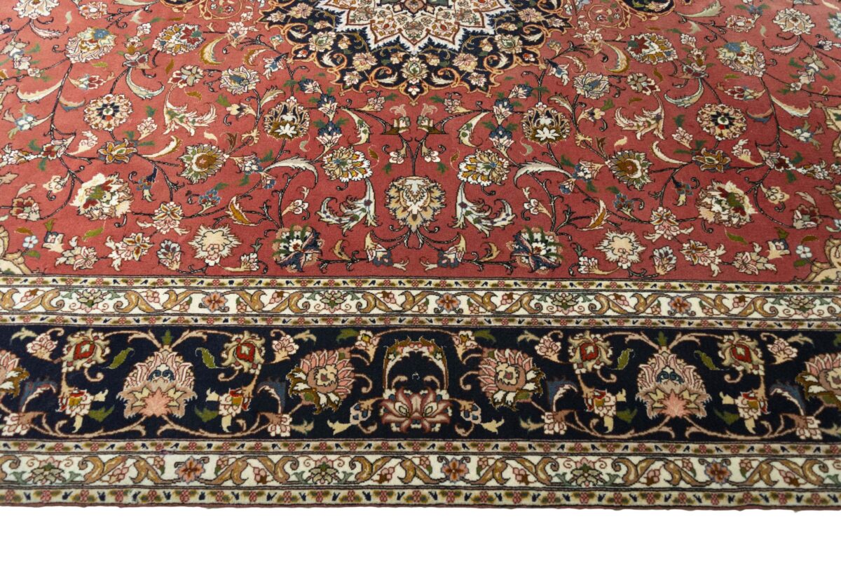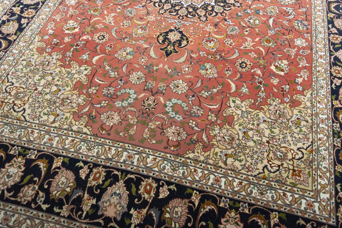Für die besondere Eleganz des Täbriz-Flors sorgen hervorragende Materialien wie samtig anmutende Korkwolle und glänzende Seidenfäden. Die Knüpfqualität eines Täbriz-Teppichs lässt sich aus der angegebenen Raj-Zahl erschließen – je höher diese ausfällt, umso feiner ist die Knüpfdichte, die eine Million und mehr Knoten pro Quadratmeter erreichen kann. Bei besonders feingeknüpften Qualitäten kommt für die Kette statt des üblichen Baumwollgarns sogar Seide zum Einsatz.