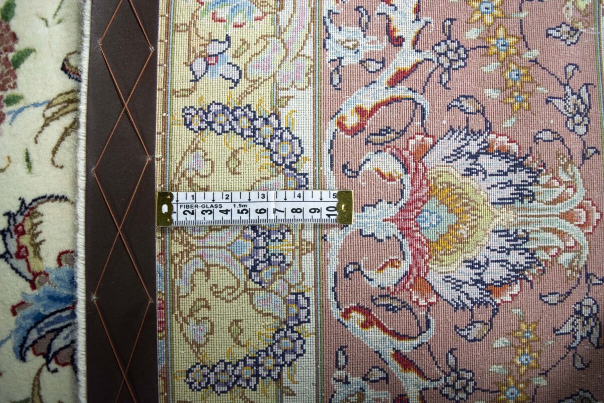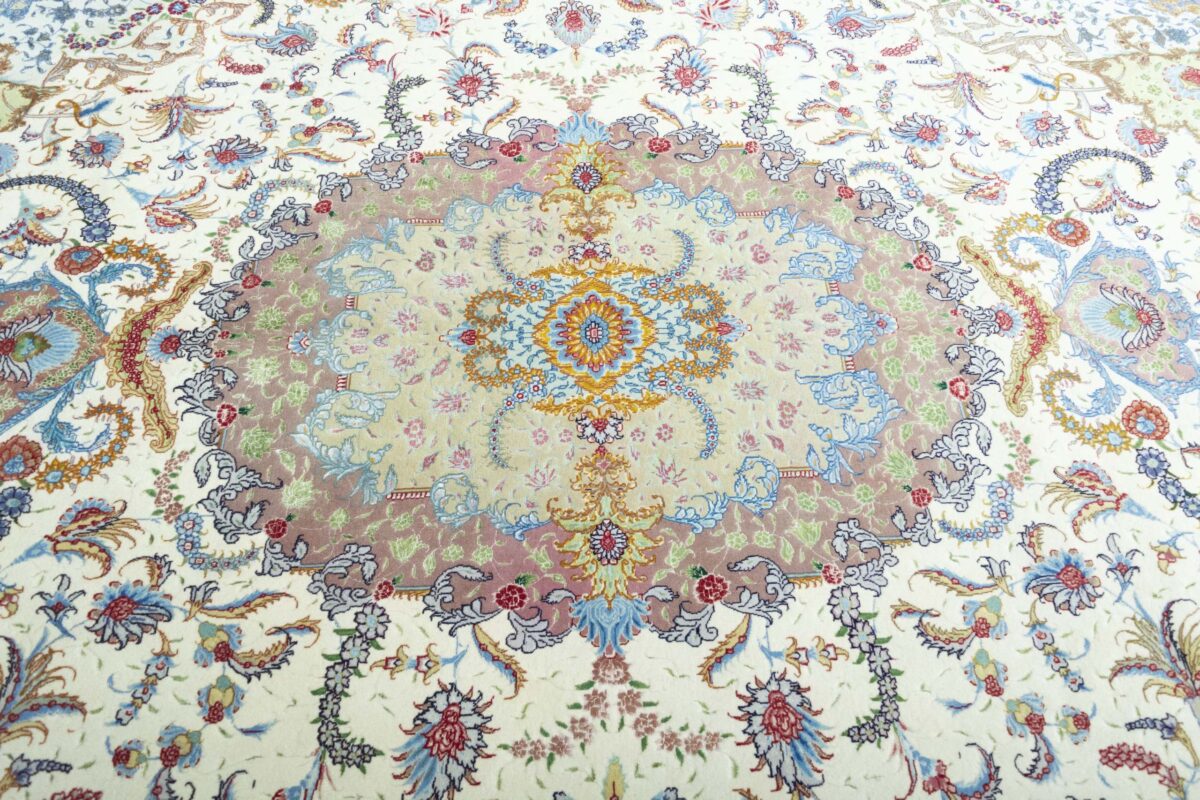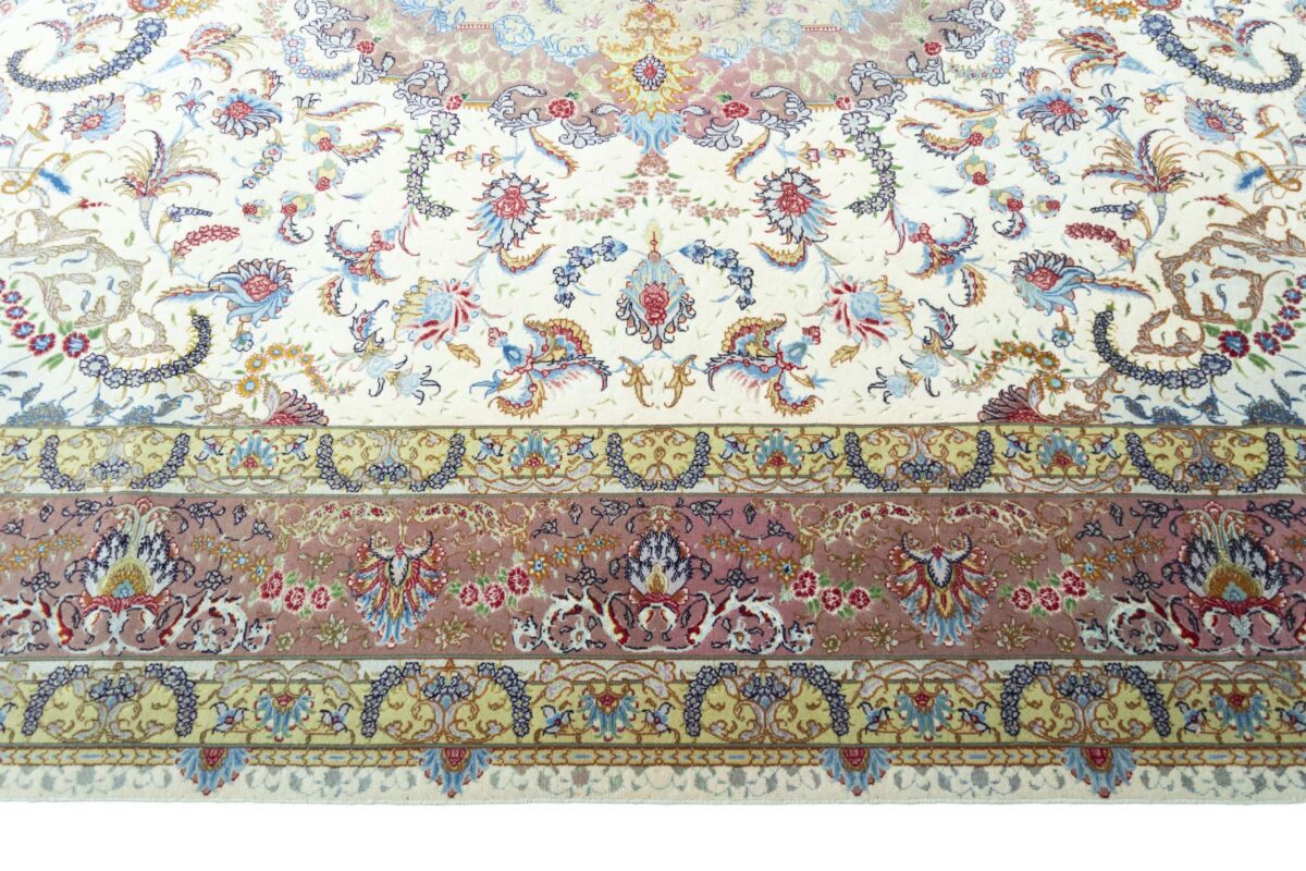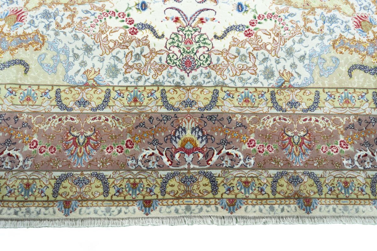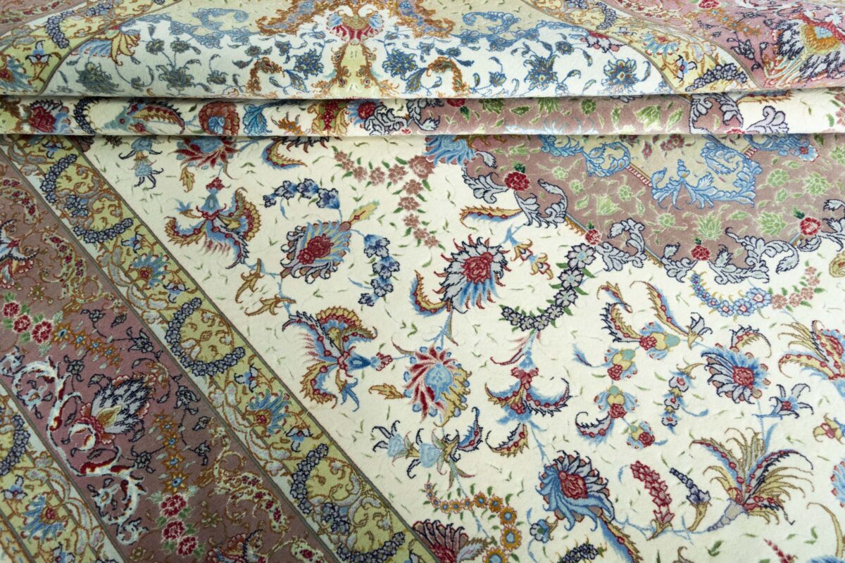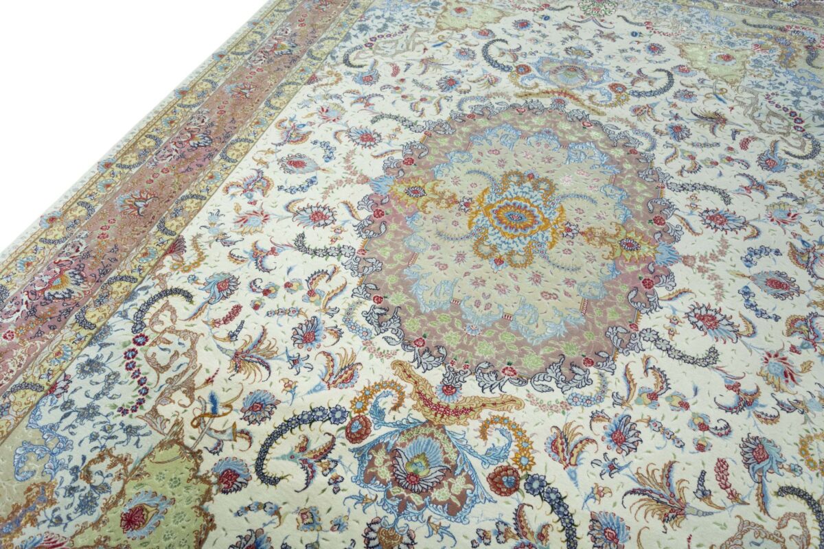 Für die besondere Eleganz des Täbriz-Flors sorgen hervorragende Materialien wie samtig anmutende Korkwolle und glänzende Seidenfäden. Die Knüpfqualität eines Täbriz-Teppichs lässt sich aus der angegebenen Raj-Zahl erschließen – je höher diese ausfällt, umso feiner ist die Knüpfdichte, die eine Million und mehr Knoten pro Quadratmeter erreichen kann. Bei besonders feingeknüpften Qualitäten kommt für die Kette statt des üblichen Baumwollgarns sogar Seide zum Einsatz.