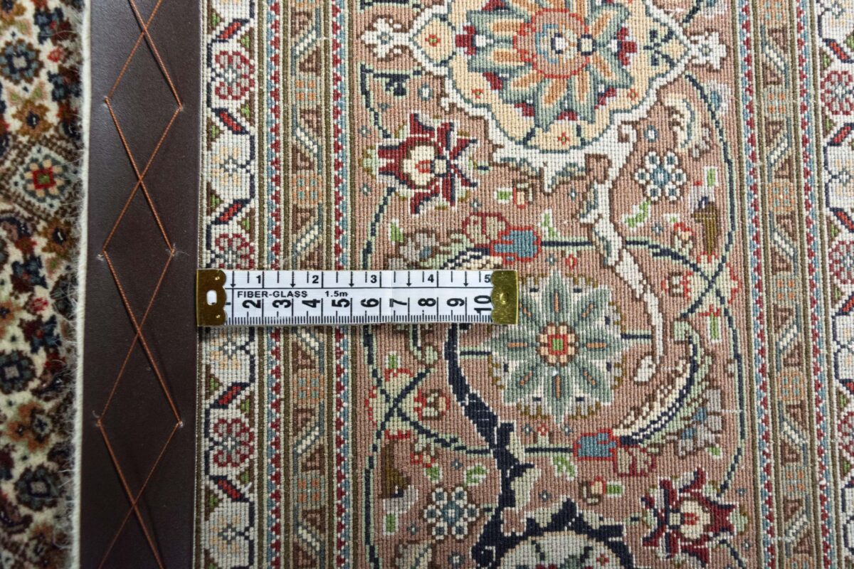 Für die besondere Eleganz des Täbriz-Flors sorgen hervorragende Materialien wie samtig anmutende Korkwolle und glänzende Seidenfäden. Die Knüpfqualität eines Täbriz-Teppichs lässt sich aus der angegebenen Raj-Zahl erschließen – je höher diese ausfällt, umso feiner ist die Knüpfdichte, die eine Million und mehr Knoten pro Quadratmeter erreichen kann. Bei besonders feingeknüpften Qualitäten kommt für die Kette statt des üblichen Baumwollgarns sogar Seide zum Einsatz.