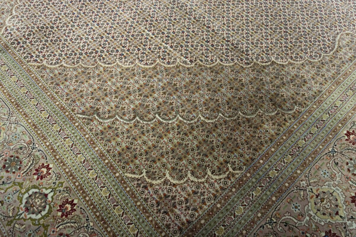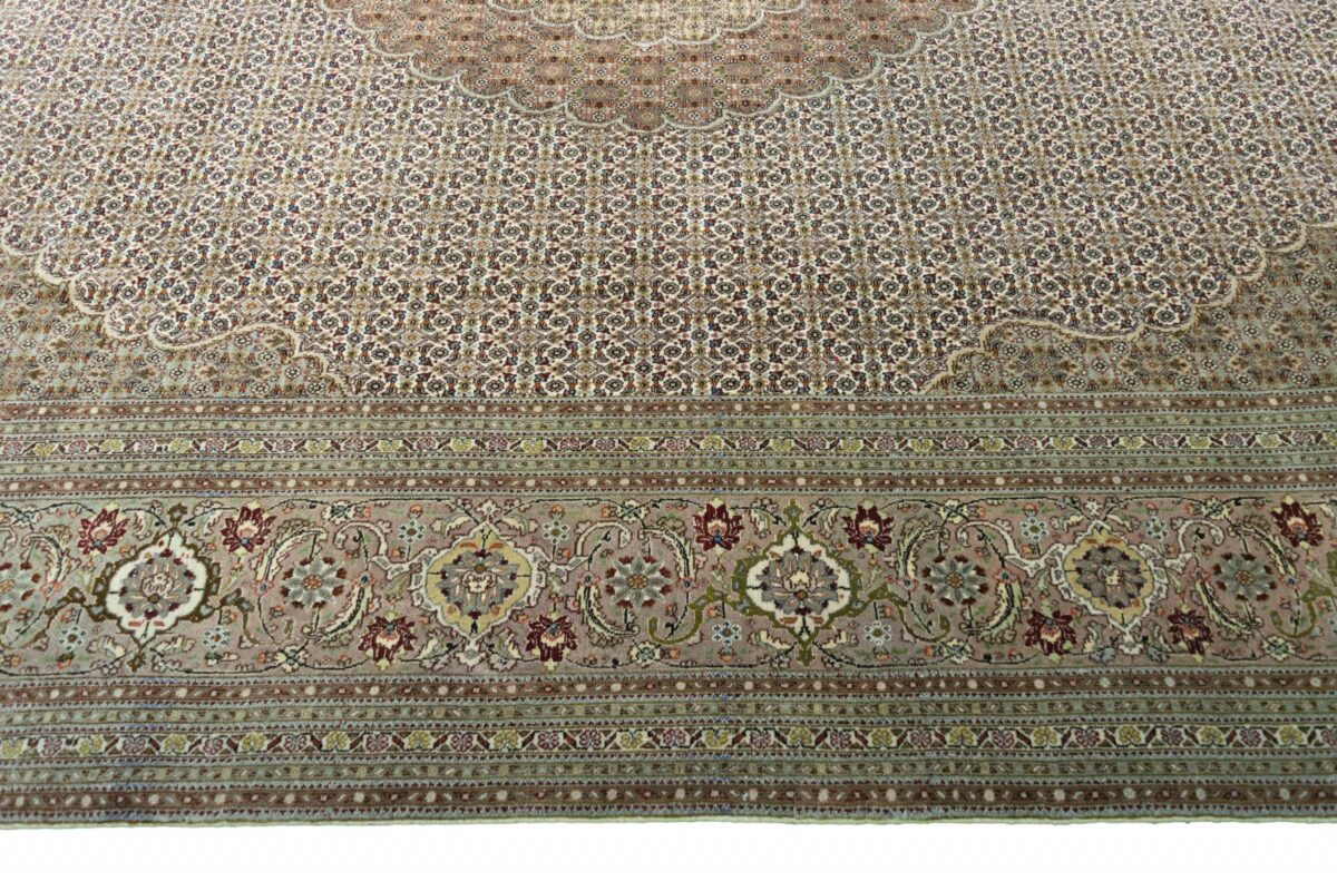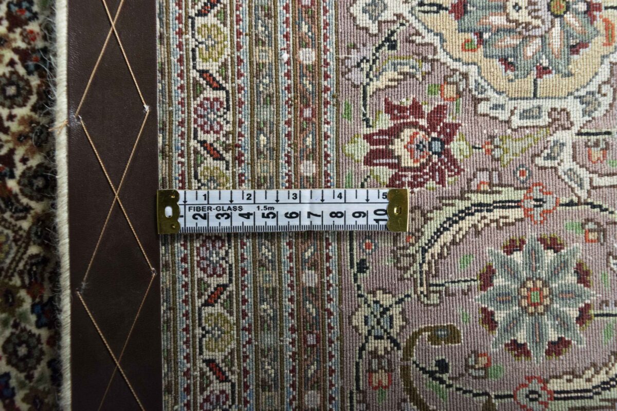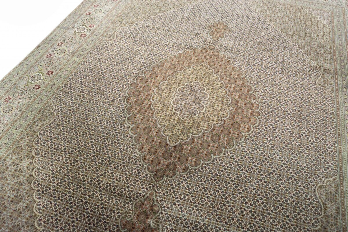 Für die besondere Eleganz des Täbriz-Flors sorgen hervorragende Materialien wie samtig anmutende Korkwolle und glänzende Seidenfäden. Die Knüpfqualität eines Täbriz-Teppichs lässt sich aus der angegebenen Raj-Zahl erschließen – je höher diese ausfällt, umso feiner ist die Knüpfdichte, die eine Million und mehr Knoten pro Quadratmeter erreichen kann. Bei besonders feingeknüpften Qualitäten kommt für die Kette statt des üblichen Baumwollgarns sogar Seide zum Einsatz.