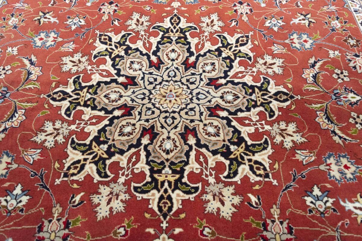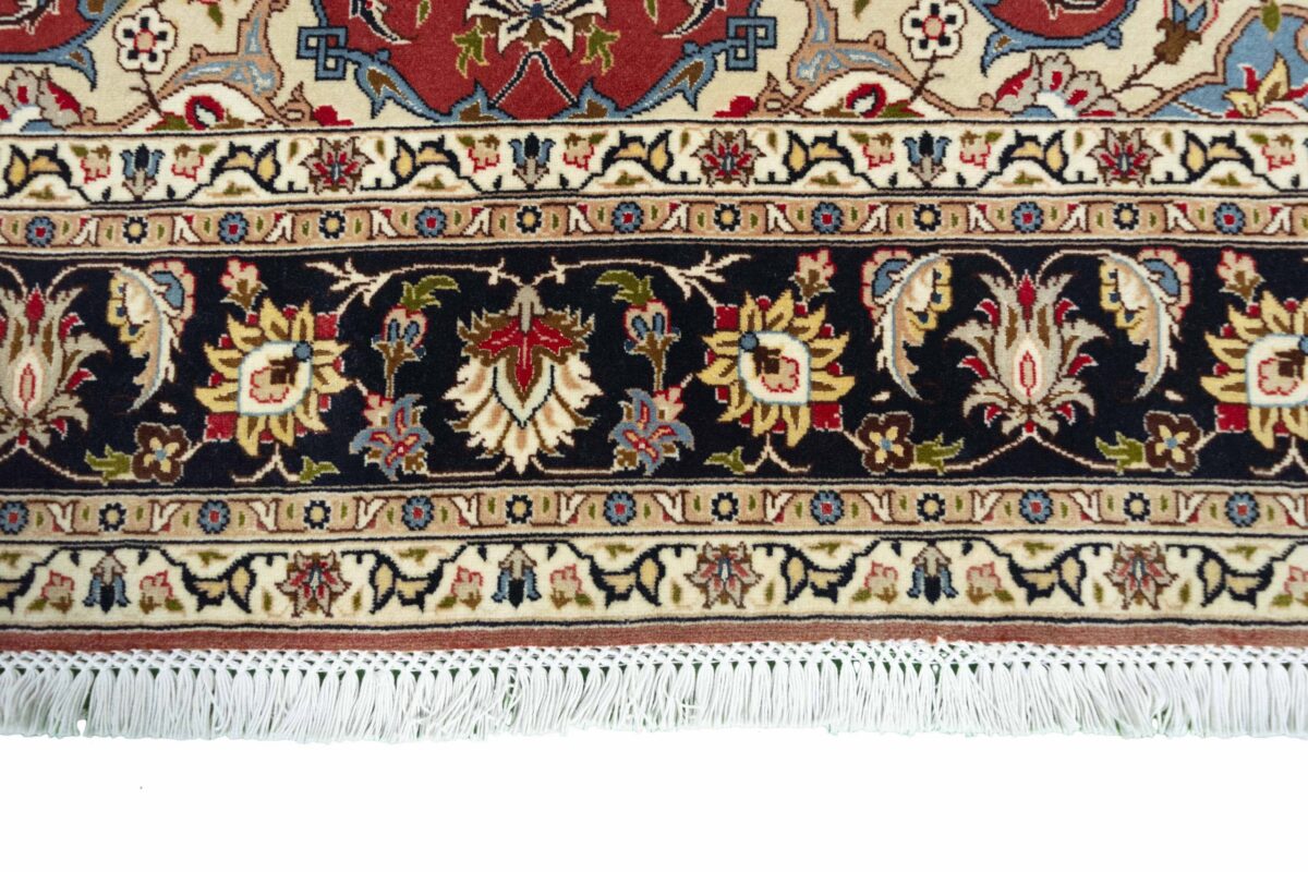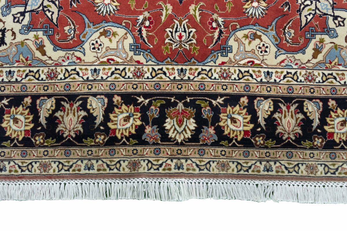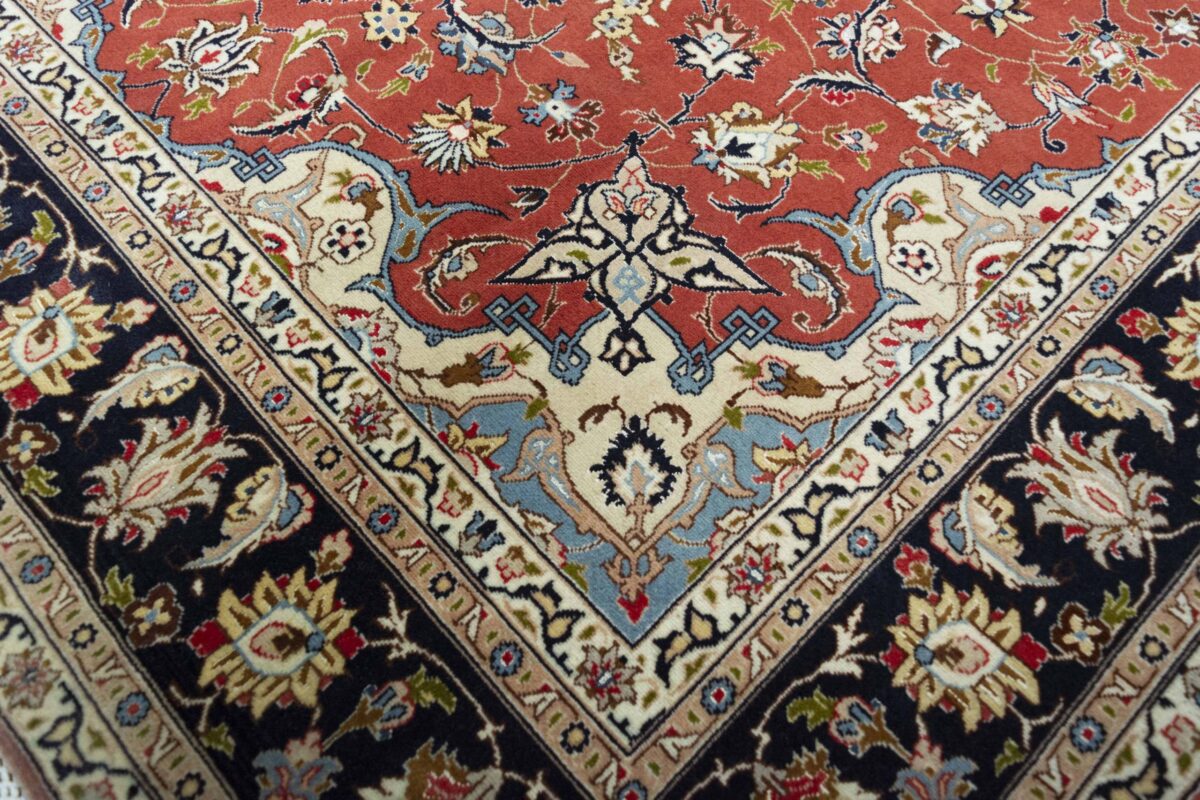 Für die besondere Eleganz des Täbriz-Flors sorgen hervorragende Materialien wie samtig anmutende Korkwolle und glänzende Seidenfäden. Die Knüpfqualität eines Täbriz-Teppichs lässt sich aus der angegebenen Raj-Zahl erschließen – je höher diese ausfällt, umso feiner ist die Knüpfdichte, die eine Million und mehr Knoten pro Quadratmeter erreichen kann. Bei besonders feingeknüpften Qualitäten kommt für die Kette statt des üblichen Baumwollgarns sogar Seide zum Einsatz.