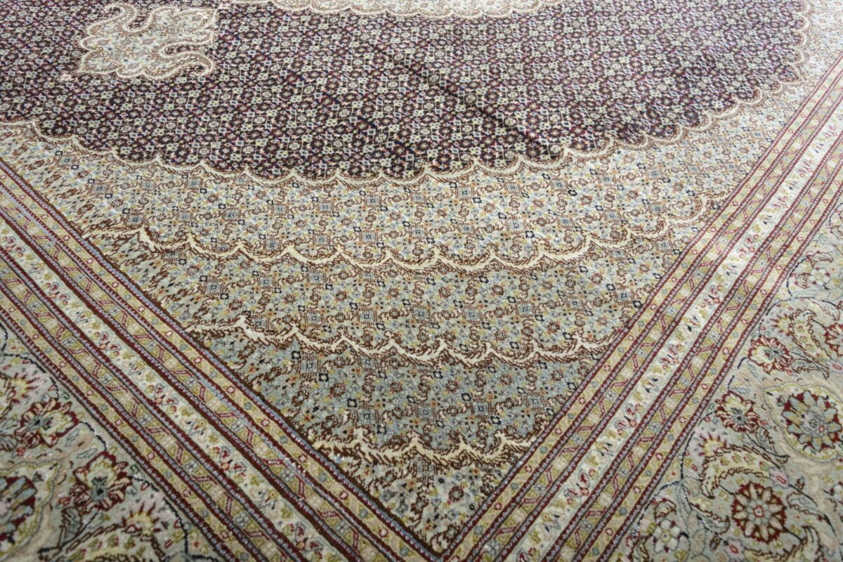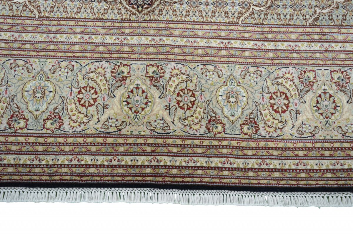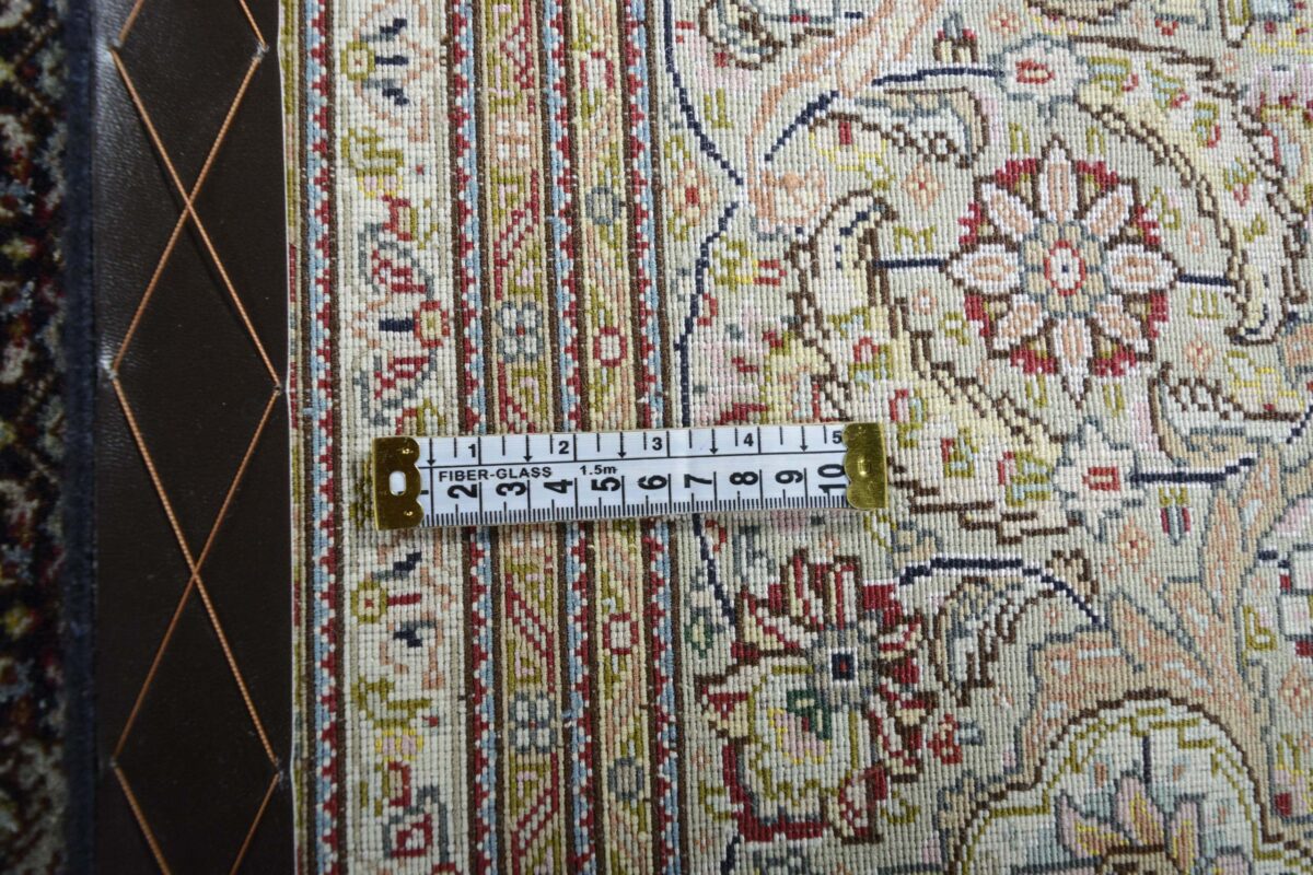 Für die besondere Eleganz des Täbriz-Flors sorgen hervorragende Materialien wie samtig anmutende Korkwolle und glänzende Seidenfäden. Die Knüpfqualität eines Täbriz-Teppichs lässt sich aus der angegebenen Raj-Zahl erschließen – je höher diese ausfällt, umso feiner ist die Knüpfdichte, die eine Million und mehr Knoten pro Quadratmeter erreichen kann. Bei besonders feingeknüpften Qualitäten kommt für die Kette statt des üblichen Baumwollgarns sogar Seide zum Einsatz.