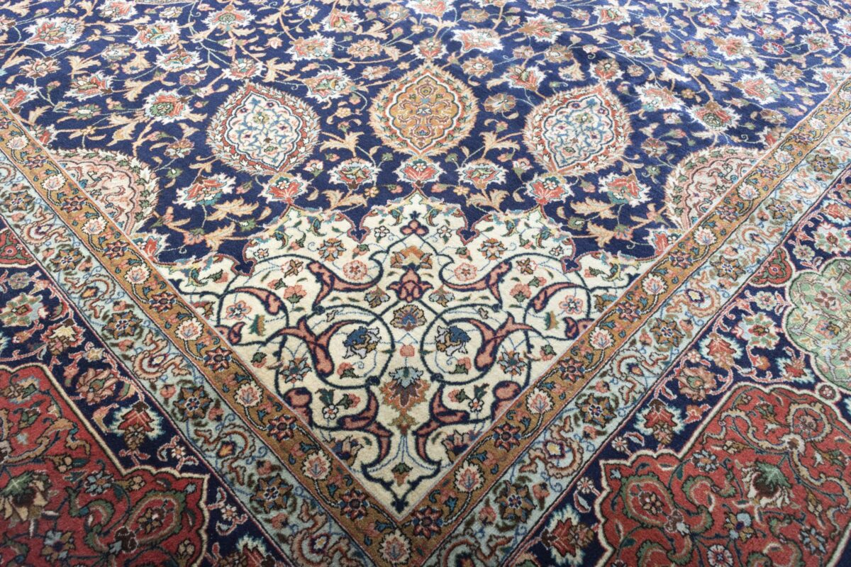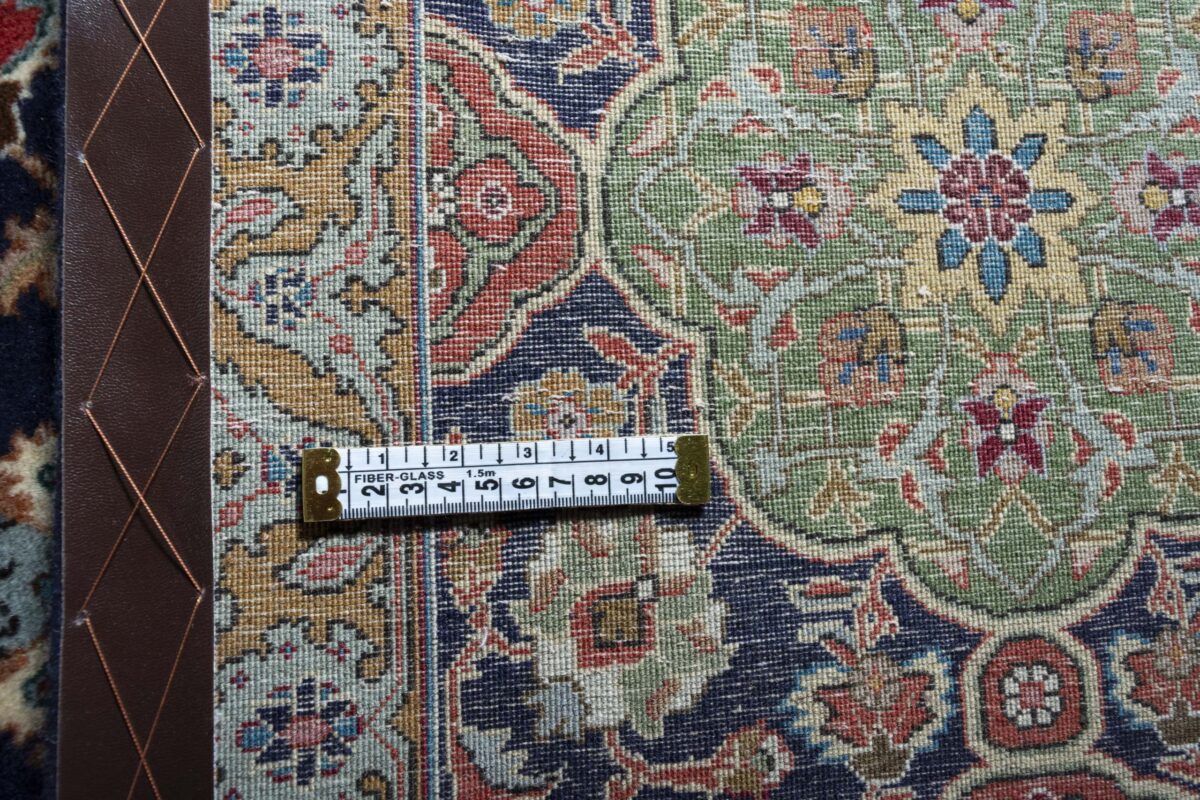 Für die besondere Eleganz des Täbriz-Flors sorgen hervorragende Materialien wie samtig anmutende Korkwolle und glänzende Seidenfäden. Die Knüpfqualität eines Täbriz-Teppichs lässt sich aus der angegebenen Raj-Zahl erschließen – je höher diese ausfällt, umso feiner ist die Knüpfdichte, die eine Million und mehr Knoten pro Quadratmeter erreichen kann. Bei besonders feingeknüpften Qualitäten kommt für die Kette statt des üblichen Baumwollgarns sogar Seide zum Einsatz.