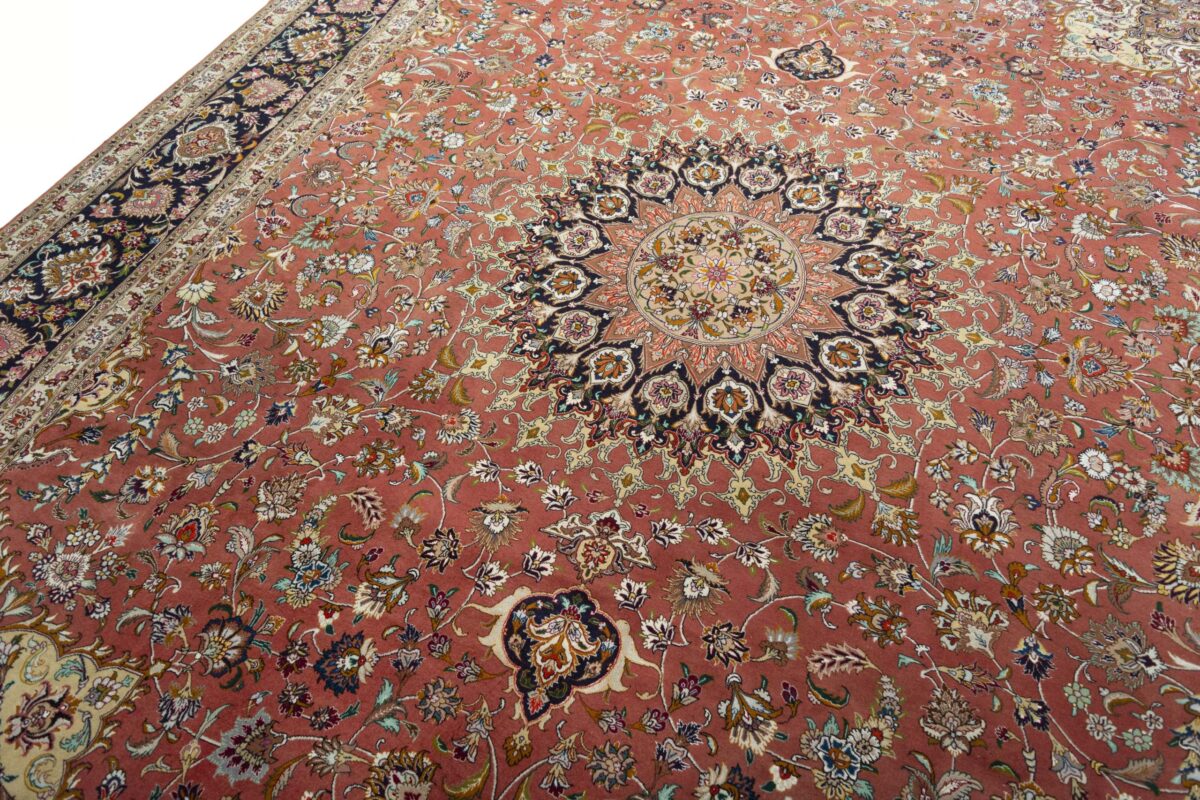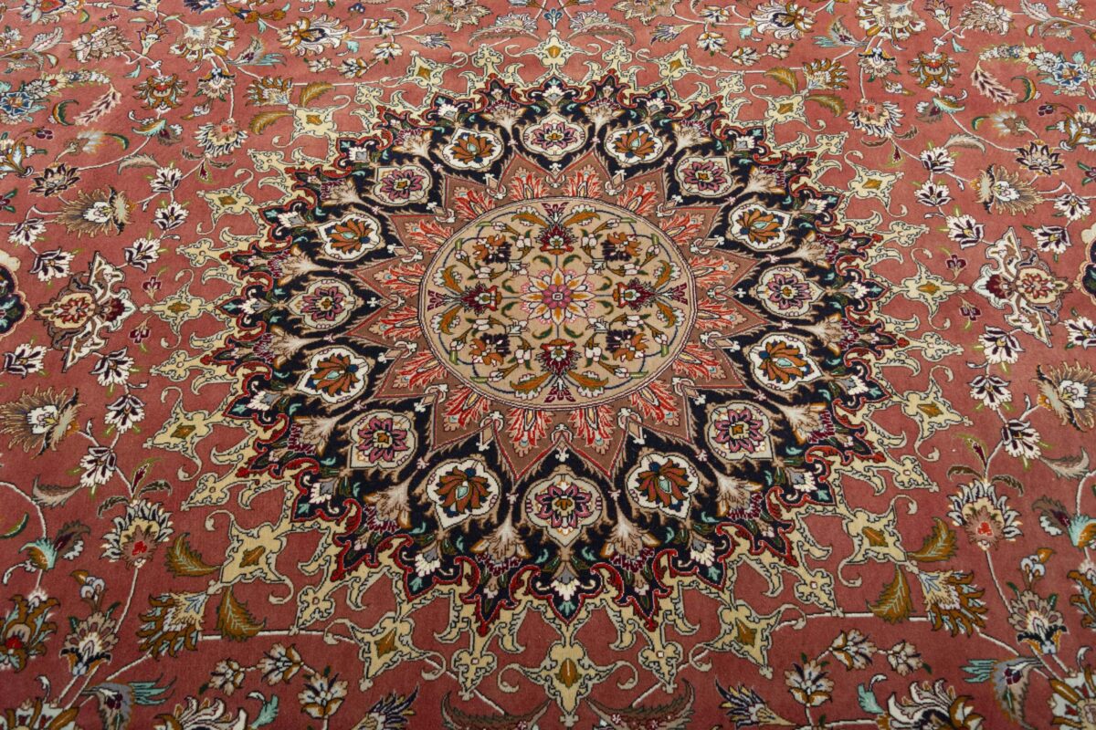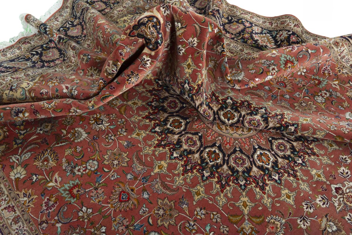 Für die besondere Eleganz des Täbriz-Flors sorgen hervorragende Materialien wie samtig anmutende Korkwolle und glänzende Seidenfäden. Die Knüpfqualität eines Täbriz-Teppichs lässt sich aus der angegebenen Raj-Zahl erschließen – je höher diese ausfällt, umso feiner ist die Knüpfdichte, die eine Million und mehr Knoten pro Quadratmeter erreichen kann. Bei besonders feingeknüpften Qualitäten kommt für die Kette statt des üblichen Baumwollgarns sogar Seide zum Einsatz.