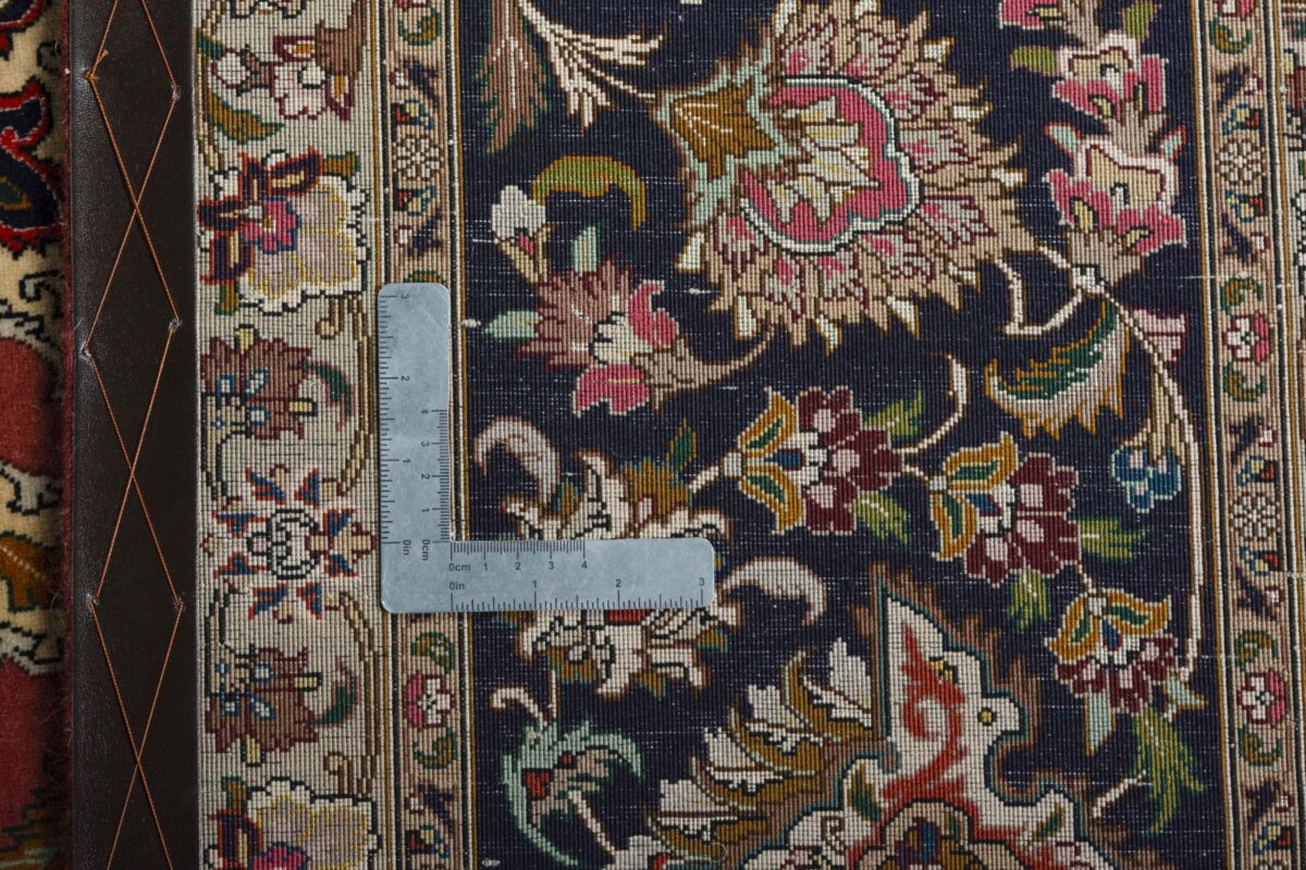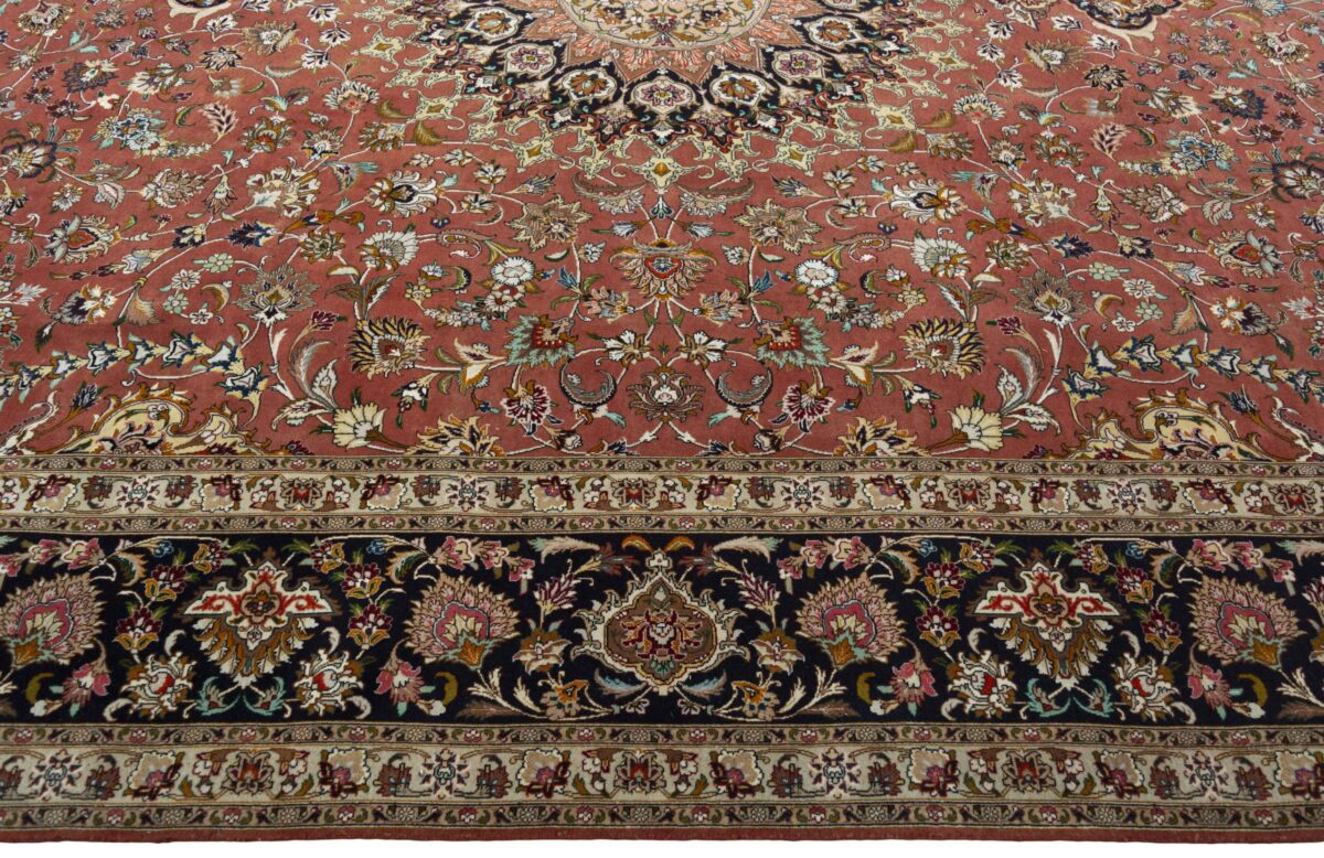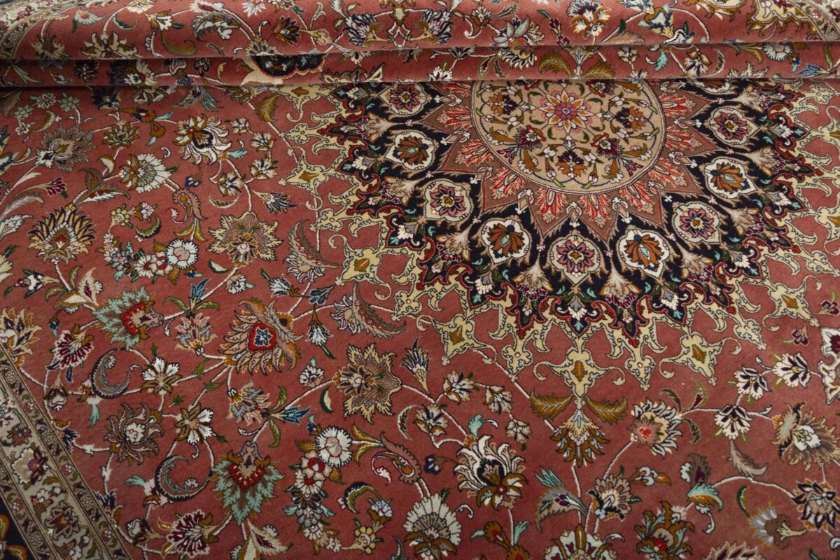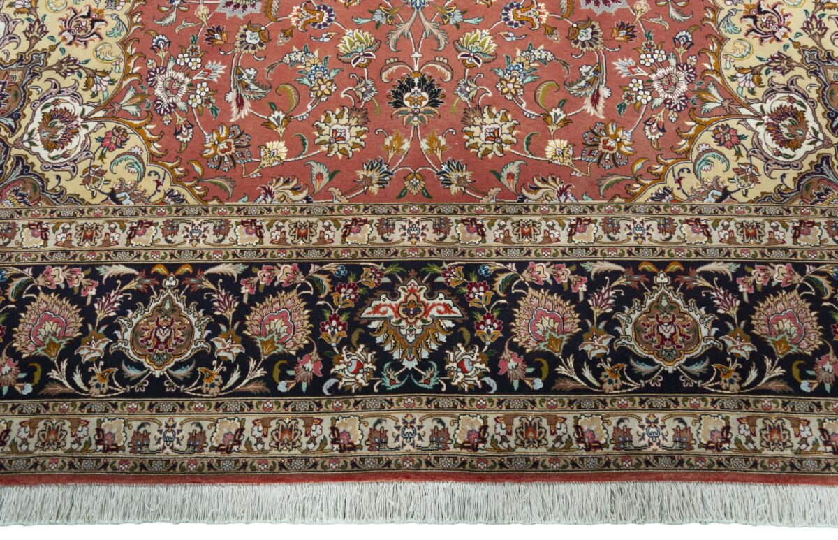 Für die besondere Eleganz des Täbriz-Flors sorgen hervorragende Materialien wie samtig anmutende Korkwolle und glänzende Seidenfäden. Die Knüpfqualität eines Täbriz-Teppichs lässt sich aus der angegebenen Raj-Zahl erschließen – je höher diese ausfällt, umso feiner ist die Knüpfdichte, die eine Million und mehr Knoten pro Quadratmeter erreichen kann. Bei besonders feingeknüpften Qualitäten kommt für die Kette statt des üblichen Baumwollgarns sogar Seide zum Einsatz.